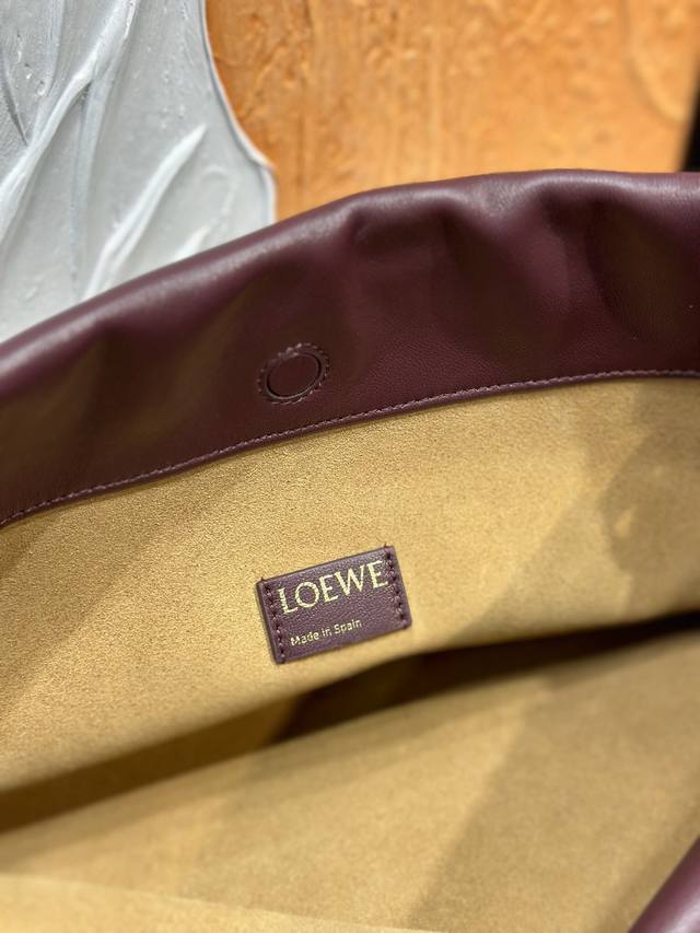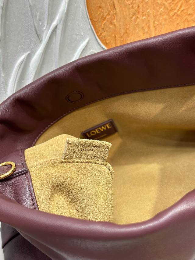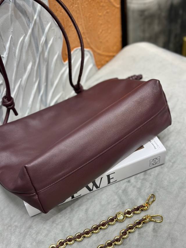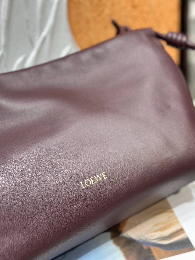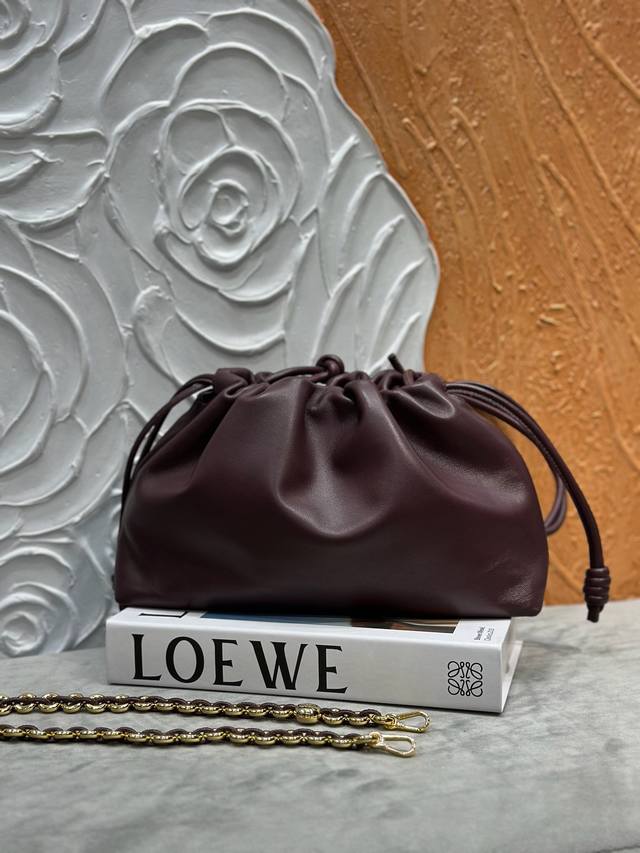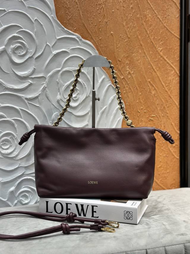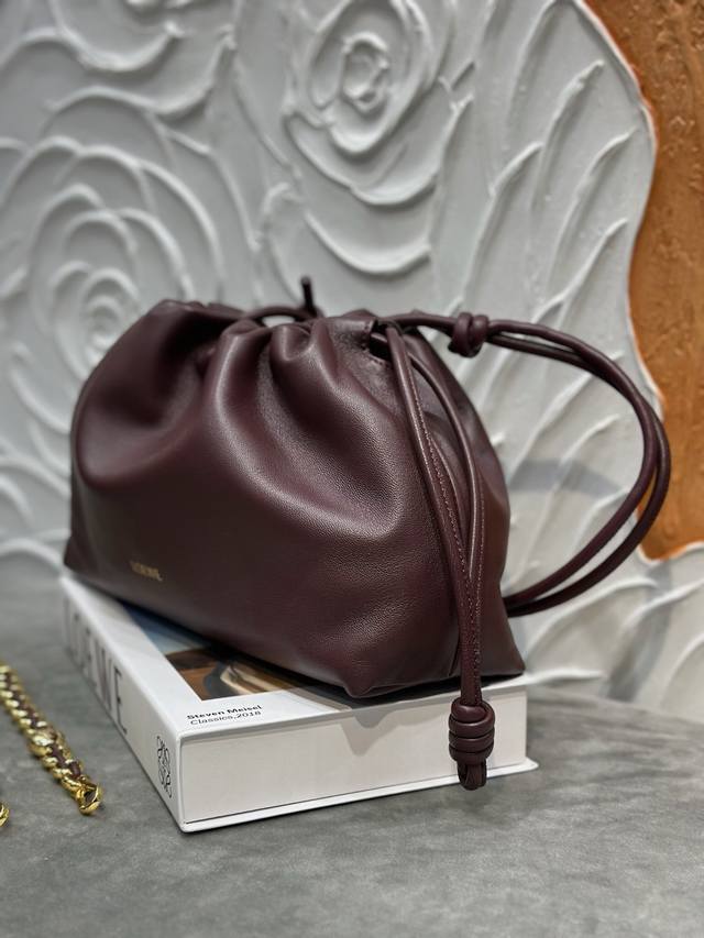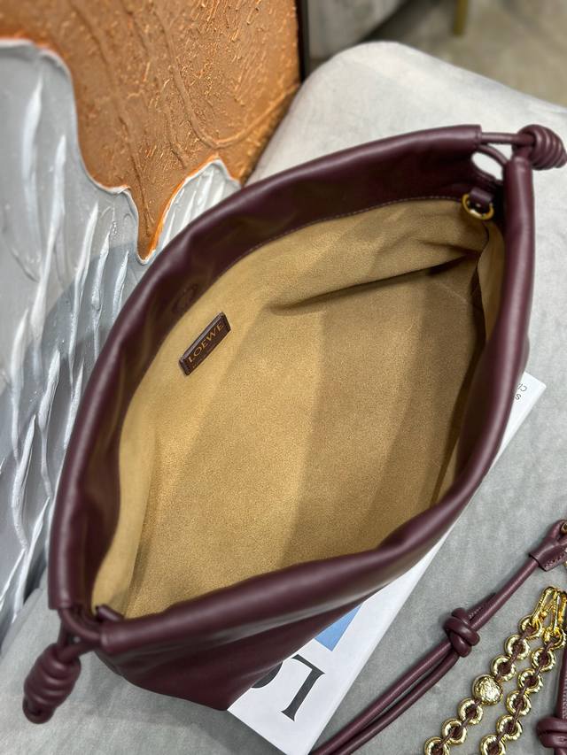 Original Leather Flamenco Purse Medium-Sized Soft Nappa Lamb Leather Clutch in Burgundy. The Flamenco Purse features a pleated design and the signature rope knot on the side. This medium-sized version is crafted from soft Nappa lamb leather. Can be carried on the shoulder, crossbody, or by hand. Detachable and adjustable leather shoulder strap. Detachable donut chain with Anagram Pebble embellishment. Magnetic closure. Suede lining. Loewe gold or silver foil stamping. Model: 1102 800. Dimensions: 30