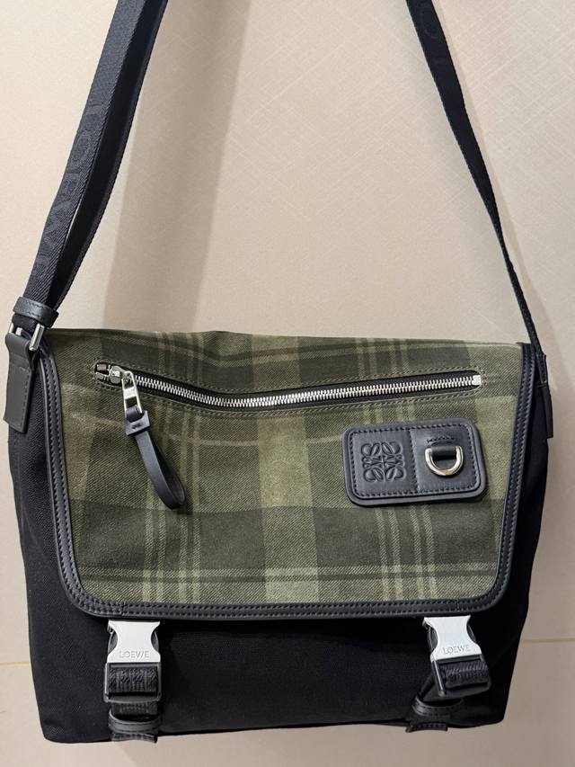Original Leather Medium Flex Canvas and Suede Messenger Bag DDD 36034-1 DDD The Flex messenger bag features a trapezoidal folding flap with refined sporty details. The medium size version is made of twill cotton canvas and suede. DDD Can hold a 13-inch laptop DDD Can be carried on the shoulder or crossbody DDD Adjustable Loewe webbing DDD Snap flap DDD One zippered front pocket, one magnetic snap back pocket DDD One zippered inner pocket DDD Waterproof nylon lining DDD Embossed Anagram with D-ring DDD 38 pocket opening -27 -9.5 DDD