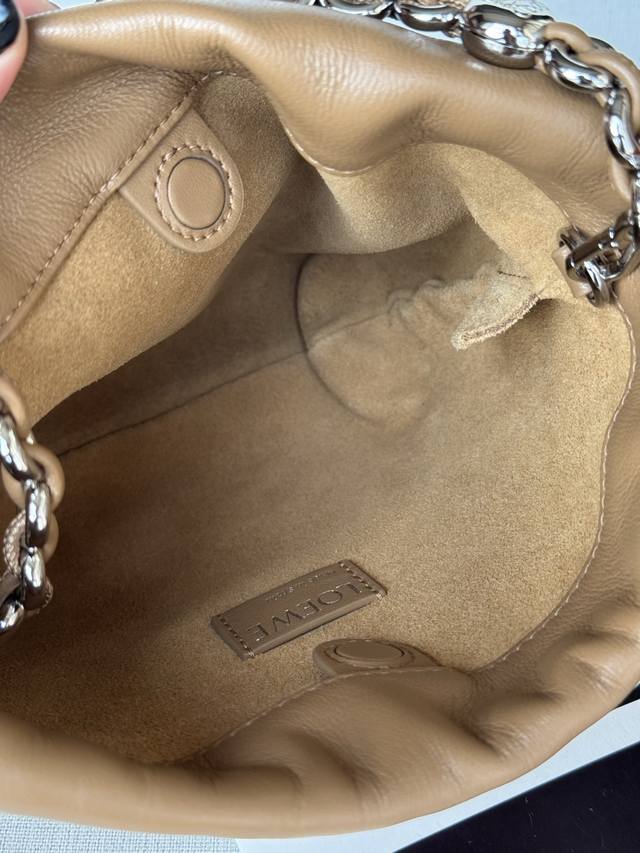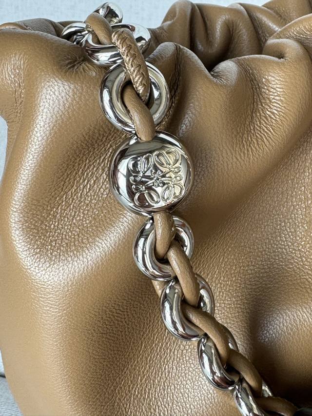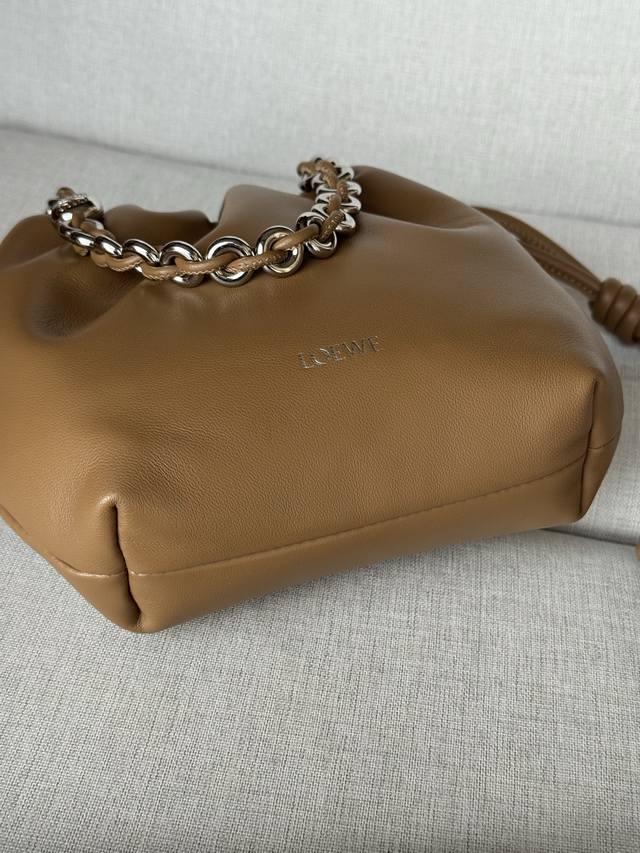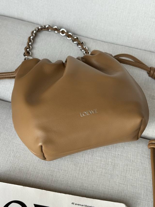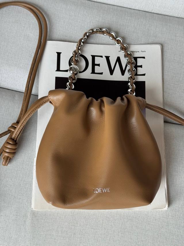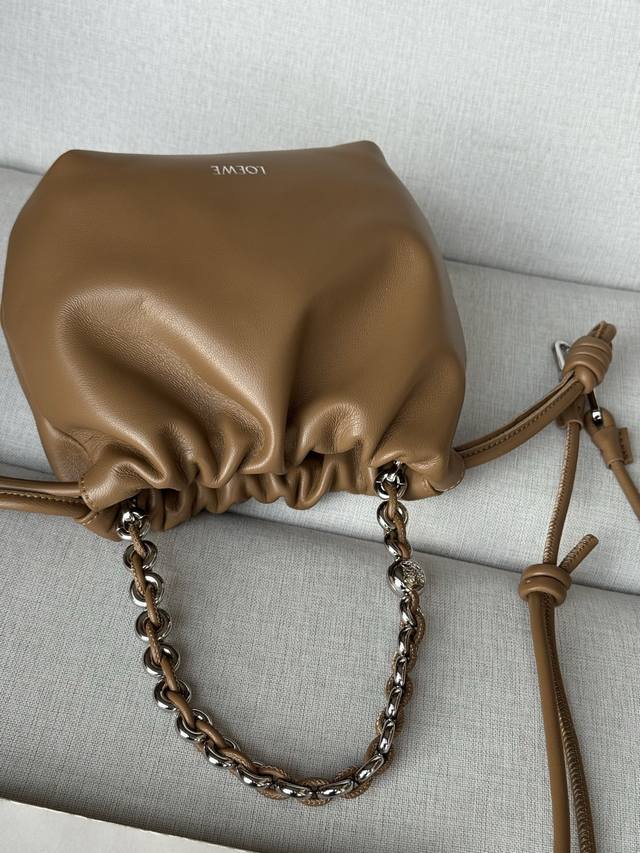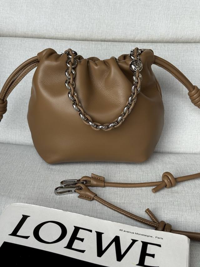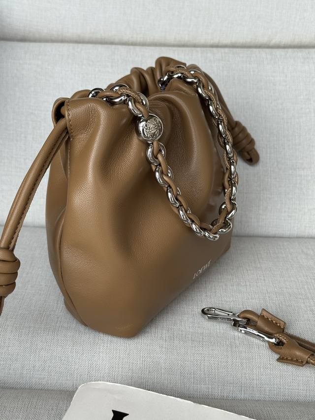 Original Leather DDD Mocha Color DDD Model 1773 DDD 23-17-5.5 Matching Metal Chain Extended Leather Shoulder Strap DDD Mini Nappa Lambskin Flamenco Clutch DDD The Flamenco clutch, released in the 1870s, features a drawstring closure and the iconic coiled knot. The Flamenco purse has been cleverly redesigned with a delicate knot and pleated top for a soft, sensual drape. This version is crafted from supple Nappa lambskin leather. DDD Can be worn crossbody or over the shoulder DDD Detachable and adjustable shoulder strap DDD Discreet magnetic closure DDD Suede lining DDD Loewe gold foil DDD: Gold DDD Material: Lambskin Leather DDD Weight: 0.2 Kg DDD