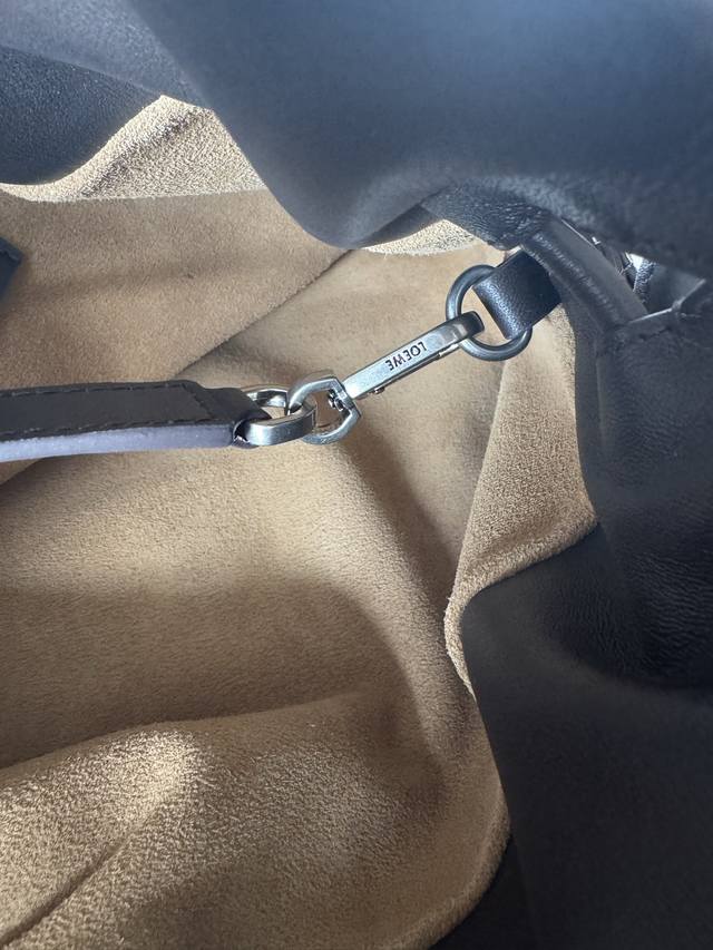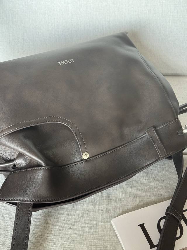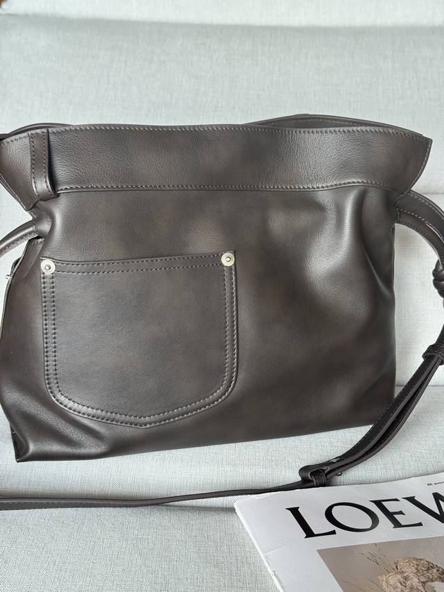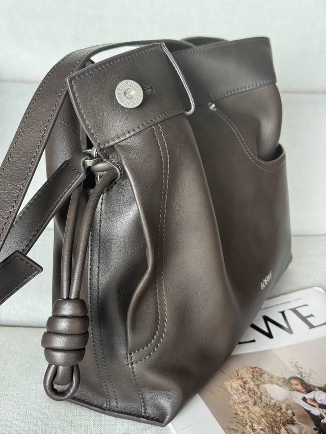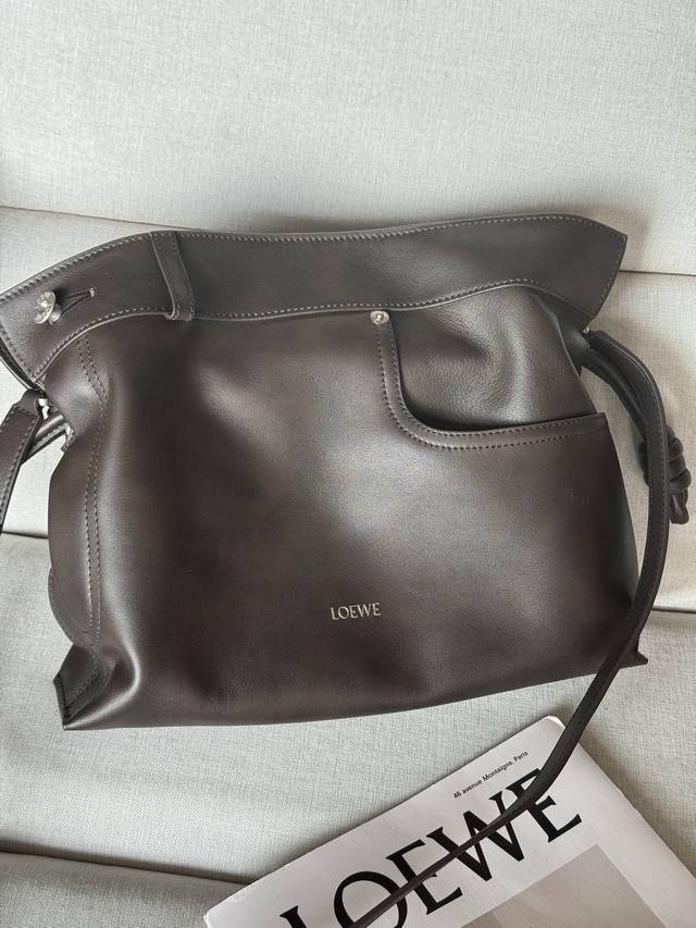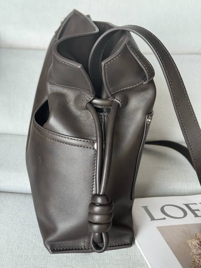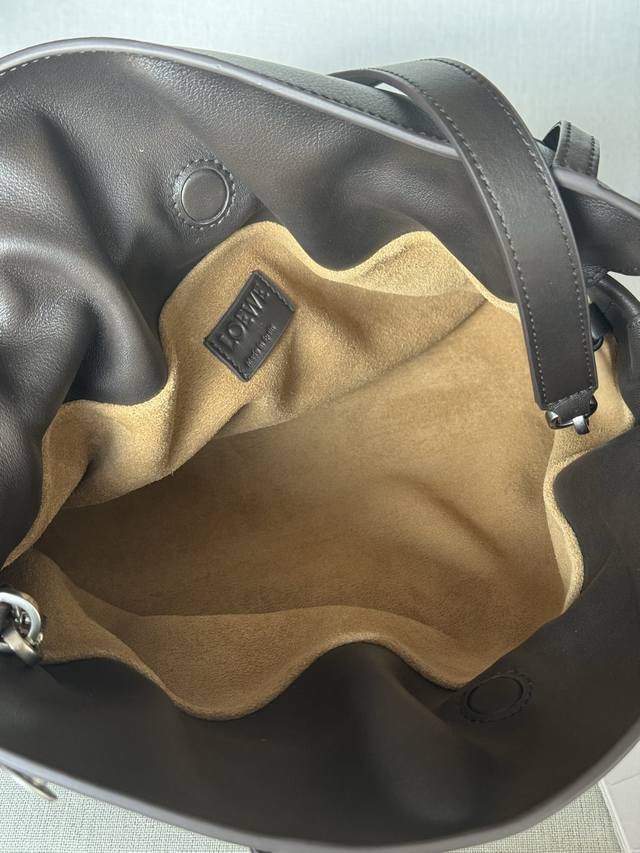 Original Leather Model 33703 Flamenco Handbag is a soft and plush bag with a snap closure and a historic knotted drawstring. This medium size is crafted from shiny calfskin and features denim-inspired details. Shoulder, cross, or hand carry. Detachable and adjustable straps. Magnetic closure. Herringbone cotton canvas lining. Silver embossed Loewe. Dimensions (cm/inch). Colors: Vintage Brown, Metallic, Palladium. Main Material: Shiny Calfskin. Shoulder Strap Length: 96-120 cm. Shoulder Strap Drop: 38-44 cm. Weight: 0.4615 kg. Height: 24.5 cm. Width: 30 cm. Depth: 10.5 cm.
