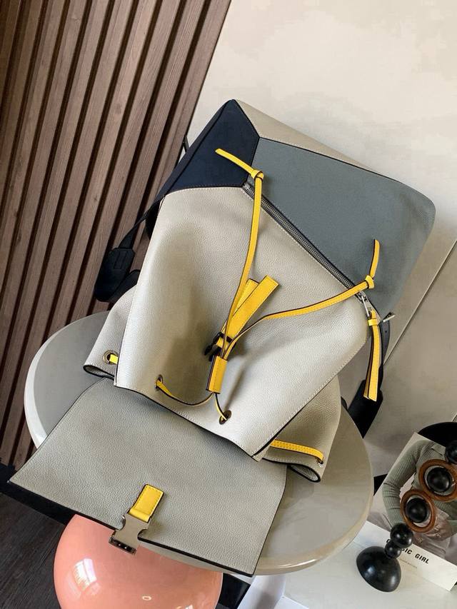 puzzle Backpack This military-style backpack is made of soft grained calfskin leather. It's spacious and versatile, crafted from a combination of soft grained calfskin and classic calfskin for exceptional comfort. Durable and comfortable against the shoulders, this backpack features Loewe's classic geometric design, easily recognizable without a prominent logo