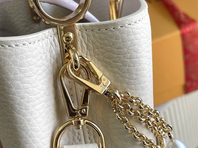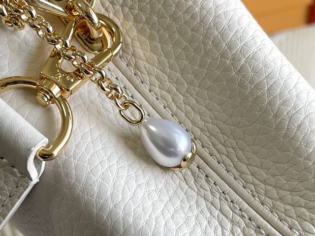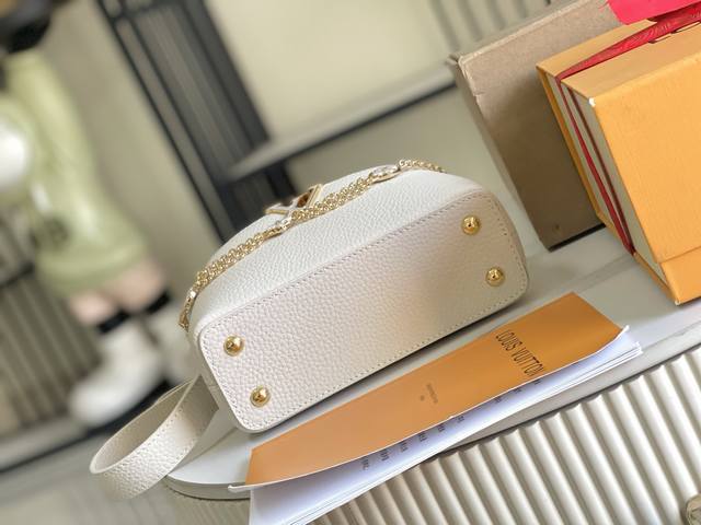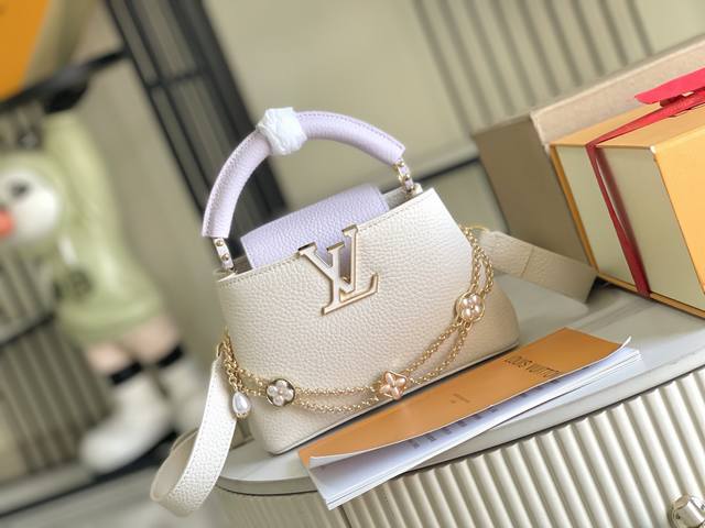 163 Premium Chip with Full Packaging, Top-Grade Original Leather M25461 Off-White with Taro Purple Mini Upgraded Hardware Capucines Mini Handbag Ddd. Crafted from full-grain Taurillon leather, this bag embodies quiet luxury. The iconic LV signature, made of lustrous mother-of-pearl, adds a subtle sheen to the piece. The bag's compact size masks its actual capacity: it will hold two smartphones, a long wallet, and other essentials. Dimensions: 21 x 14 x 8 cm DDD