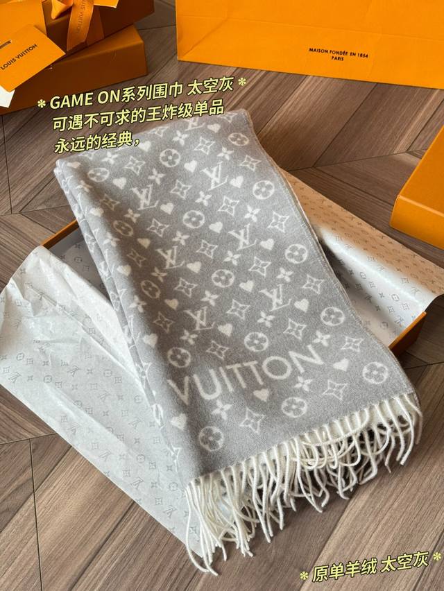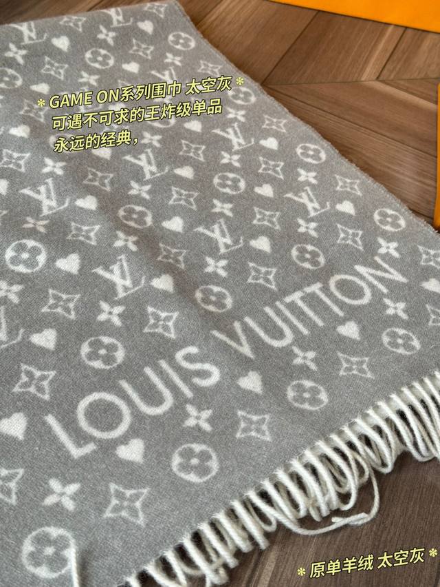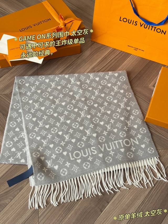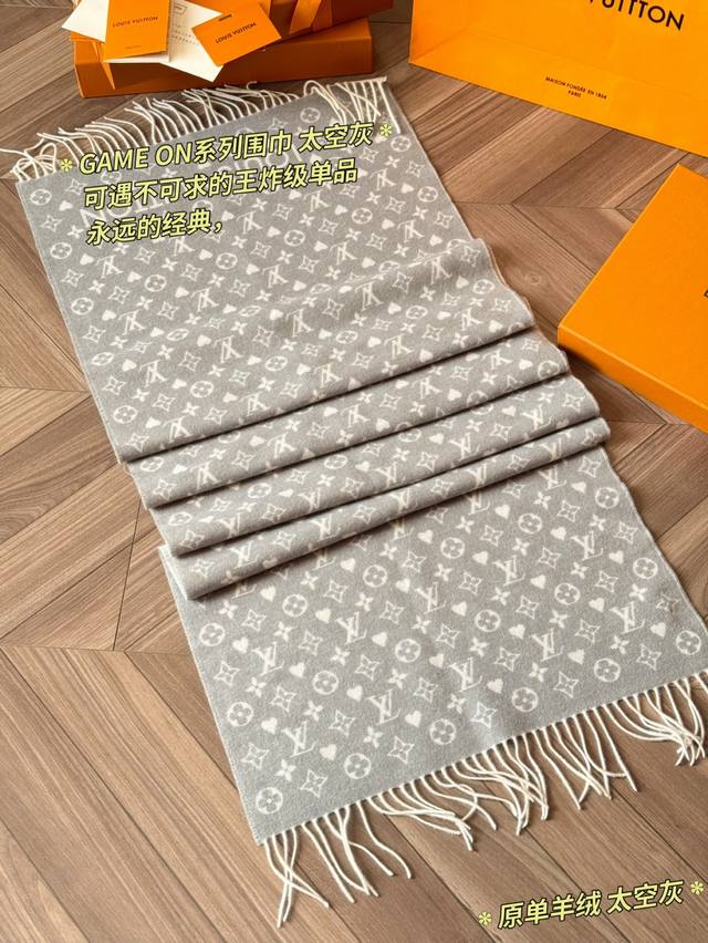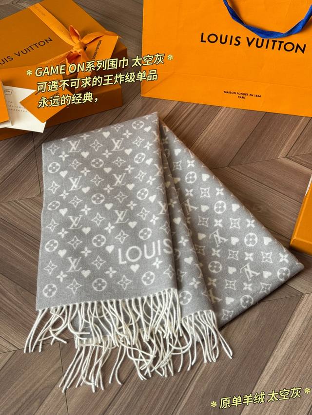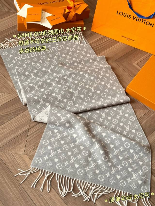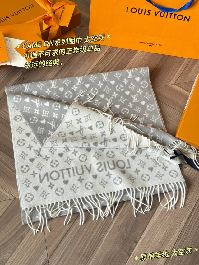Classic Original Cashmere Scarf from the Ddd Lv Game On series, made of 100% cashmere, soft and skin-friendly, a must-have for autumn and winter! Double-sided design: one side features the classic Monogram pattern with heart elements, the other a solid color, versatile yet sophisticated . Measuring 45 x 195 cm, the perfect length, it can be worn as a scarf or shawl, practical for commuting or travel. Designed by Nicolas Ghesquiere, inspired by card games, it combines luxury and practicality, a perfect finishing touch to your autumn and winter outfits.