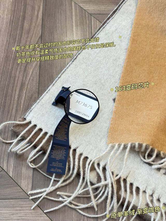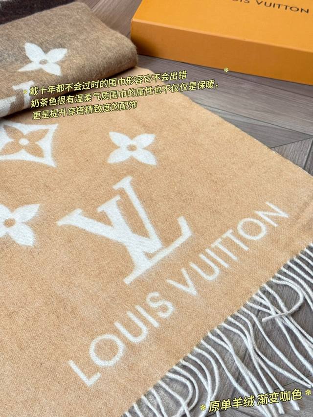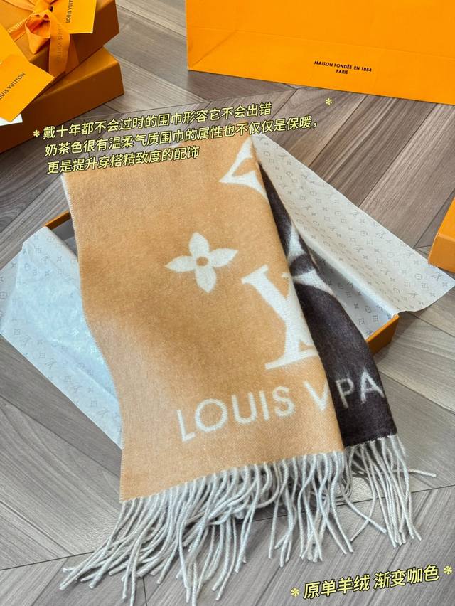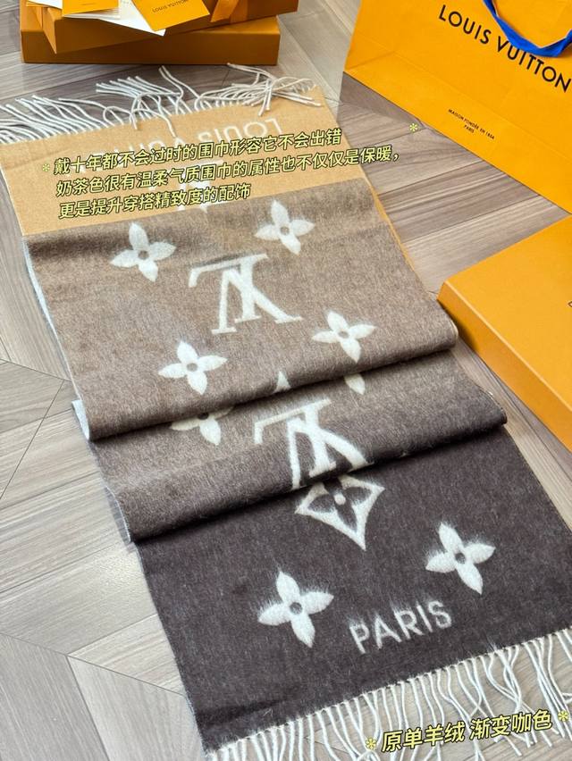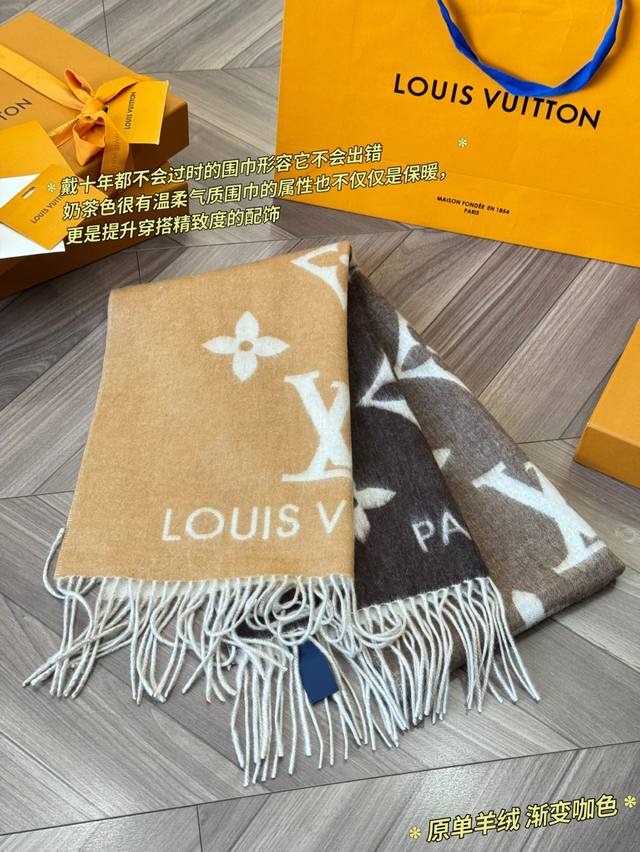 LV Reykjavik series gradient cashmere scarf, made of 100% cashmere, soft and skin-friendly, a must-have for autumn and winter! The gradient from milk tea color to dark gray, paired with the classic