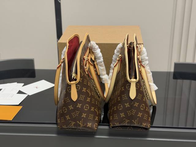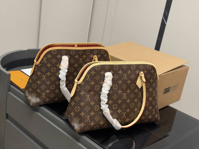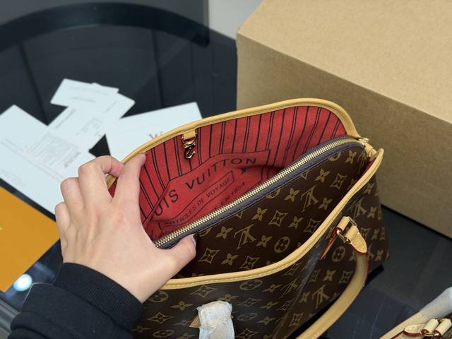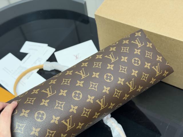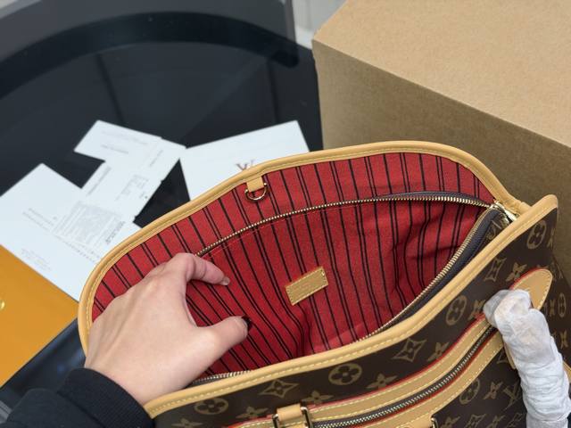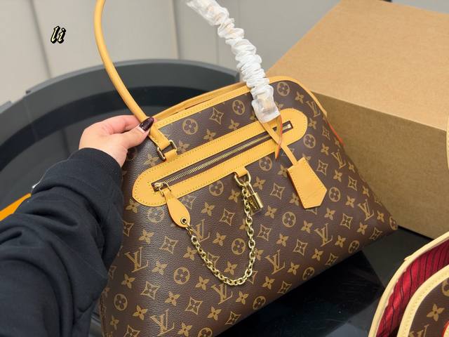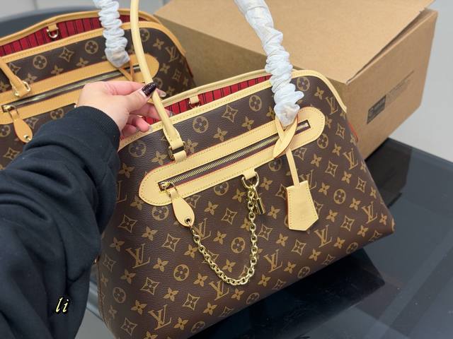 Ever More shell monogram bag is adorned with a gold chain, exuding vintage elegance. Inspired by the Alma handbag, its sleek lines and spacious design make it perfect for commuting or dates! It features a removable inner pouch for flexible organization and can also be used separately. The flap closure, front pocket, and laptop compartment are both practical and stylish. Versatile for hand-carrying or shoulder-carrying, it effortlessly elevates any outfit. Size: 40.26cm.