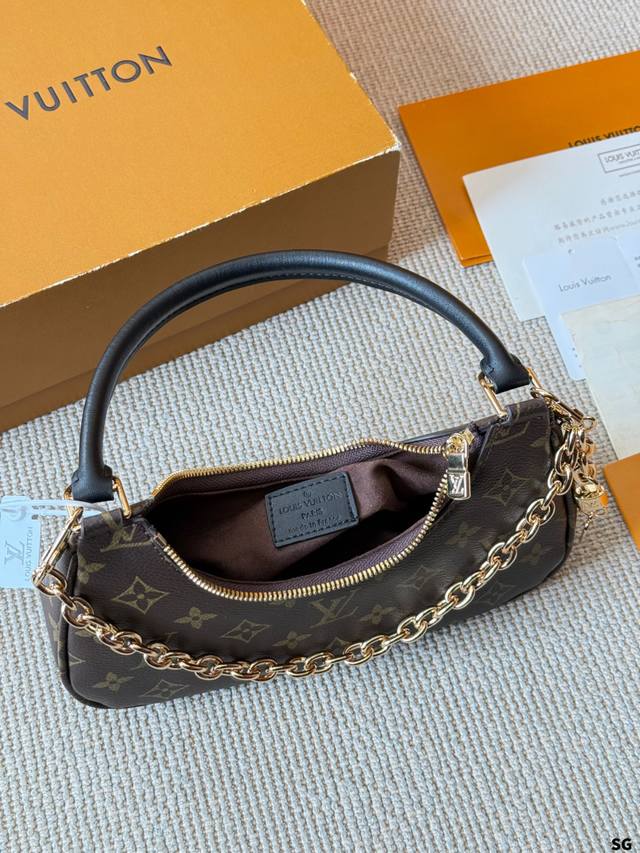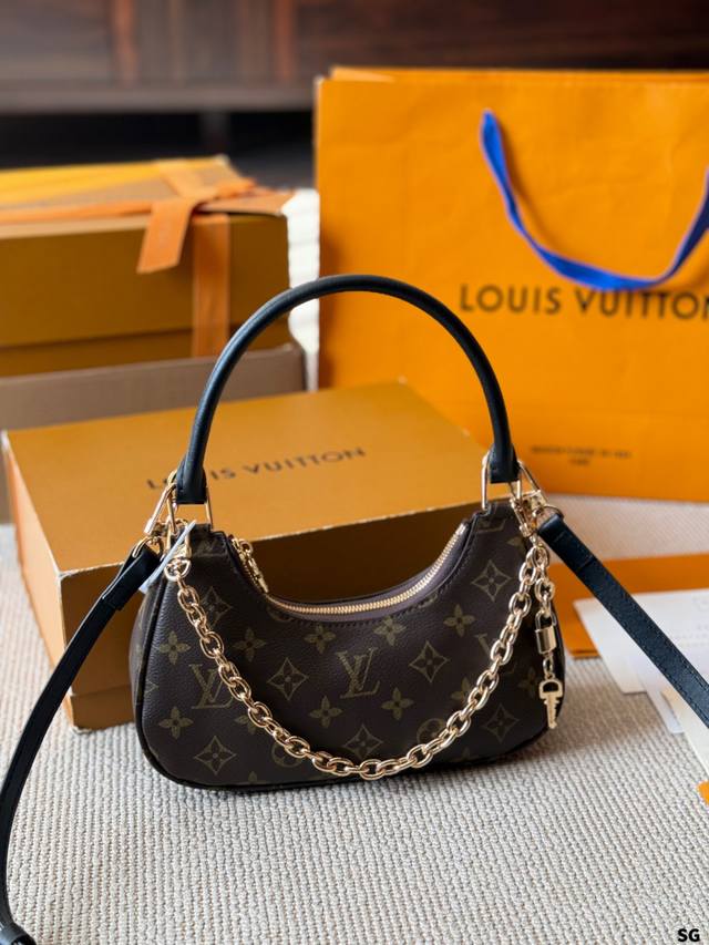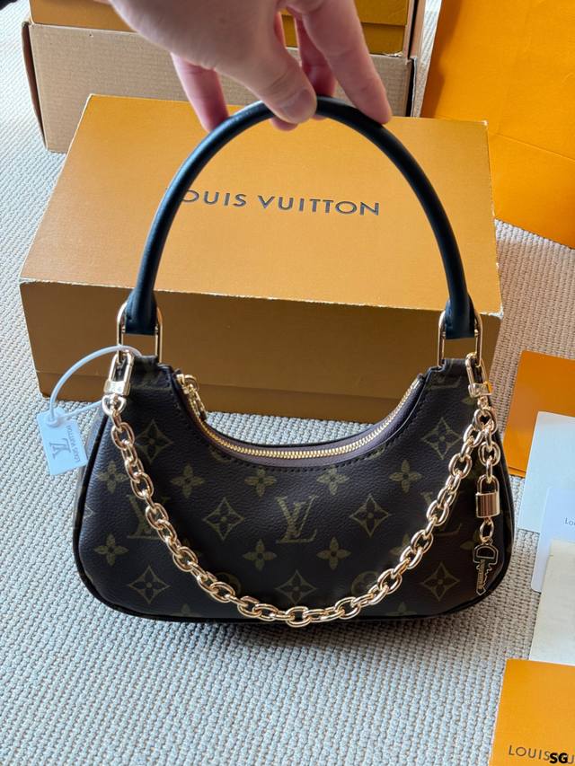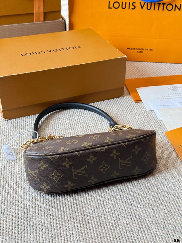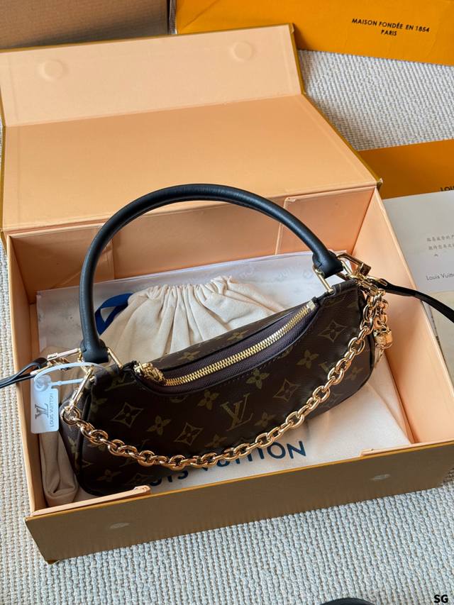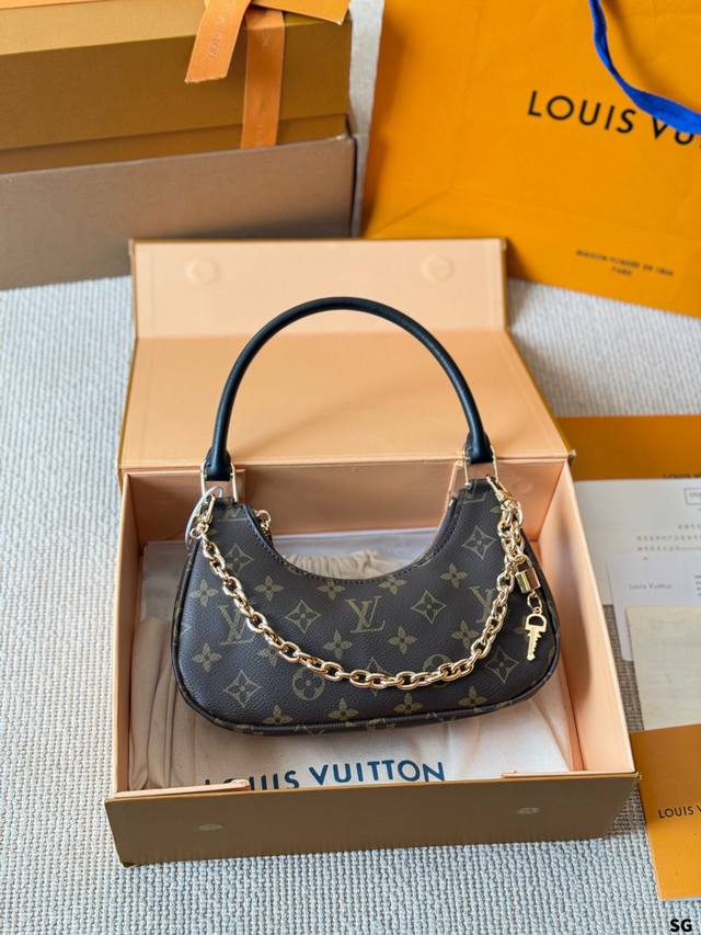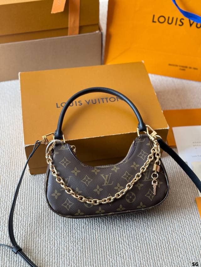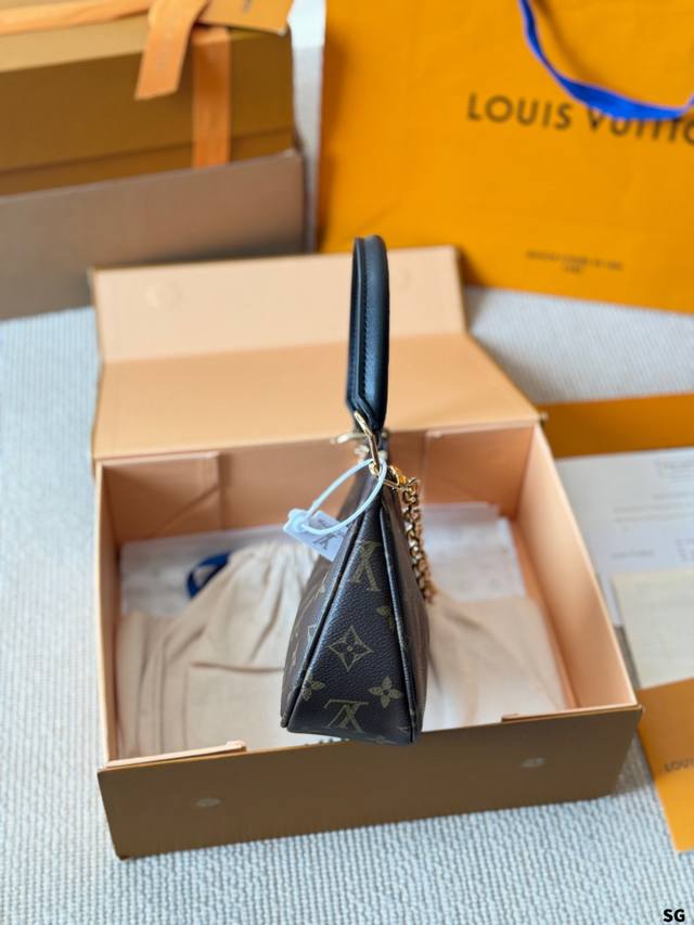 Leather Version Louis Vuitton Catchy Small Handbag. The Catchy small handbag features canvas outlined with leather trim, paying homage to the brand's heritage with the classic Monogram pattern, making it another clever choice. Its sleek design makes it easy to carry everyday essentials, while double slip straps allow for easy adjustment of the bag's silhouette. A detachable metal chain and key-shaped decoration add a touch of elegance. Size: 23 x 10 cm.