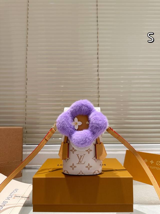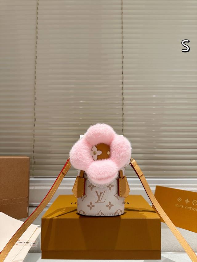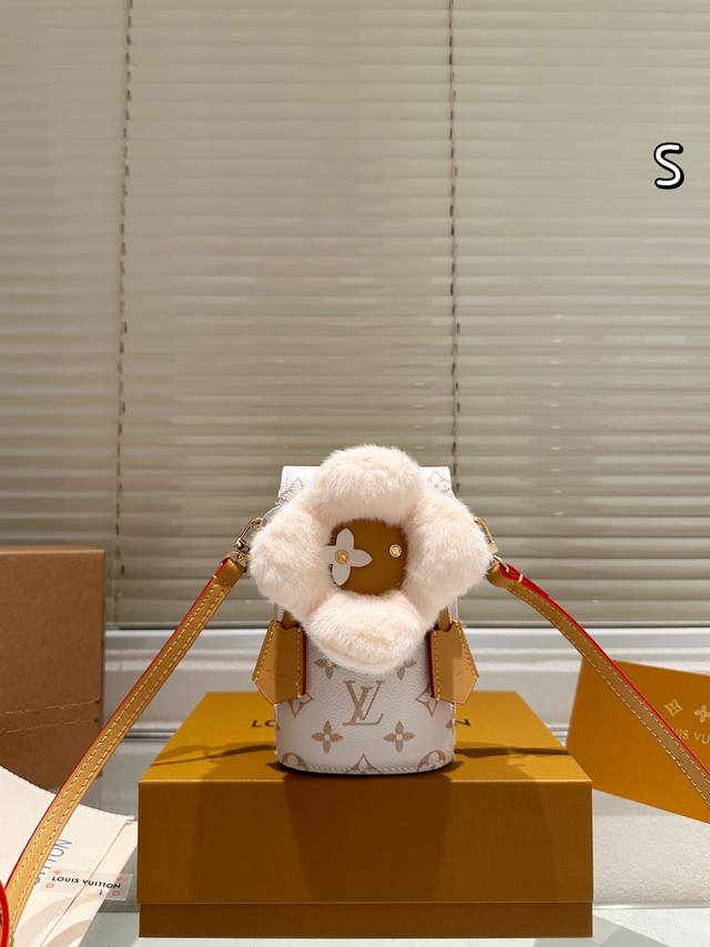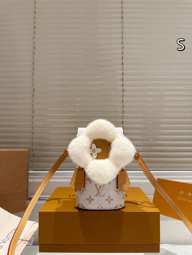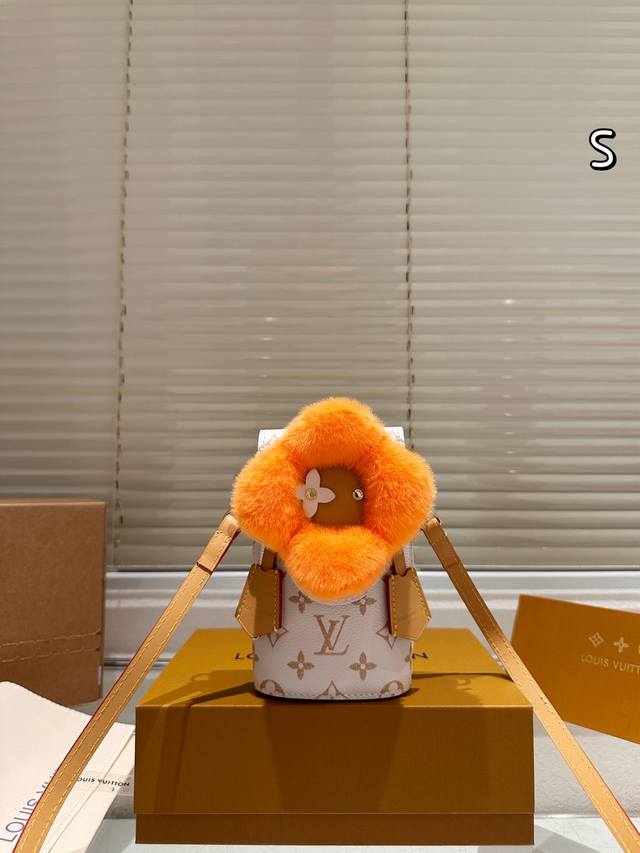 Leather version of the Ddd LV Vivienne plush phone bag. This limited-edition Christmas plush phone bag from the LV Vivienne series features an orange plush sunflower design with classic Monogram canvas and a leather shoulder strap. It's exquisite and adorable. Compact in size, it can hold a phone, tissues, lipstick, and other small items, making it suitable for everyday outings or as a holiday gift. The shoulder strap is slightly short, making it more suitable for casual wear. Be aware that the plush material is waterproof and stain-resistant. This Christmas limited edition is now sold out, making it a highly collectible item. Don't miss out if you love unique designs! Size: 10 x 18 cm