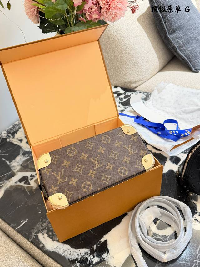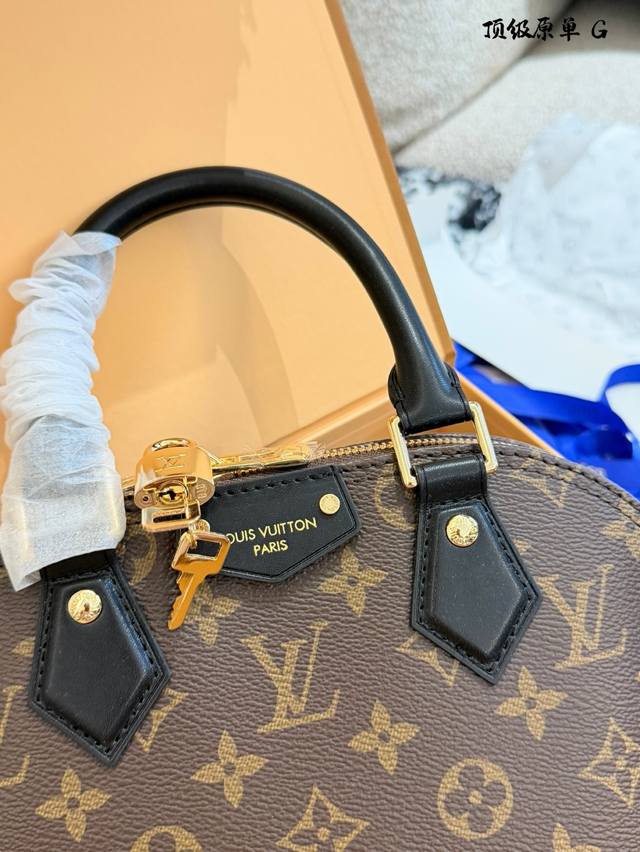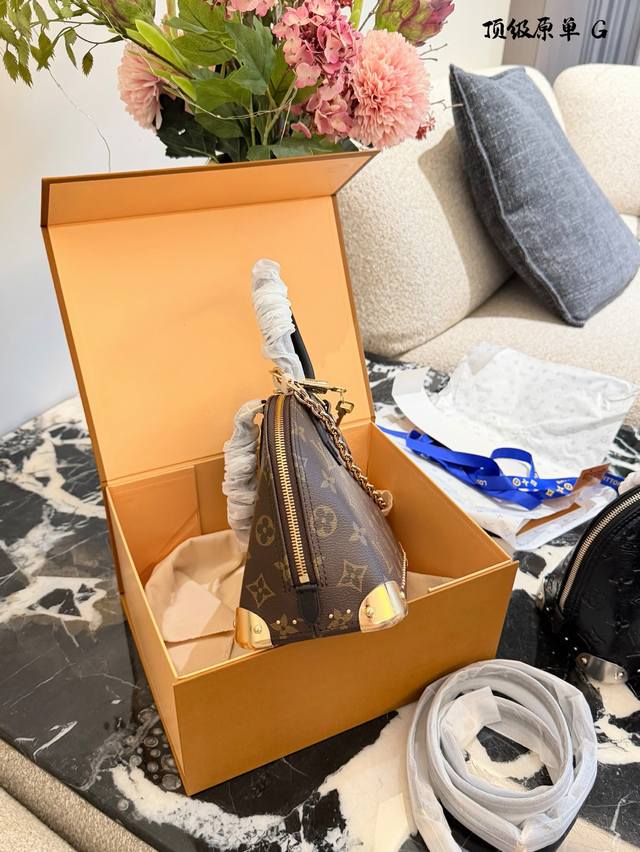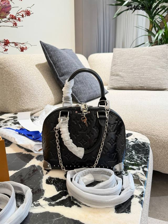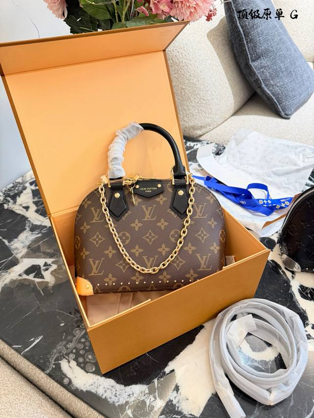 LV Alma Trunk Bb Handbag Ddd The LV Alma Trunk Bb handbag features classic Monogram canvas with black leather trim, accented with metal studs and chains, offering a retro yet stylish look. The shell bag Ddd is a compact 22cm size, perfect for hand-carrying, shoulder-carrying, or crossbody wear, making it incredibly versatile for both work and casual outings. Double Box DDD