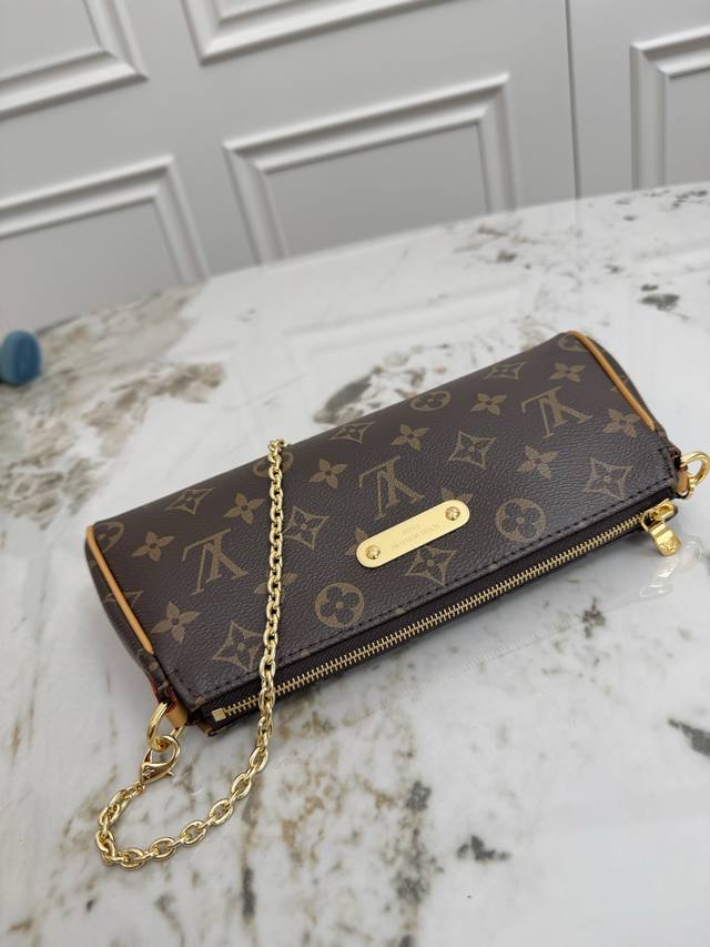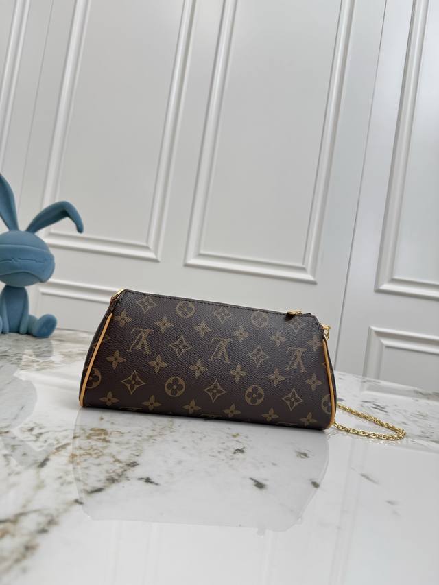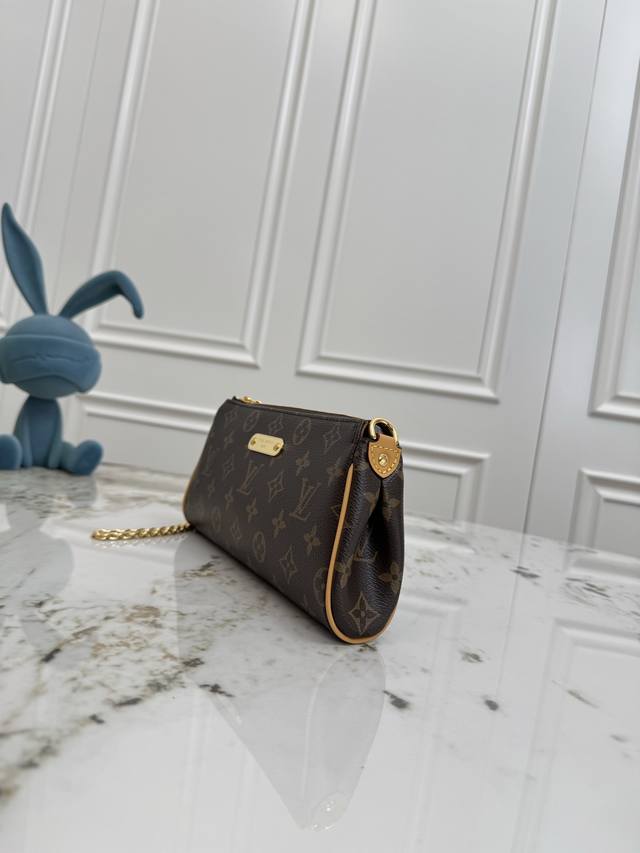 M13567 This Pochette Eva handbag features the brand's Monogram canvas with contrasting leather trim, conveying an elegant style with a distinctive touch. The Louis Vuitton logo plaque and detachable chain complement each other perfectly, and the well-proportioned design makes it ideal for storing a short wallet and cosmetics. Dimensions: 27 x 11 x 5 cm (Length x Height x Width) Monogram coated canvas Calfskin leather trim Fabric lining Hardware Zipper closure Large compartment Holds a smartphone, earphones, a short wallet, and keys Chain: Detachable Made in one of France, Spain, Italy, or the USA.