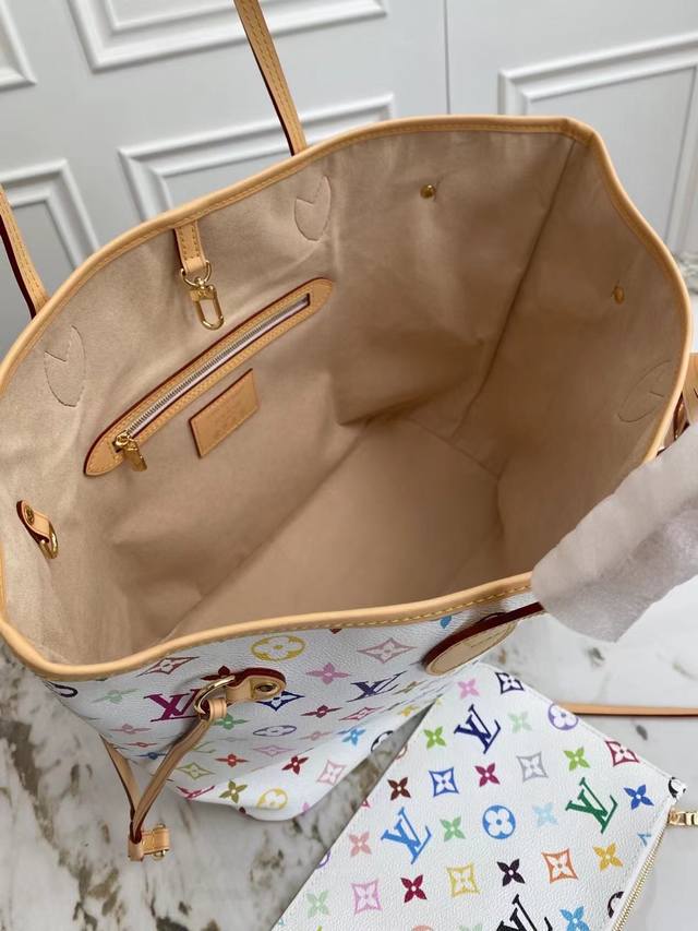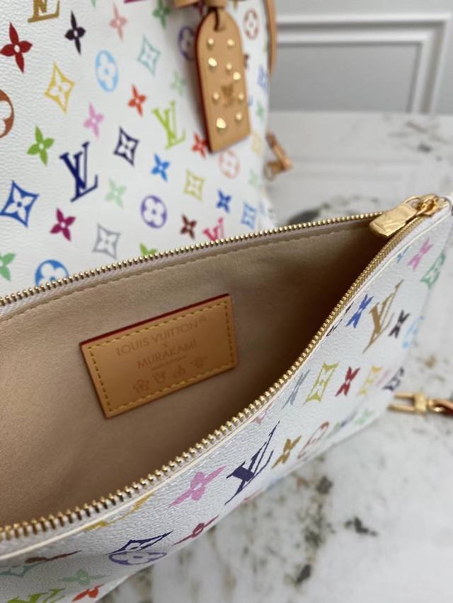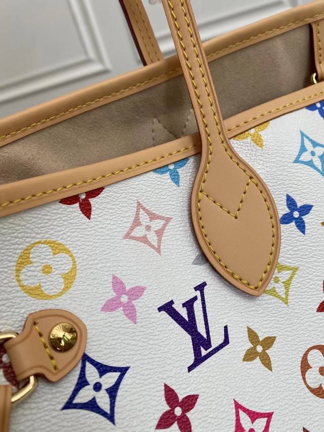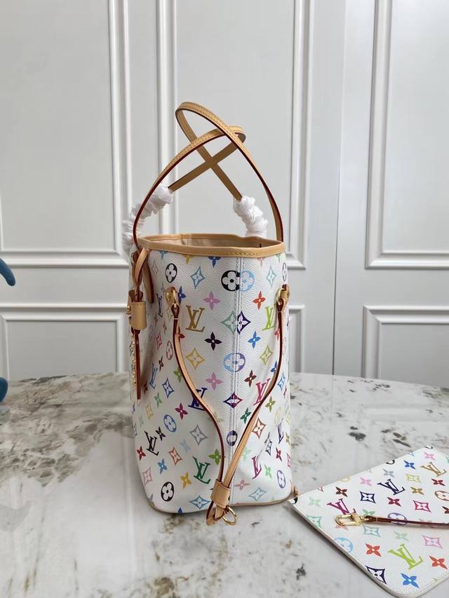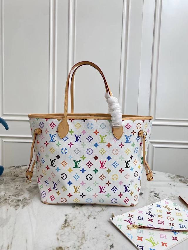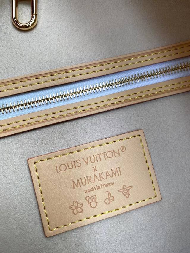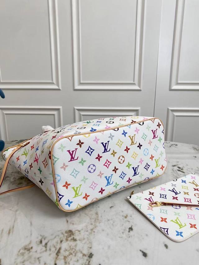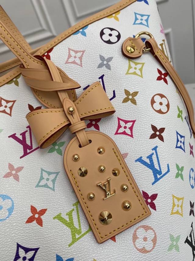 Original factory exclusive background dynamic chip top-quality original single-store real shot M27787 This Neverfull Mm is from the Louis Vuitton x Takashi Murakami reissue series, cleverly incorporating the bright colors of the Japanese artist into the Monogram coated canvas. Particularly noteworthy is the detachable zippered clutch, which can be used alone as an elegant clutch or as an extra pocket. Calfskin trim outlines a fitted silhouette, and the nameplate embellishes with an elegant bow detail. Dimensions: 32 x 29 x 17 cm (Length x Height x Width)