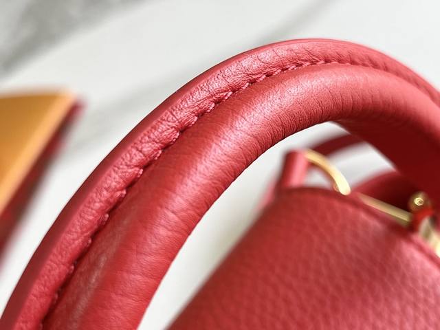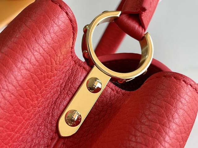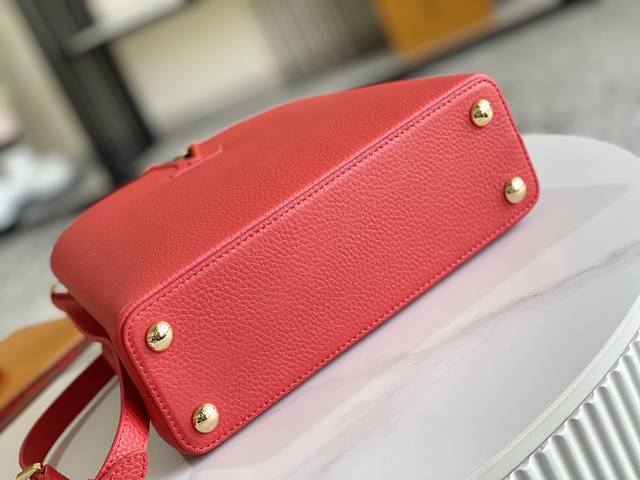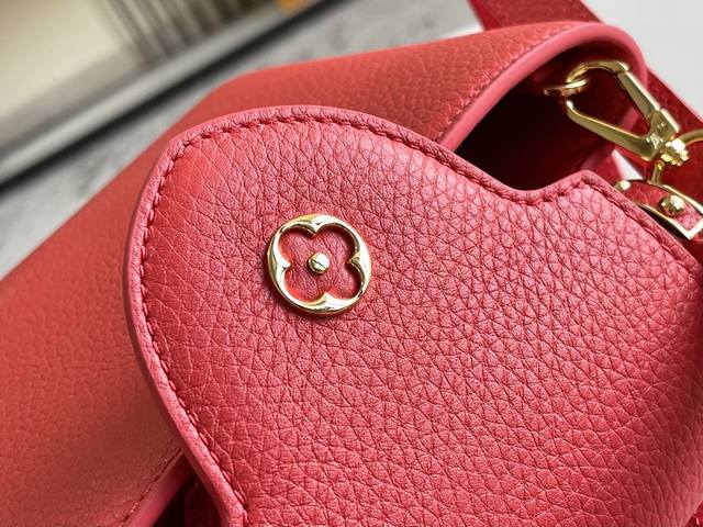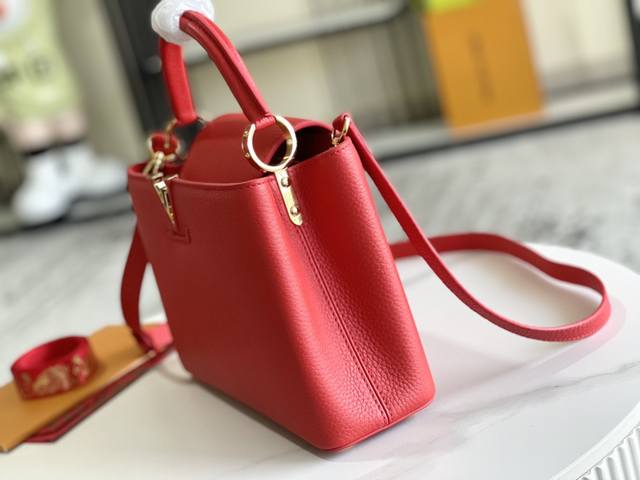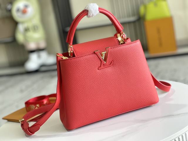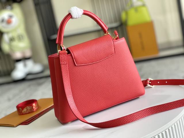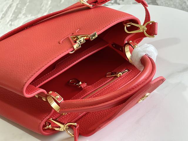 Premium Edition with Full Packaging, Chip Version, Premium Genuine Leather, M43935, Red, Small, Gold Buckle. The first Louis Vuitton store opened on rue Capuchin in Paris. The Capucines handbag, like the brand itself, is timeless and adds a touch of chic sophistication to any look. Full-grain Taurillon leather crafts a luxurious handbag, highlighted by traditional details: the LV initials, a distinctive side loop, and a delicate Monogram flower on the flap. Equipped with a top handle, a removable strap, and a unique flap, it offers a variety of carry styles to suit every look and mood. Imported lychee-grained cowhide leather. Original brushed steel hardware. Features: 27.0 x 18.0 x 9.0 cm.