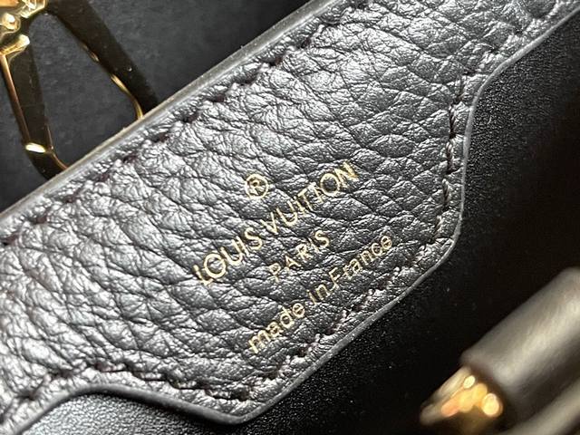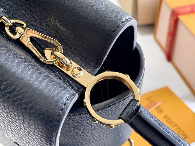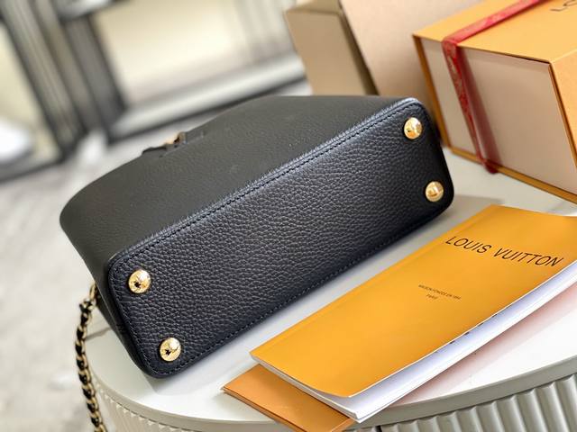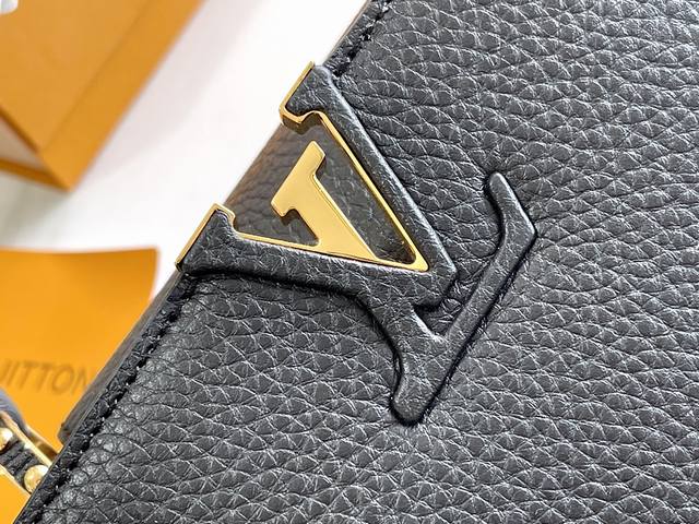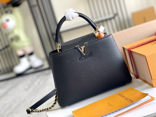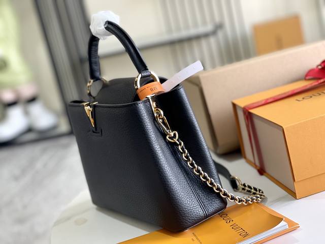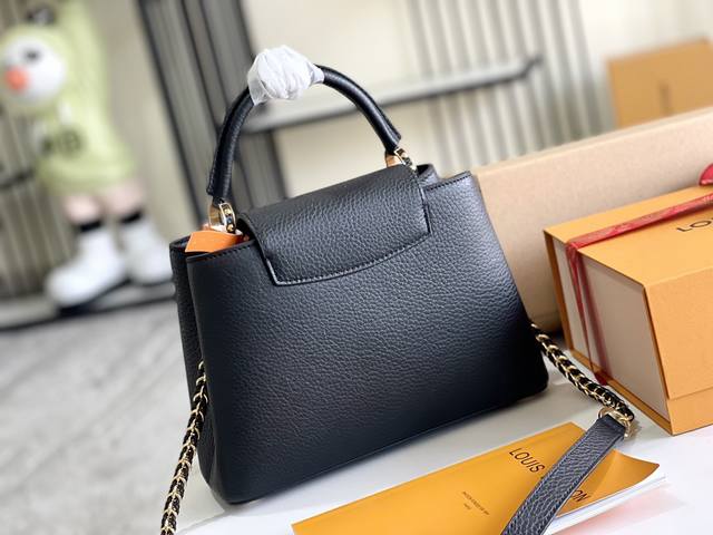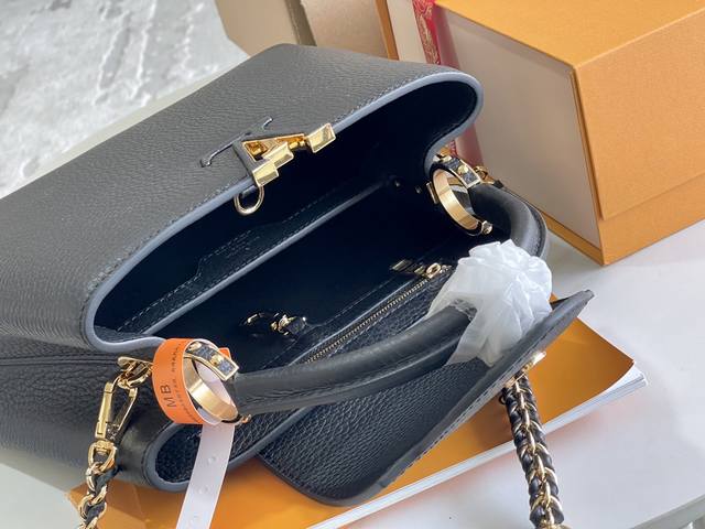 Premium, fully packaged, premium original leather M48865, black with gold buckle. This Capucines Bb handbag, crafted from Taurillon leather, exudes a modern flair. Its woven leather chain is removable and adjustable, allowing for easy shoulder or crossbody wear. The flap retracts to reveal the classic Lv logo. Details: 27 x 18 x 9 cm. Length x Height x Width.