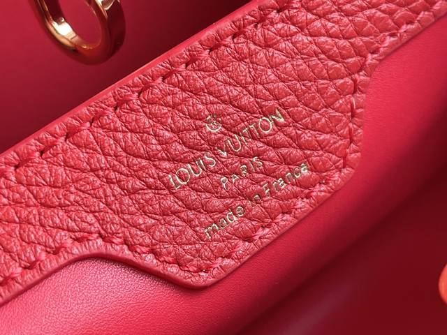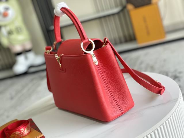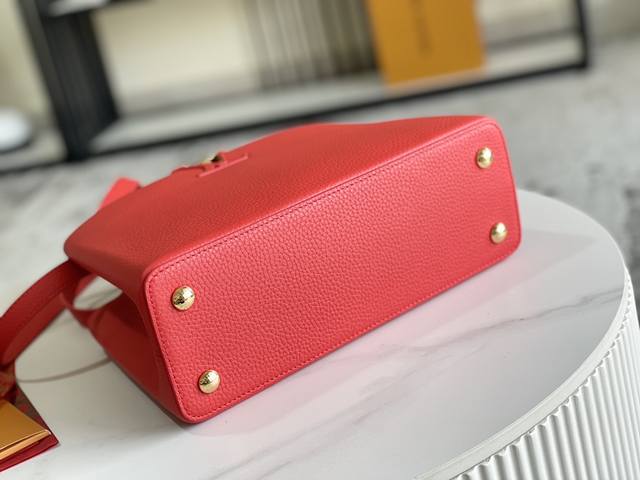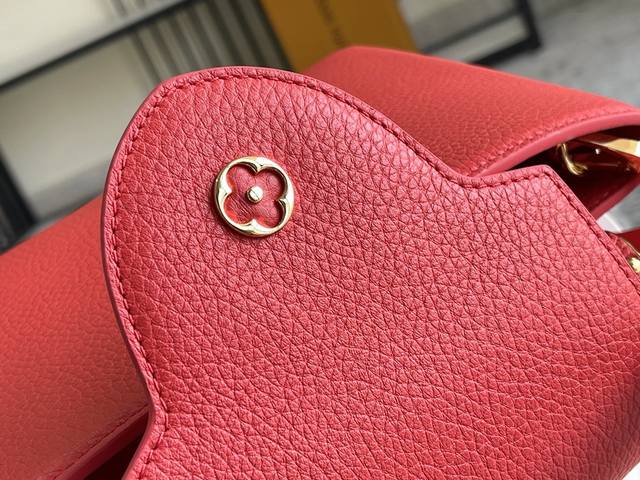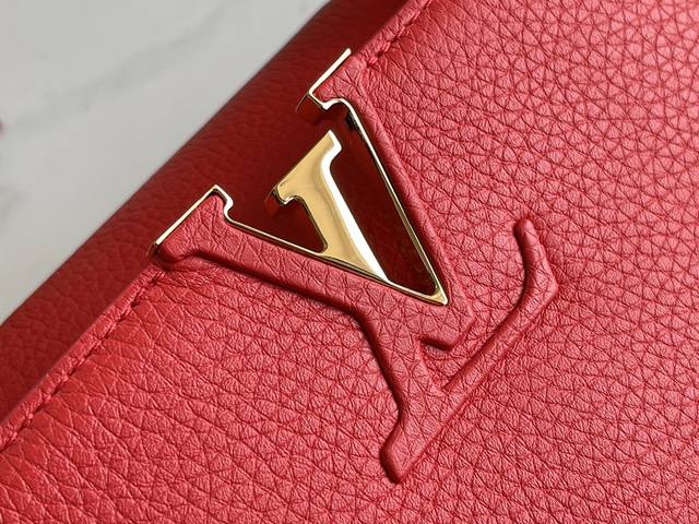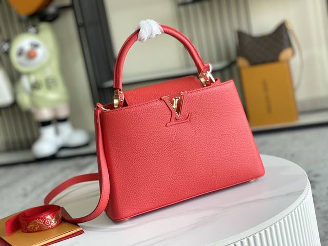 Premium with full packaging, chip version, premium original leather, M43935, M42259, red, medium, gold buckle. The first Louis Vuitton store opened on rue Capuchin in Paris. The Capucines handbag, like the brand itself, is timeless and adds a touch of chic sophistication to any look. Full-grain Taurillon leather is combined with rare broad-grain python leather to create a luxurious handbag. Traditional details highlight the bag: the LV initials, a distinctive side loop, and a delicate Monogram flower on the flap. Equipped with a top handle, a removable strap, and a unique flap, it offers a variety of carrying styles to suit every look or mood. Imported lychee-grained cowhide leather. Original brushed steel hardware. Dimensions: 31.5 x 20.0 x 11.0 cm.