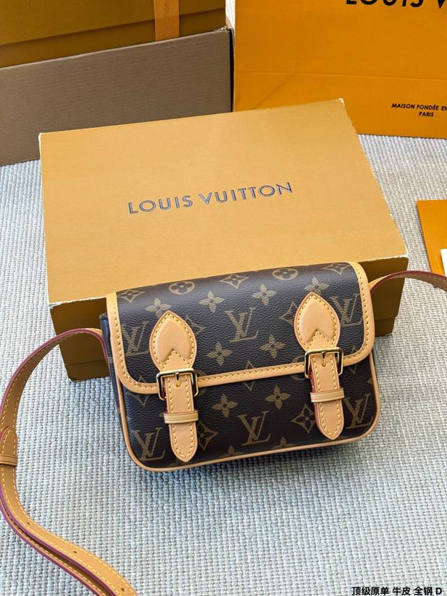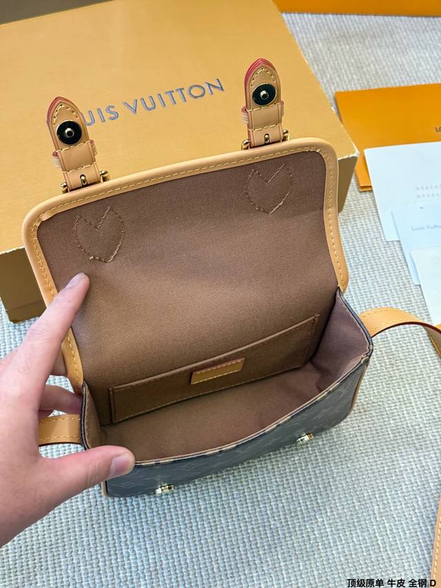 LV Satchel mini messenger bag. Featuring classic Monogram canvas and dark honey-colored cowhide trim, this mini messenger bag exudes a retro, preppy style! Measuring 19x15cm, it's compact and exquisite, perfect for daily commutes and casual outings. The double-buckle design and adjustable shoulder strap allow for both shoulder and crossbody wear. The interior space can hold a phone, keys, cardholder, and other small items. Inspired by 1930s messenger bags, this practical and collectible bag is easily worn by both men and women and complements both casual and retro outfits.