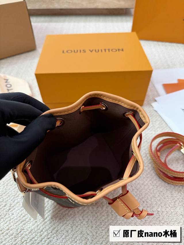Top-quality original single-piece steel hardware with scannable chip Ddd Lv new small bucket bag Nano Noe DDD Does it look familiar? The appearance is a bit like the small Noe BB. April 1st_New arrival and it was hard to find. The popularity is not without reason Haha~ It looks mini, but it can hold more than you think. A mobile phone, keys AA. Lipstick, tissues, etc. are definitely OK. It is practical and easy to carry, and it also has a bit of playfulness. It is simply the king of small bags DDD The overall bag shape is more sturdy and three-dimensional than the old model. And the bottom of the new model is so beautiful O The bottom is made of monogram material. It can be carried by hand, the handle is detachable, and the shoulder strap is adjustable and detachable, so there are many ways to carry it DDD However, the closure is a pull-out design. Sisters who are worried about items falling can add an inner bag to solve the safety problem without affecting the appearance Iv monogram material. Everyone knows that it is durable, easy to care for, classic, timeless, and versatile DDD The new Noe is the same size as the old model 13X16X10 DDD