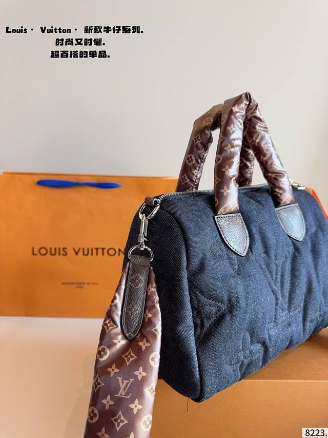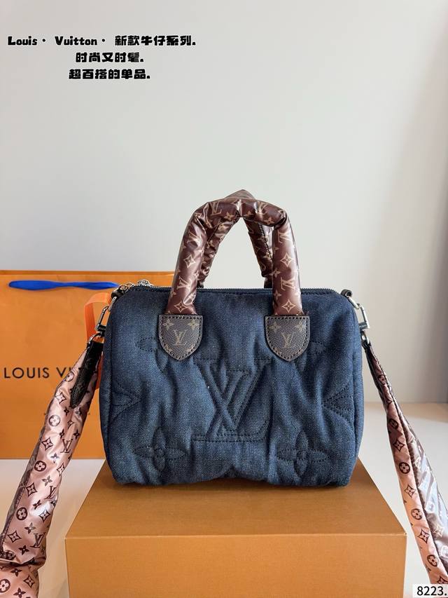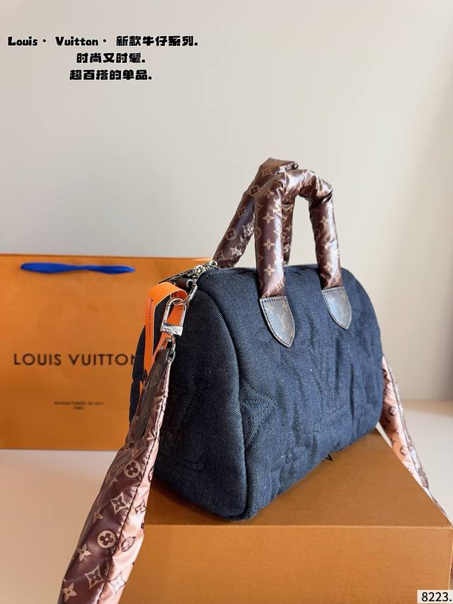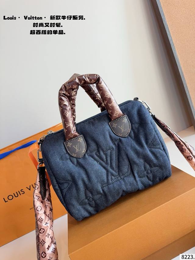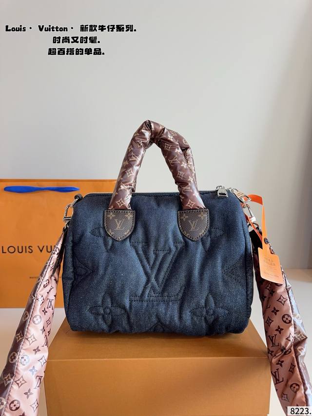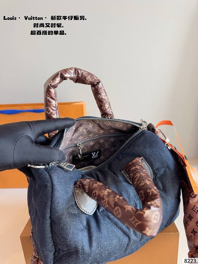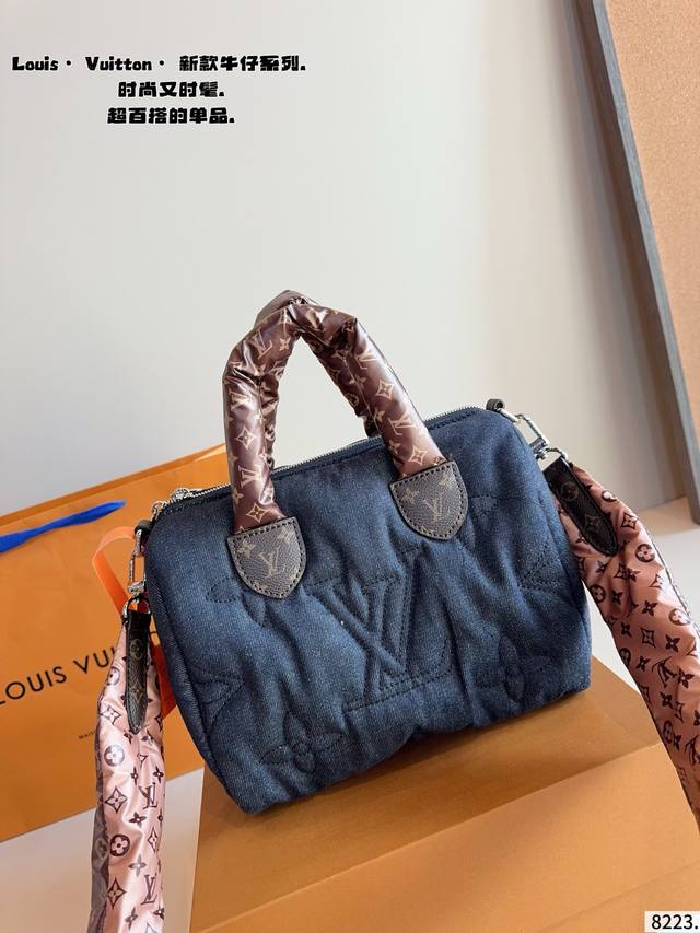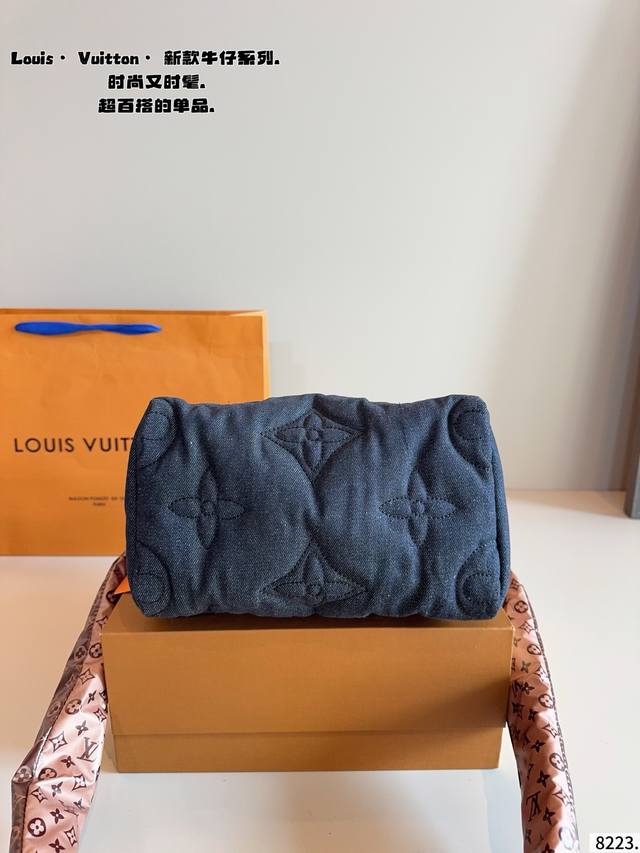 Comes with gift box. DDD LV Speedy Denim Pillow Bag DDD The logo is super stylish DDD The texture and temperament are top-notch DDD It's sophisticated, casual, and versatile, which is the main reason I bought it. The soft lambskin material makes it a bag that can handle various styles, from work to casual. A worthwhile purchase. Dimensions: 25*14*18Cm DDD