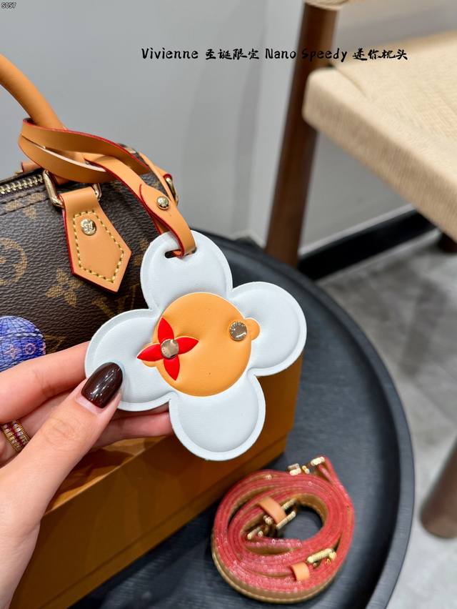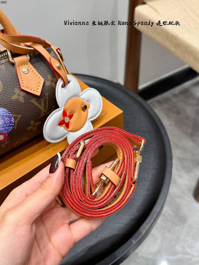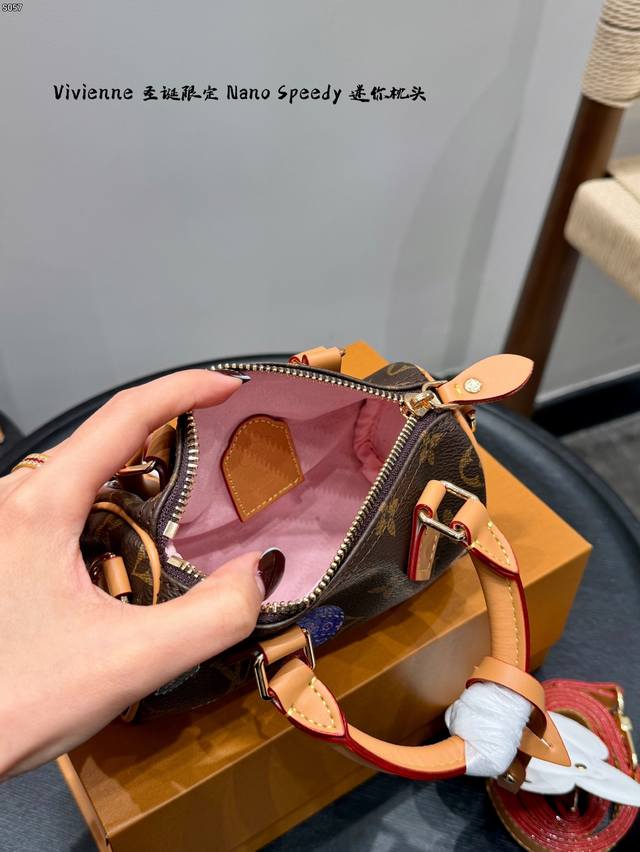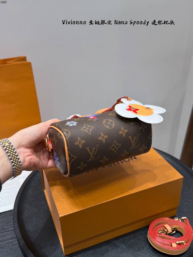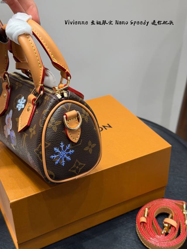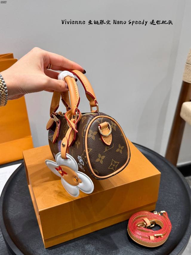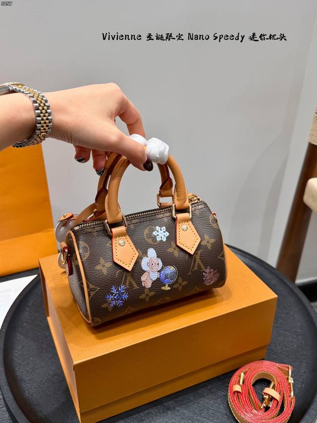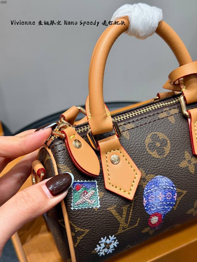 Full Gift Set DDD Chip Version Steel Hardware! DDD LV Vivienne Christmas Limited Edition Nano Speedy Handbag Mini Pillow Mini DDD Classic Monogram Canvas Cartoon Character, Paired with Snowflakes, Globe DDD and other winter elements, full of festive atmosphere.