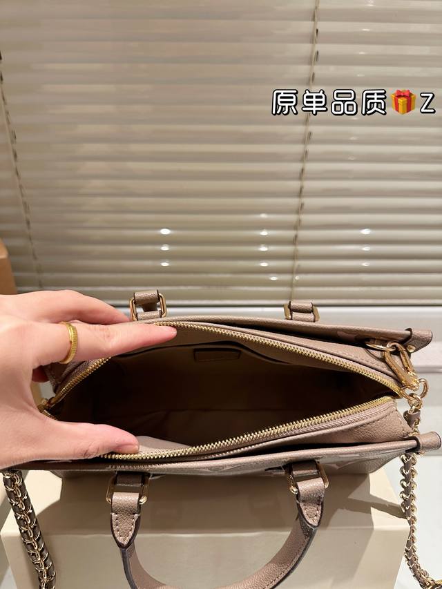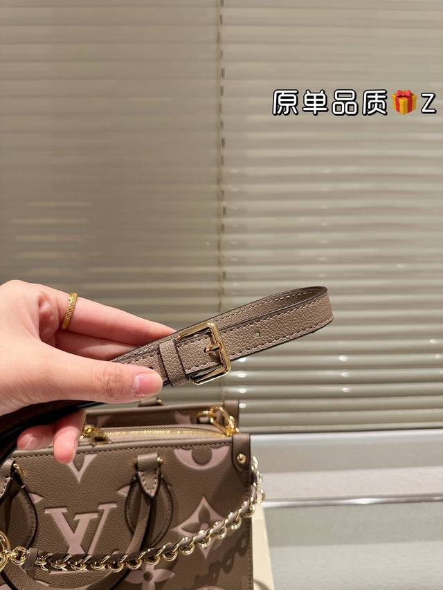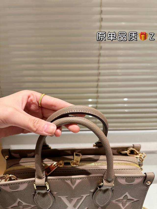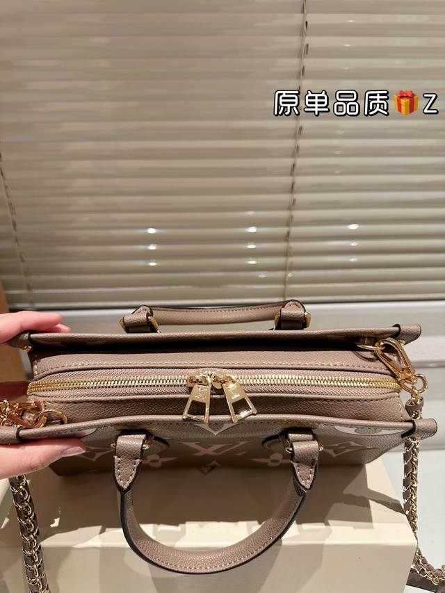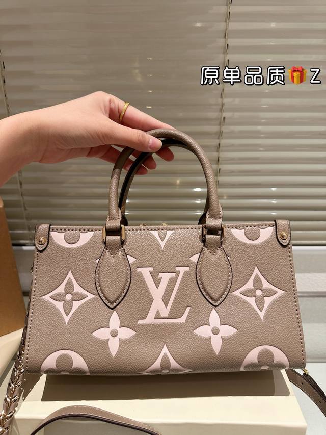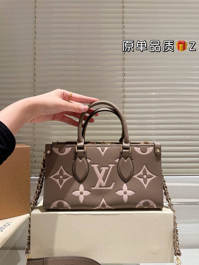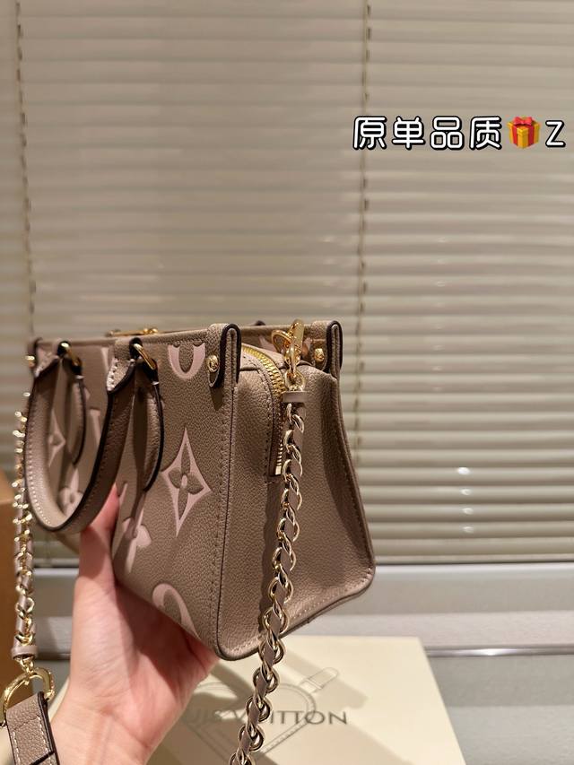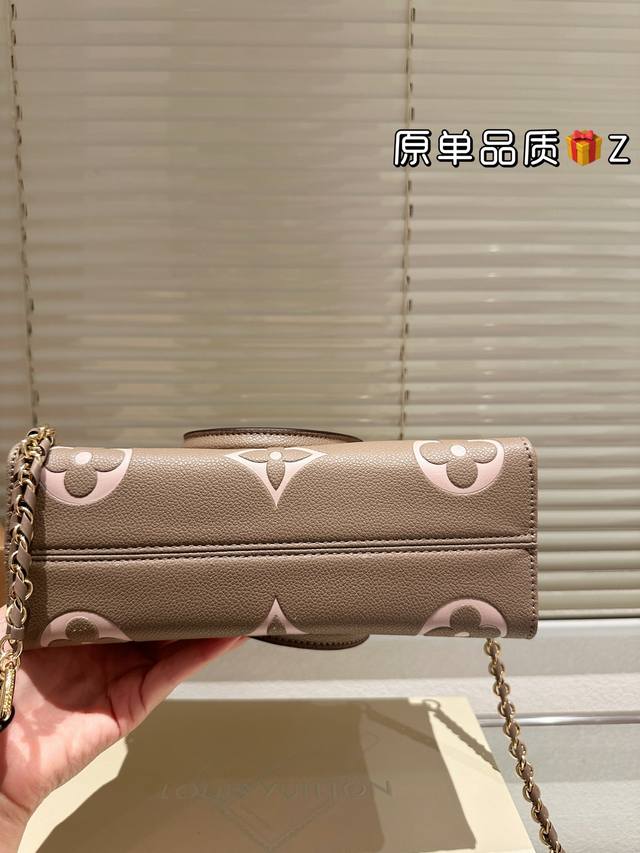 Leather version of the LV Onthego horizontal monogram bag. Featuring classic Monogram coated canvas with leather trim, this bag has a detachable metal chain shoulder strap, allowing for hand-carry, underarm, or crossbody wear. The bag has a clean, spacious design with three interior compartments and a zippered pocket for convenient organization. Measuring approximately 24