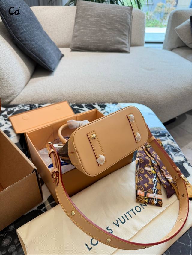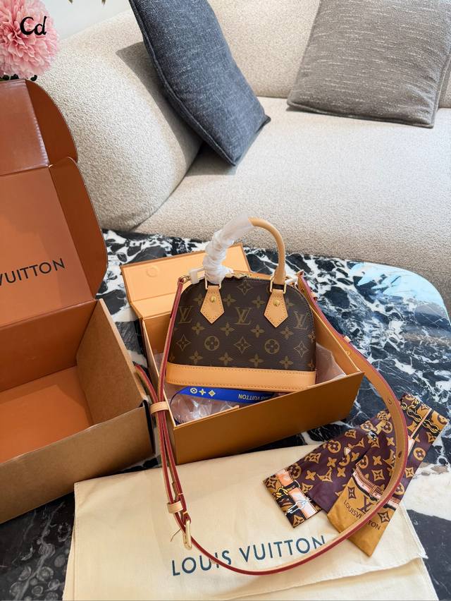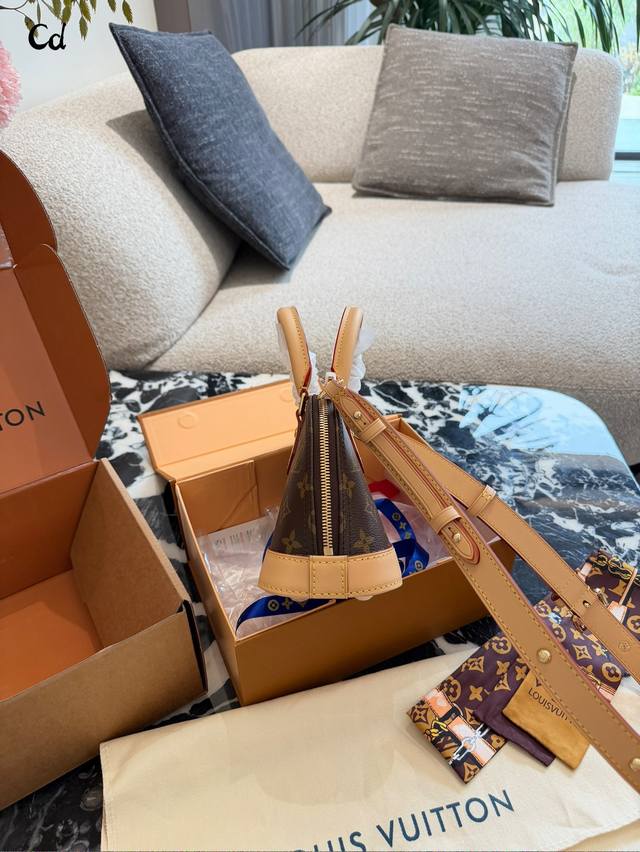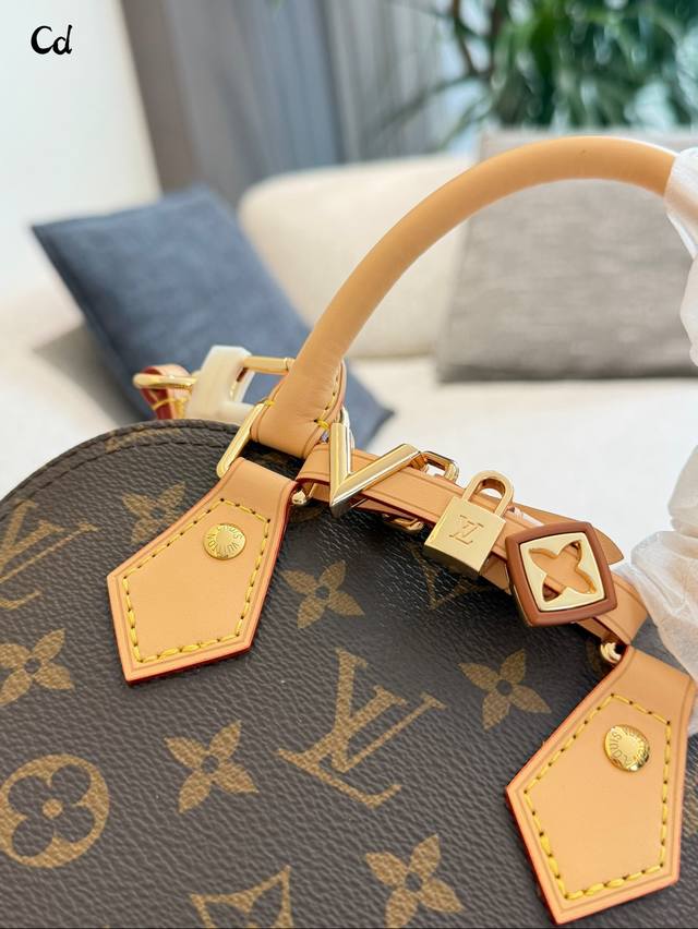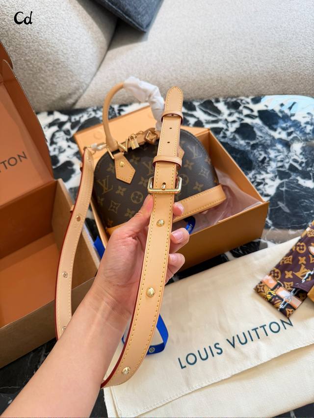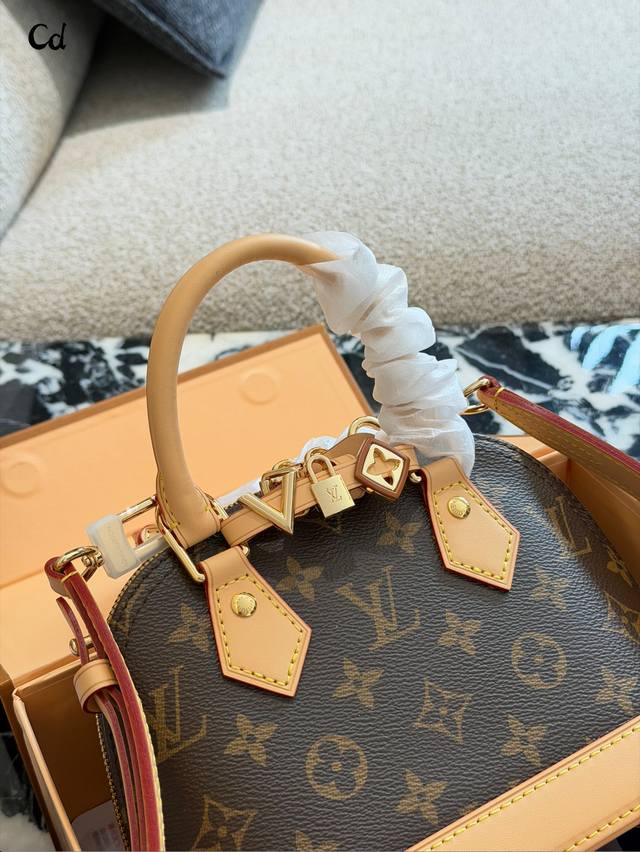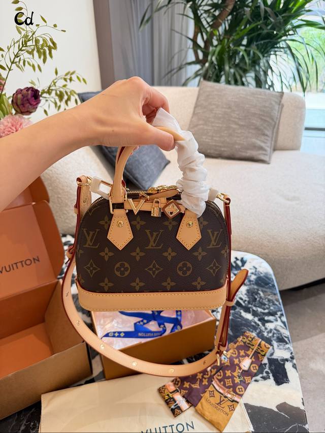 LV Alma Bb Monogram Canvas Shell Bag DDD The LV Alma Bb shell bag features classic Monogram canvas with leather trim and exquisite gold-tone hardware. Measuring 20x18x11cm, it's compact and elegant. The zipper closure ensures secure closure, and the adjustable shoulder strap allows for hand-carrying or crossbody wear. The interior is lined with microfiber, making it suitable for everyday commutes and casual outings. Since its introduction in 1934, it has been known for its elegance, practicality, and high collectible value. DDD