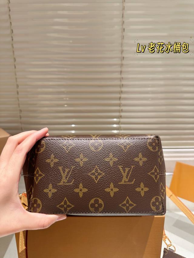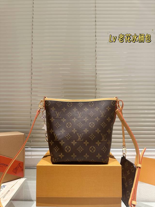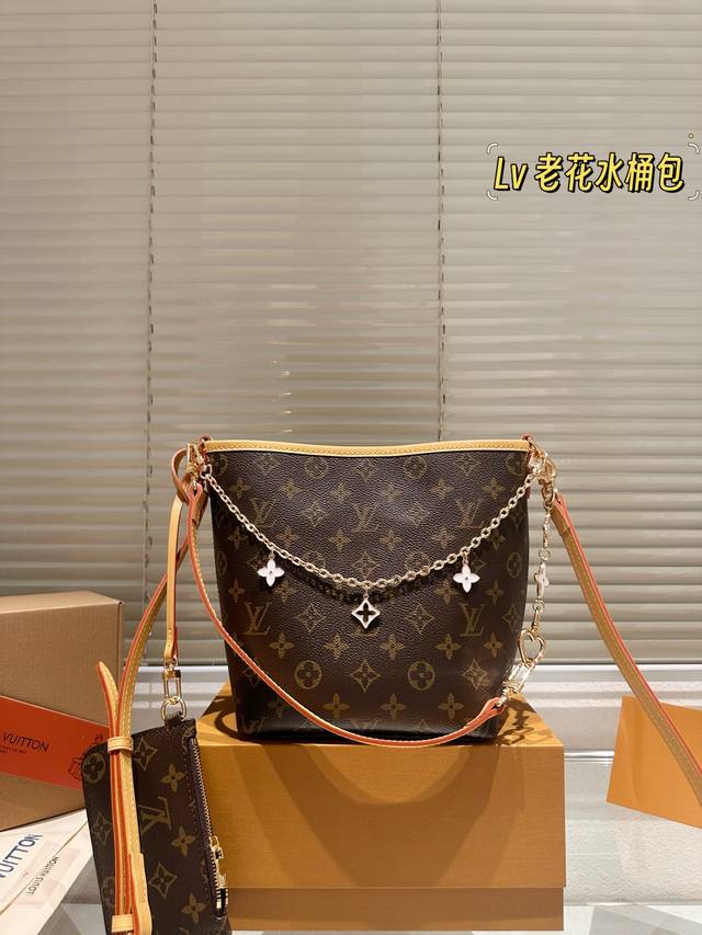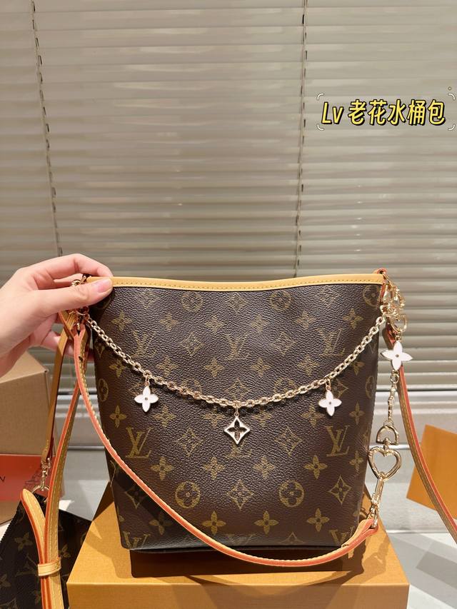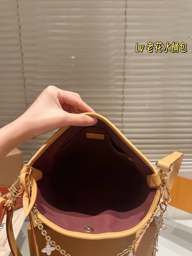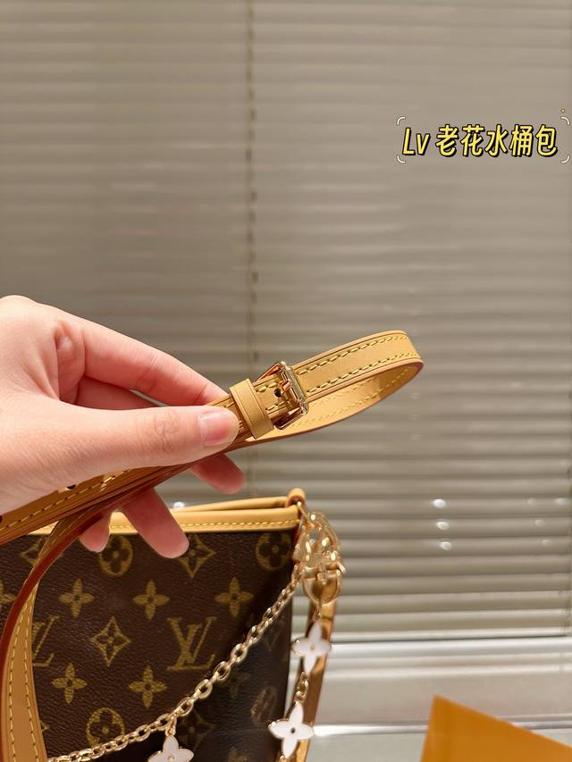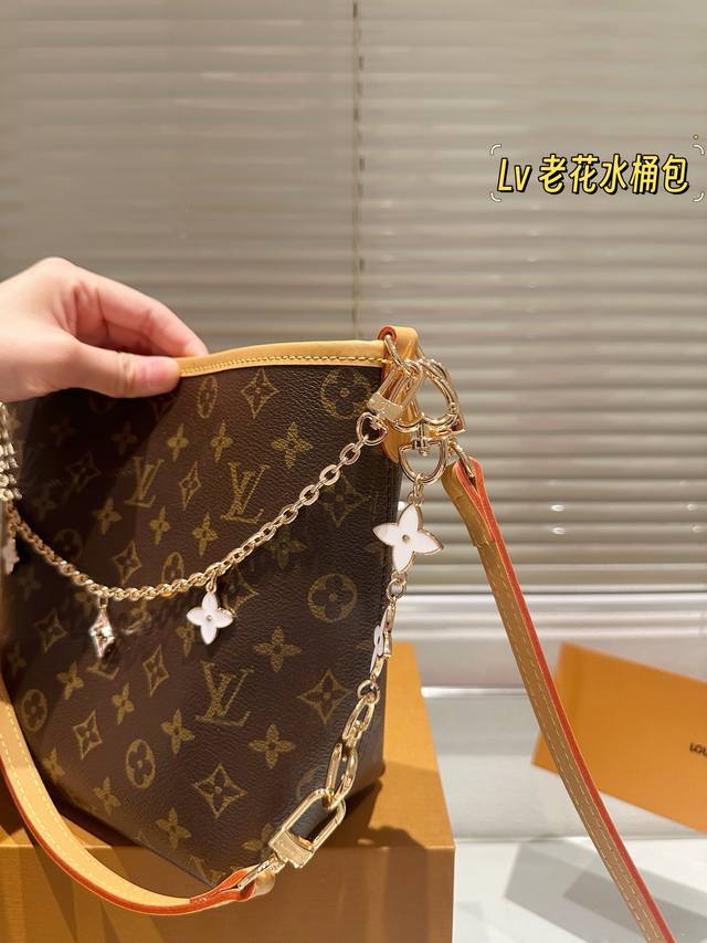 Lv Bucket Bag Remodeled DDD Lv Originally a small bag included with a larger bag, this bag features classic DDD Monogram canvas with a vegetable-tanned reddish-brown lining, simple and practical. The remodeled version includes a beeswax-colored shoulder strap and a metal chain, adding a retro yet fashionable touch. The size is just right, easily holding a phone, lipstick, and keys. The adjustable shoulder strap allows for both shoulder and crossbody wear, making it suitable for both commuting and casual occasions. The remodeled version is more practical and versatile. 20