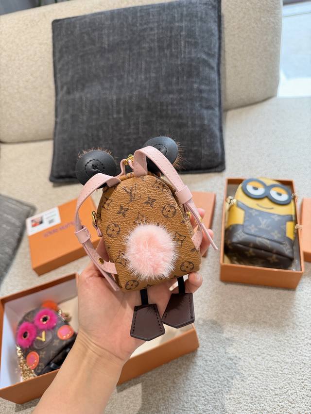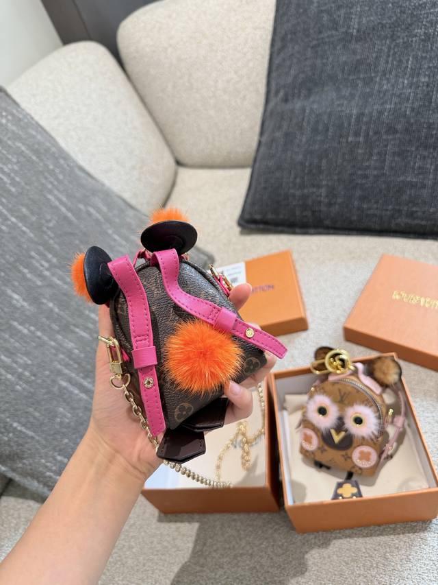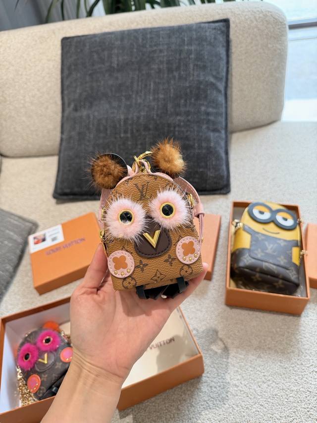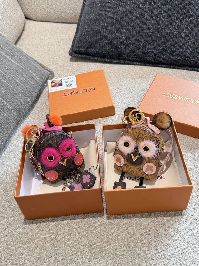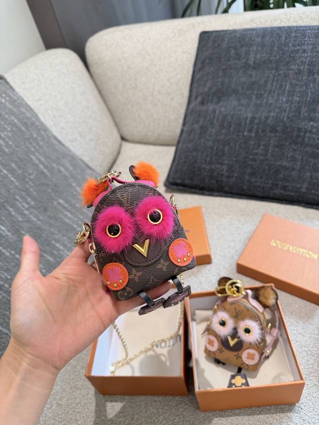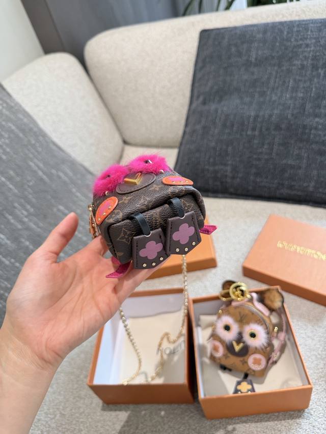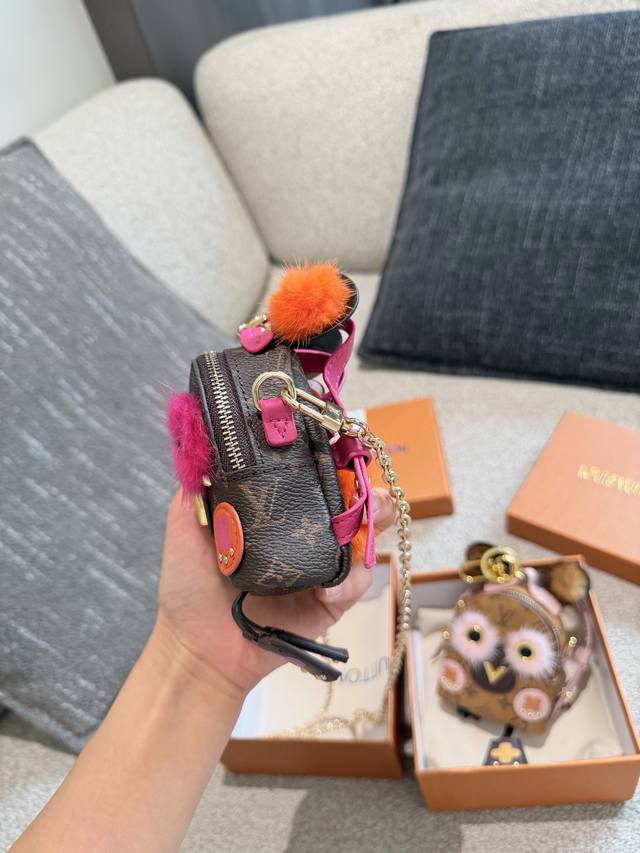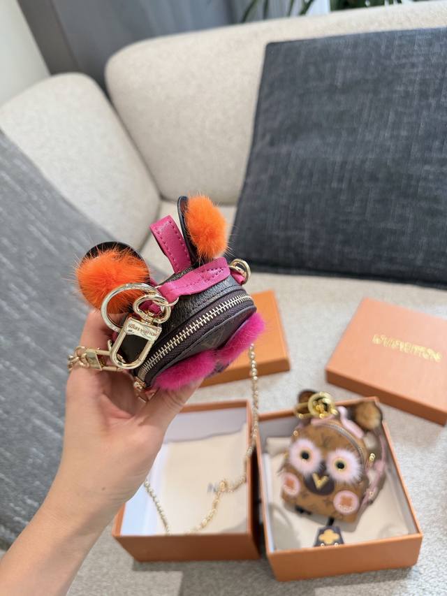 LV Mink Owl Coin Purse, DDD This LV mink owl coin purse is made of classic Monogram canvas and mink fur, with exquisite details. It's a mini backpack style with a metal zipper and chain, which can be used as a keychain or worn crossbody