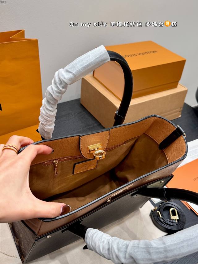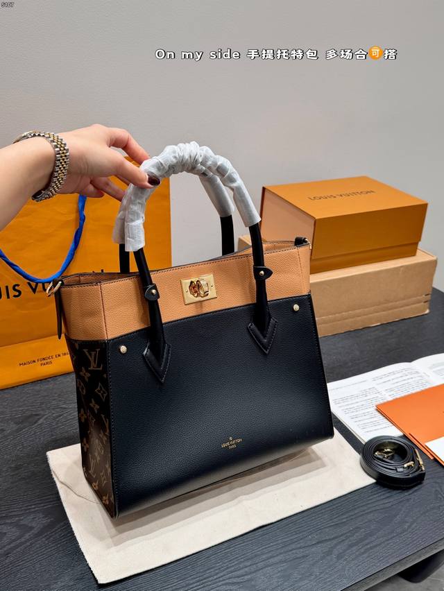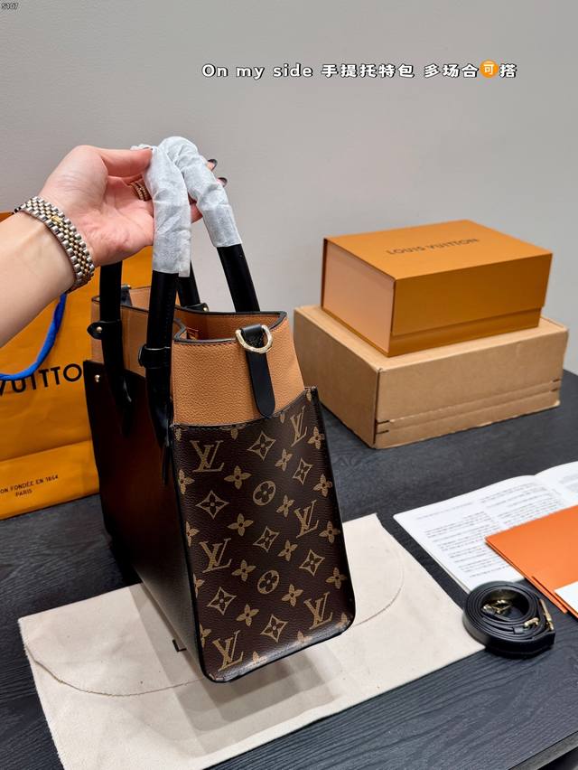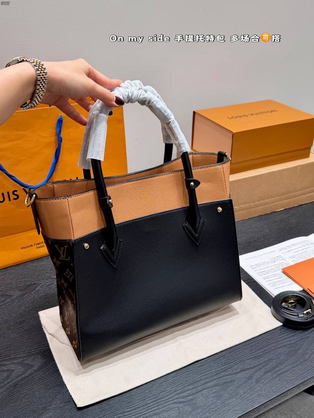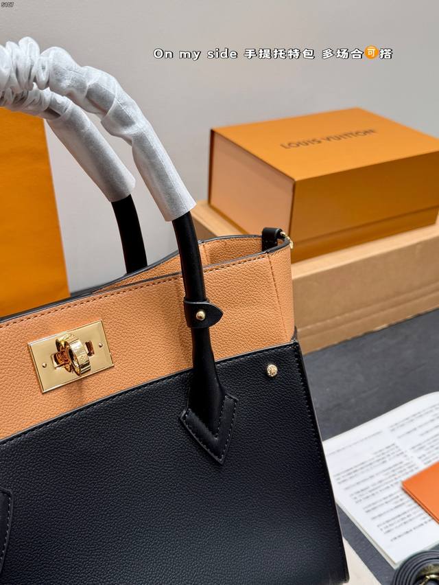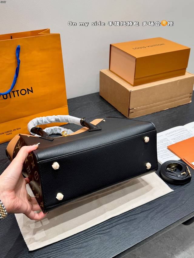 Lv On My Side Handbag Tote: Elegance and practicality combined. The On My Side looks formal, but is actually quite cute and versatile. It features a stylish combination of cowhide and monogrammed leather, making it a versatile and fashionable choice. It can be carried by hand or over the shoulder; it has the style you desire. Dimensions: 30cm.