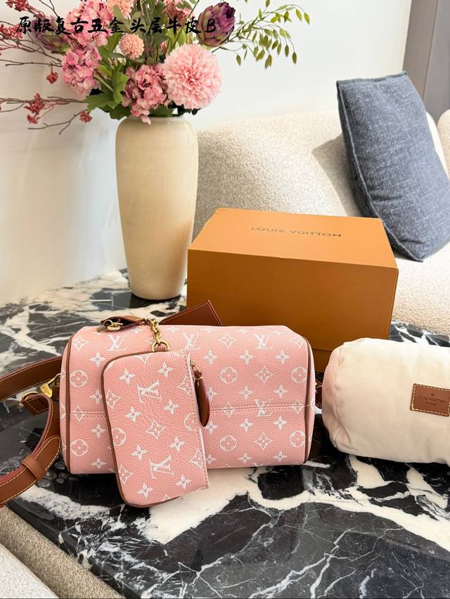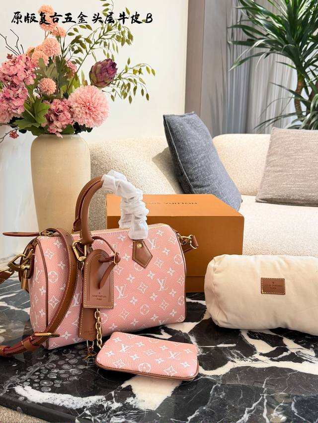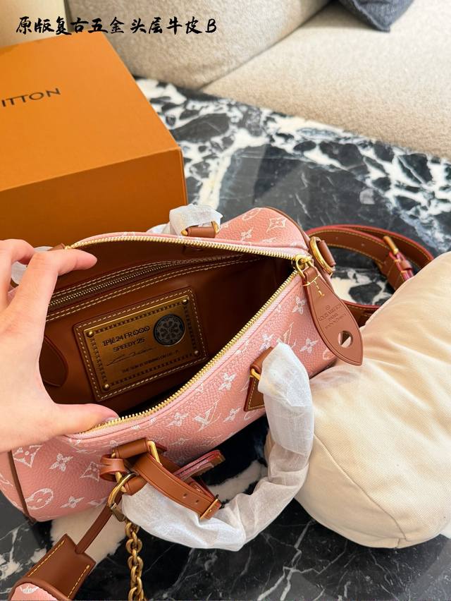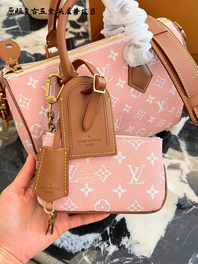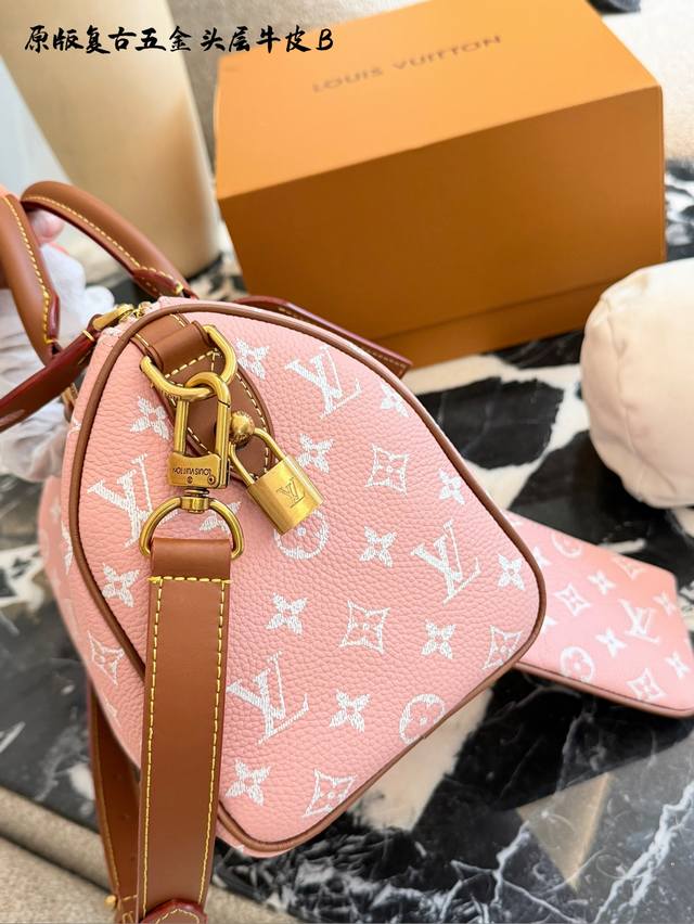 Lv Speedy p30 Pink HandbagDDD The Lv Speedy p30 pink handbag is a limited edition from the L Ouitton x Nigo Fall/Winter 2025 collaboration. It features classic Monogram canvas in a cherry blossom pink color scheme, complemented by caramel leather handles and a chain, exuding a sweet and retro vibe. At 25cm, it has a moderate capacity, suitable for commuting or short trips. Inspired by Lv's historical workwear elements, it blends modern streetwear style, making it both practical and collectible. It includes a detachable pouch for flexible storage, and it's a perfect addition to light spring and summer outfits.DDD