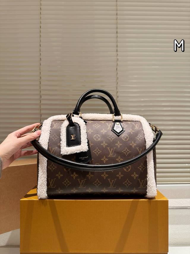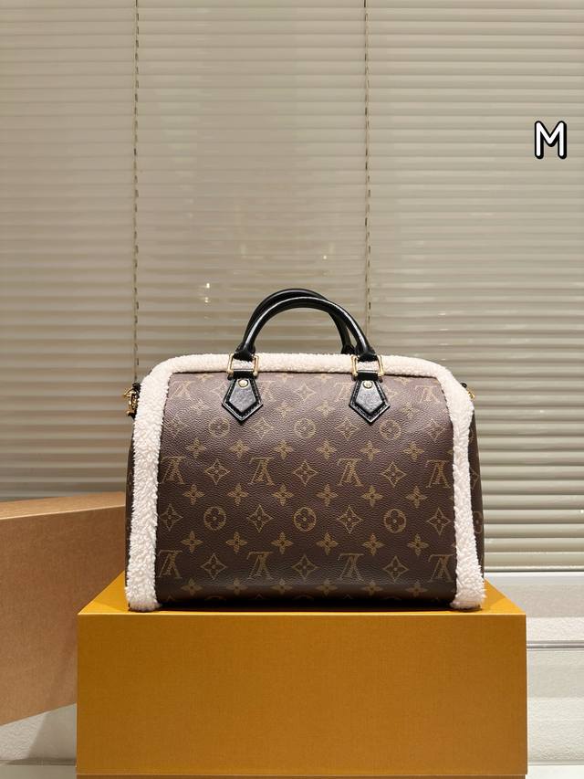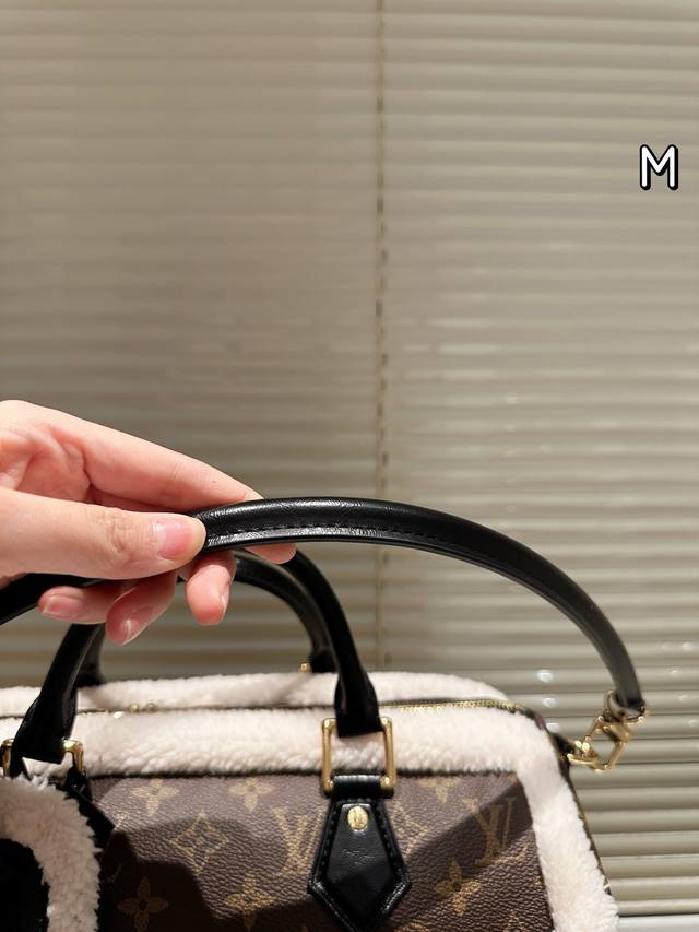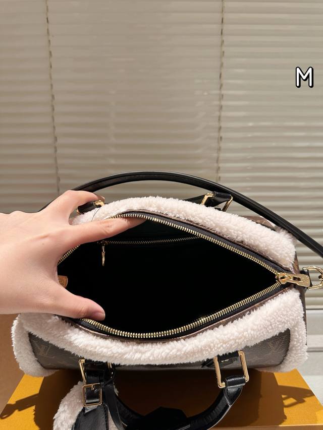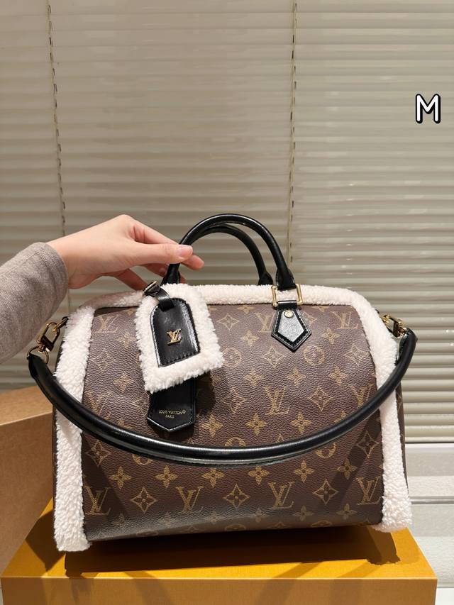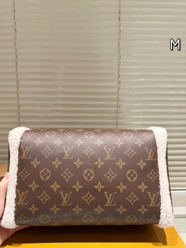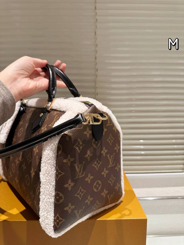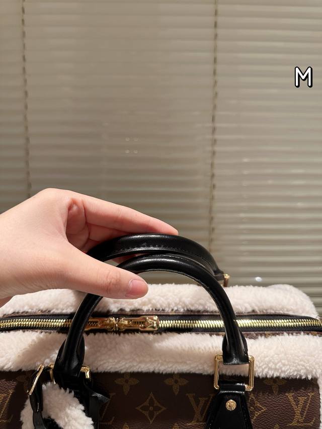 Original Leather Double Box Bag DDD LV Ski Series Speedy 30 Plush Bag DDD LV Ski Series Speedy 30 Plush Bag, classic Monogram canvas + white lamb's wool, full of wintery vibes! Black leather shoulder strap + chain, can be carried by hand or crossbody, practical and stylish. 30cm capacity, suitable for commuting and short trips, the plush material is super soft, warm and stylish to carry out in winter~ Limited edition, ski-themed inspiration, a must-have for autumn and winter outfits, the fashion world is praising it! DDD