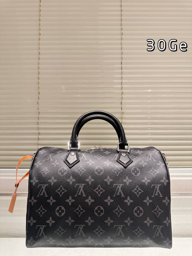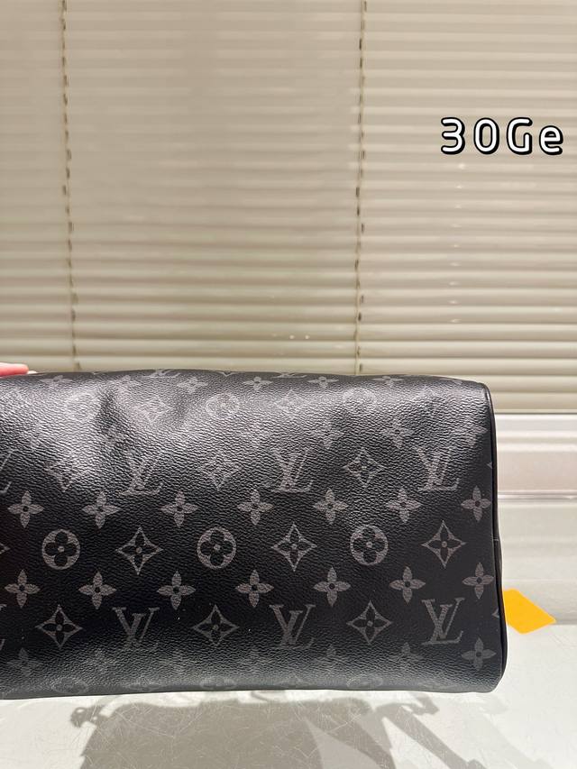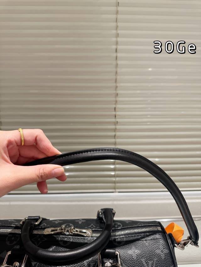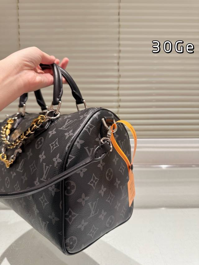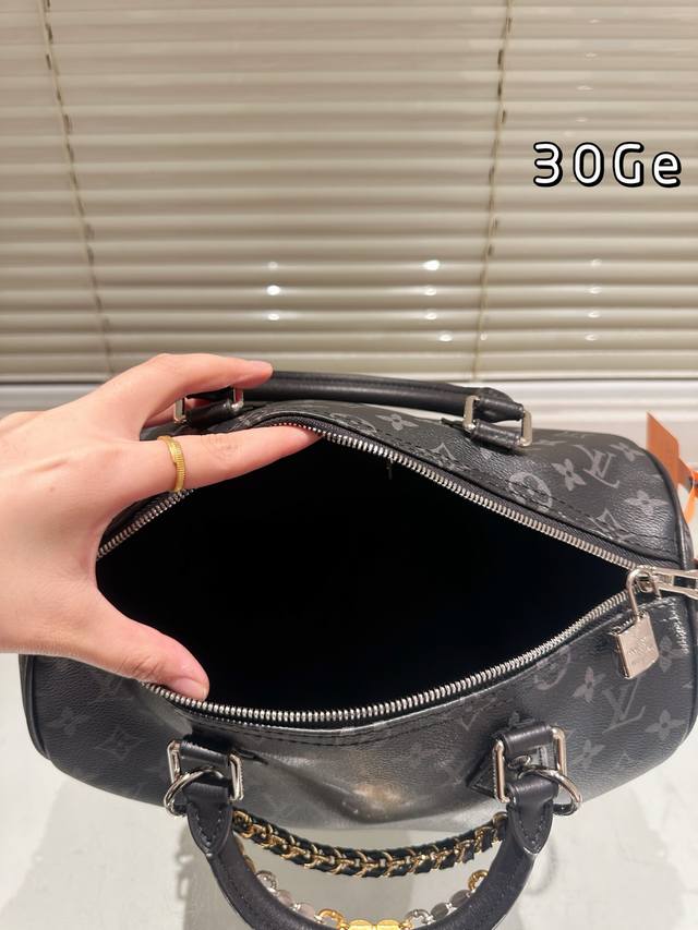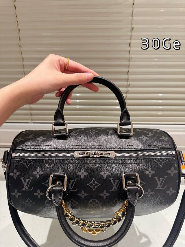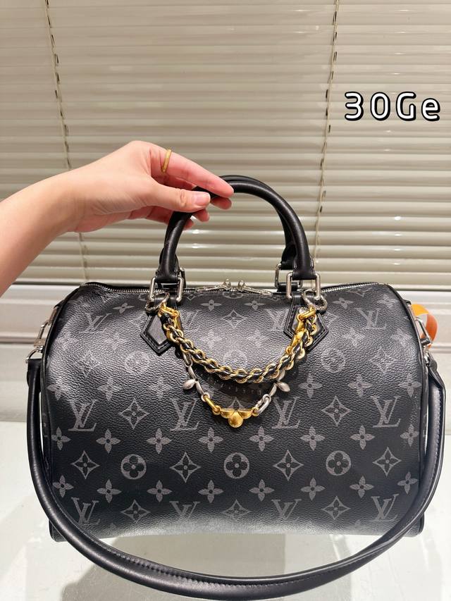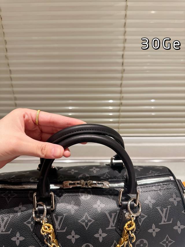 LV Speedy Soft 30 black monogram bag features the classic Monogram pattern on a black background, exuding understated elegance. Made of soft cowhide leather, it's incredibly supple to the touch, lightweight, and perfectly sculpted, making it ideal for daily commutes or short trips! With a generous 30cm capacity, it can easily hold a laptop, tablet, and umbrella. The silver chain and black leather strap allow for hand-carrying or crossbody wear, making it versatile and easy to match with any style. This is the first time the black monogram series has released a women's bag, easily complementing both formal suits and casual hoodies. Practical and distinctive, a must-have for fashionistas!