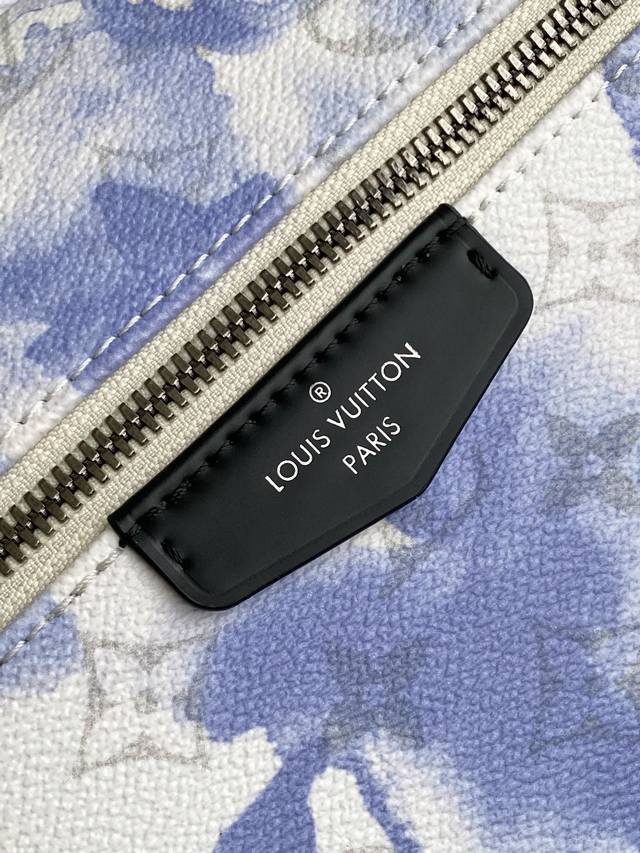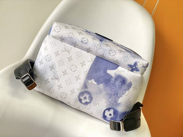 163C01 Chip, Premium Original M45760 Discovery Backpack in Watercolor Blue. Designed with Monogram florals and LV monogram, this backpack draws inspiration from classic preppy backpacks and features an iPad pocket. Adjustable leather shoulder strap ensures comfortable carrying. Monogram Watercolor Blue coated canvas, cowhide trim, fabric lining, metal hardware, adjustable shoulder strap, double zipper closure, zippered front compartment, and internal kangaroo patch. Dimensions: 37 x 40 x 20 cm (