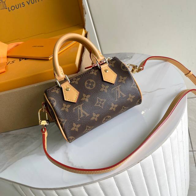163C01 Chip Version Internal Price p Model Number: M81085 Original Enhanced Edition Exclusive Real Photos Background Image The Nano Speedy handbag embodies the classic Louis Vuitton Speedy handbag silhouette, crafted from Monogram canvas with a sleek design accented by distressed cowhide leather details and hardware. The handles and removable, adjustable shoulder strap allow for versatile styling possibilities. Model Number: M81085