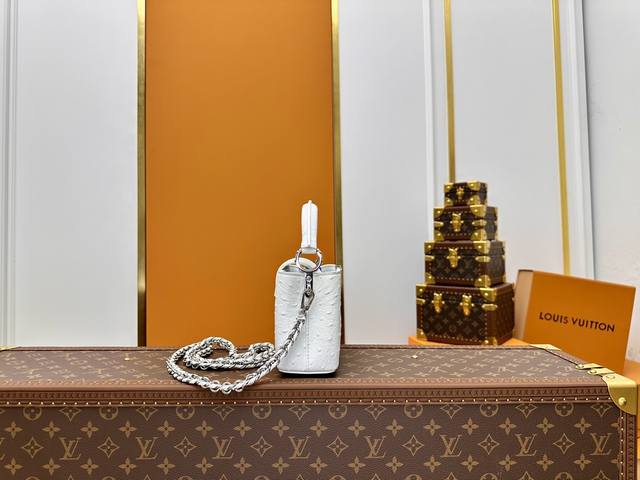 All-steel hardware, variable code chip, premium quality, complete packaging. M83115 White Capucines Mini Ostrich Pattern Handbag with Woven Chain. The Capucines handbag series was launched in 2013, named after the Paris street where Louis Vuitton first opened its store in 1854. This Capucines mini handbag is made of full ostrich-patterned Taurillon leather, incorporating multiple brand elements: leather-covered LV logo, a jewel-like handle inheriting the classic hard-pack design, and a unique flap featuring Monogram flowers. It can be carried by hand or crossbody with the shoulder strap. Detailed Features: 16 x 11.3 x 6.5 cm (Length x Height x Width); Taurillon cowhide leather; Taurillon cowhide trim; cowhide lining; metal hardware; flap can be placed inside or outside; interior zip pocket and patch pocket; metal bottom studs; shoulder strap: detachable.