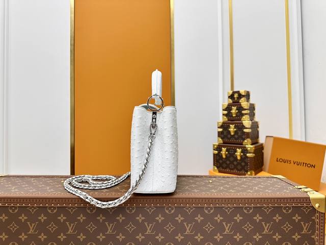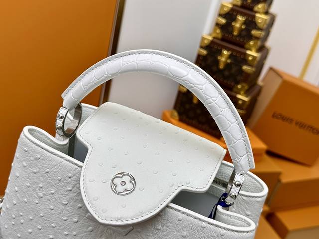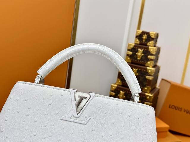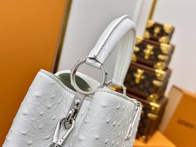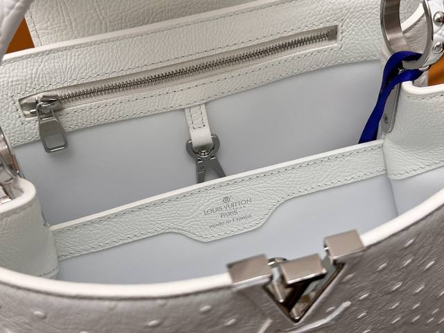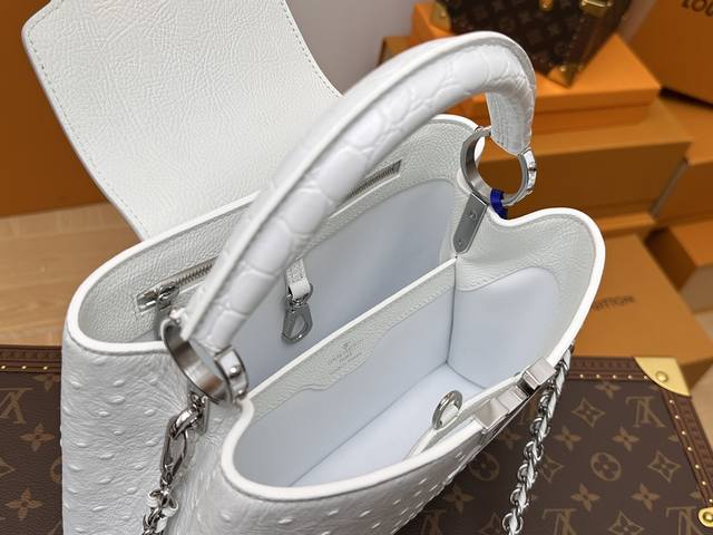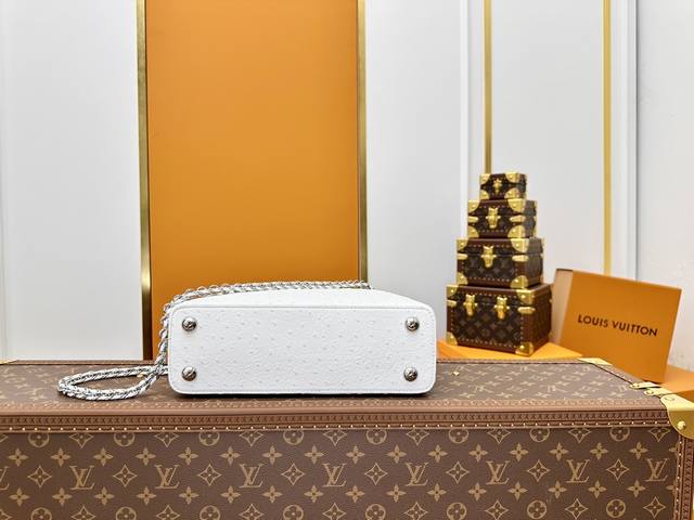 All-steel hardware, variable code chip, premium quality, complete packaging. M83117 White Capucines Medium Ostrich Pattern Handbag with Woven Chain. The Capucines handbag series was launched in 2013, named after the Paris street where Louis Vuitton first opened its store in 1854. This Capucines BB handbag is made of full ostrich pattern Taurillon leather, incorporating multiple brand elements: leather-covered LV logo, jewel-like handles inheriting the classic hard-pack design, and a unique flap featuring Monogram flowers. It can be carried by hand or crossbody with the shoulder strap. Detailed Features: 27 x 17.3 x 9 cm (Length x Height x Width); Taurillon cowhide leather; Taurillon cowhide trim; cowhide lining; metal hardware; flap can be placed inside or outside; interior zip pocket and patch pocket; metal bottom studs; shoulder strap: detachable.