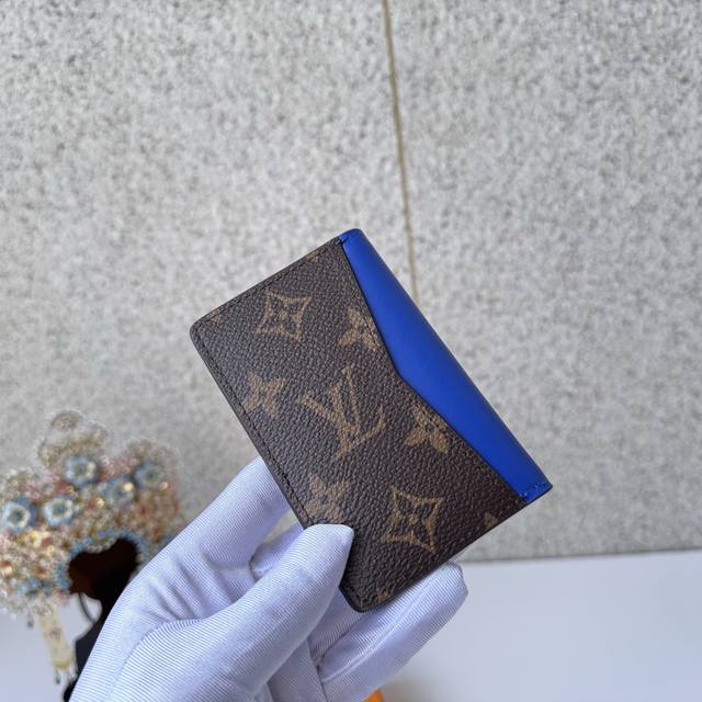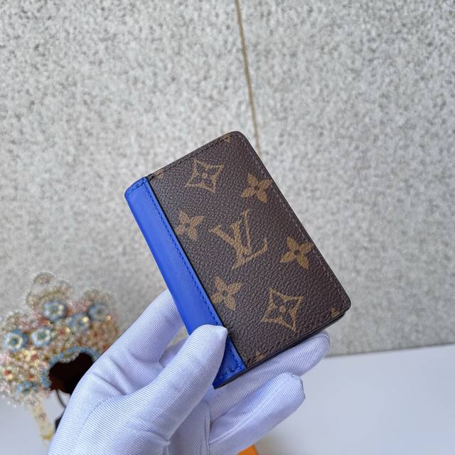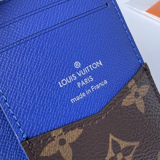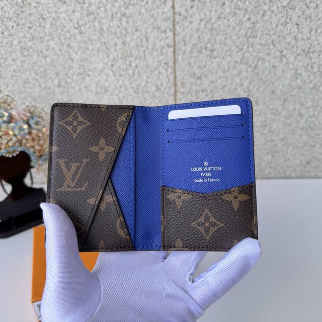 Authentic, premium 12833 blue wallet. Compact in size, it fits easily into any pocket, a charming "Organizer de poche." Crafted from Monogram Macarthur canvas and featuring a dyed cowhide leather back, this unique design is part of the "Louis Vuitton Color Mania" collection. Dimensions: 7.5 x 11.1 x 1 cm.