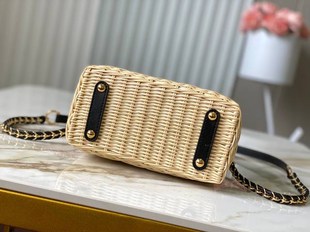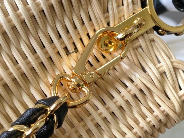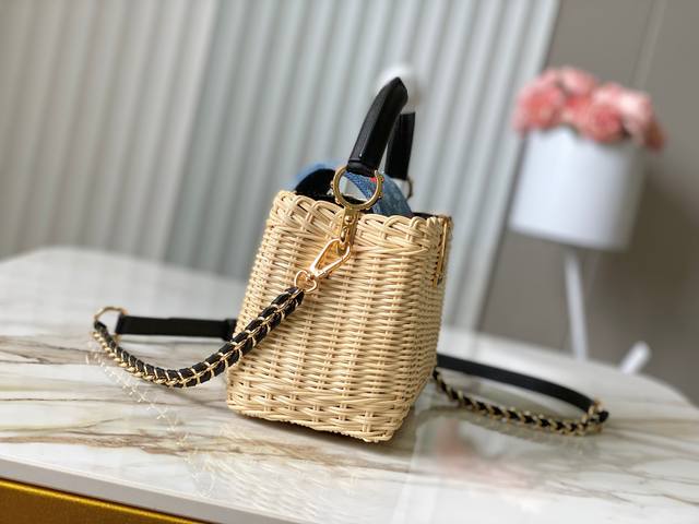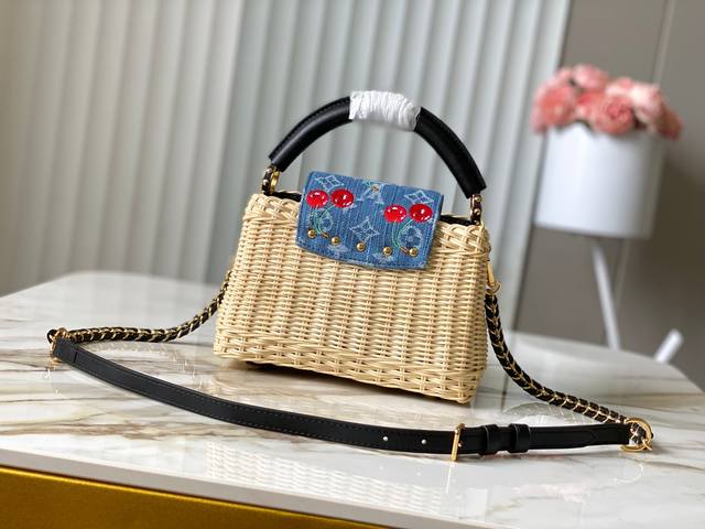 Authentic raw materials, premium dynamic chip, Lv x Tm Capucines handbags M14295 M48865, black cherry bamboo basket. This Capucines handbag features striking details from the Louis x Murakami replica collection, with fresh elements highlighting the trendy style. The rattan body complements the handles, woven shoulder strap, and Lv monogram. The top flap is delicately embellished with a cherry pattern. Size: 21 * 14 * 8 cm