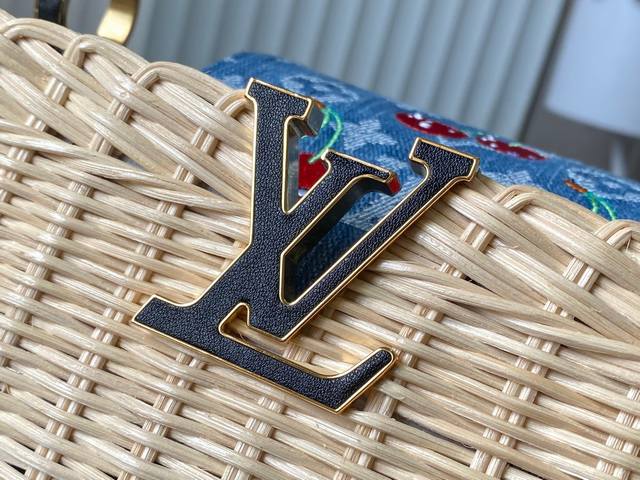 Authentic raw materials, premium dynamic chip, Lv x Tm Capucines handbags M14295 M48865, black cherry bamboo basket. This Capucines handbag evokes the Louis x Murakami replica series with striking details, featuring fresh elements that enhance the trendy style. The rattan body complements the handles, woven shoulder strap, and Lv monogram. The top flap is delicately embellished with a cherry pattern. Size: 27 * 18 * 9 cm