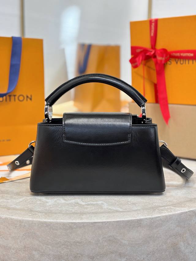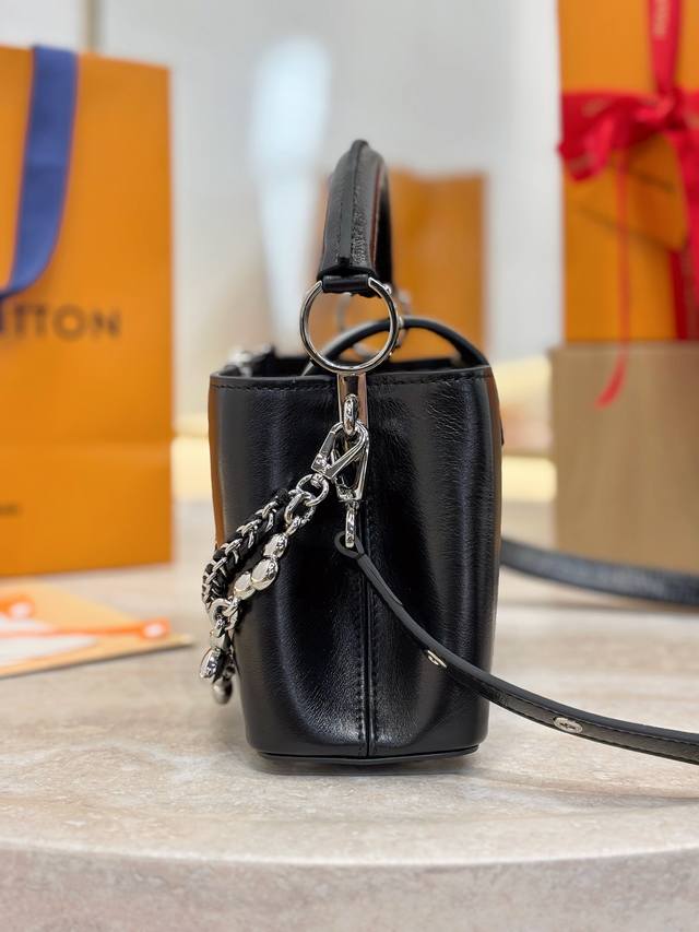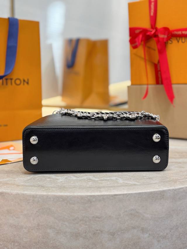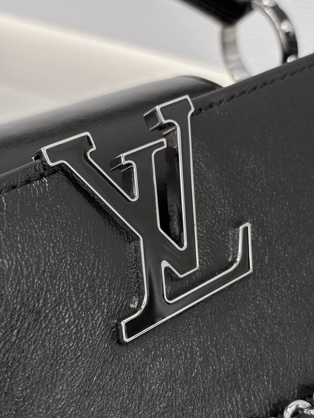 Capucines East-West Bb Handbag DDD M25492 Black 26.5Cm DDD This Capucines East-West Bb handbag draws color inspiration from the Louis Vuitton Beauty collection, subtly exuding an elegant air. The pleated leather body releases an avant-garde feel, paired with a flap that can be folded inwards or outwards, featuring the L* logo to highlight the brand's identity. The shiny chain can be detached at will. Size: 26.5X14X8Cm DDD