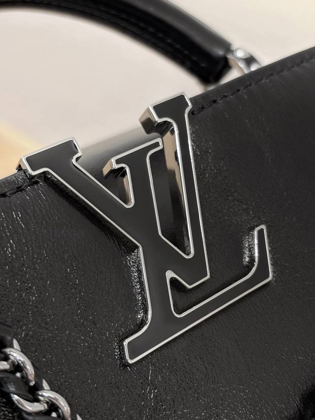 Capucines East-West Mini Handbag DDD M25492 Black 22cm DDD This Capucines East-West mini handbag draws color inspiration from the Louis Vuitton Beauty collection, subtly exuding an elegant air. The pleated leather body releases an avant-garde feel, paired with a flap that can be folded inwards or outwards, and the L* logo highlights the brand's signature. The shiny chain can be detached at will. Size: 22X12X8cm DDD