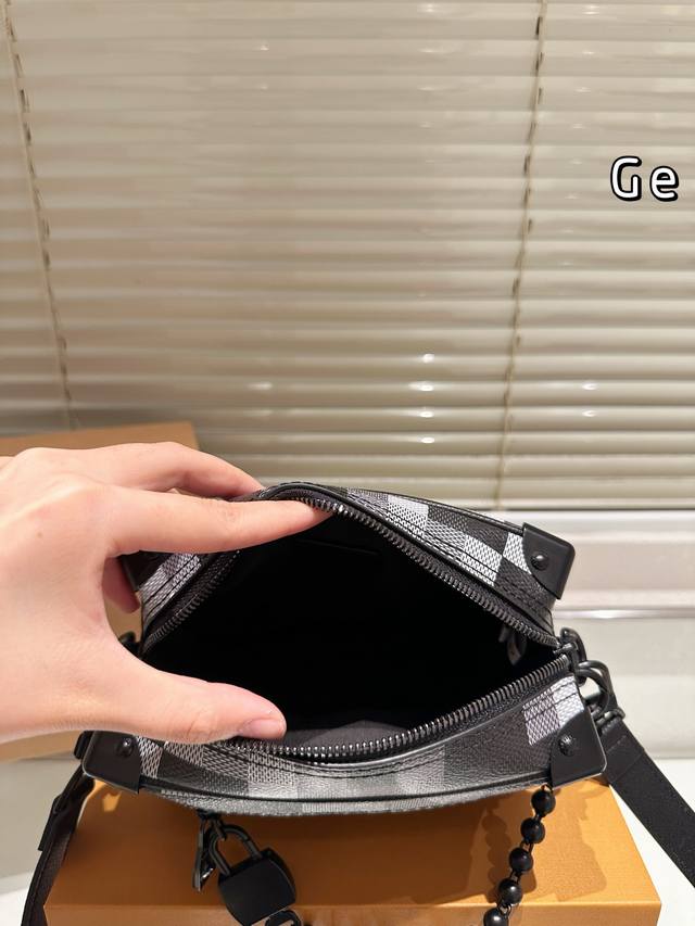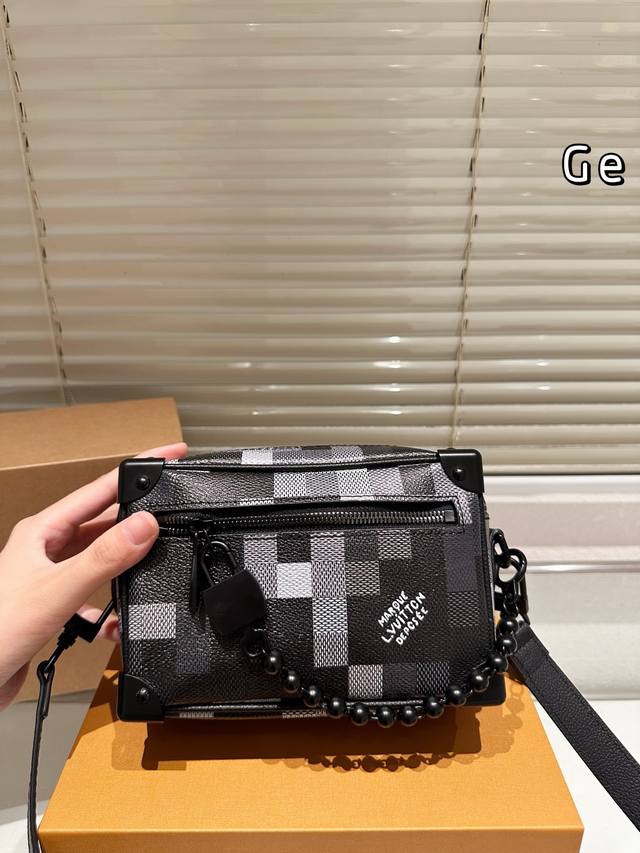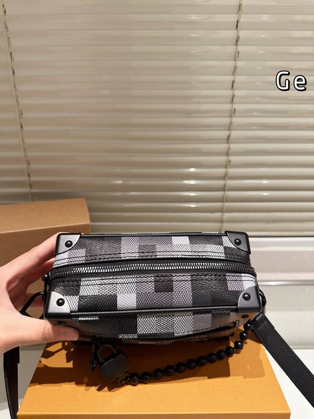 . Its squared-off shape and reinforced corners evoke the brand's classic hardshell trunk design, while its robust chain is suitable for shoulder carry.