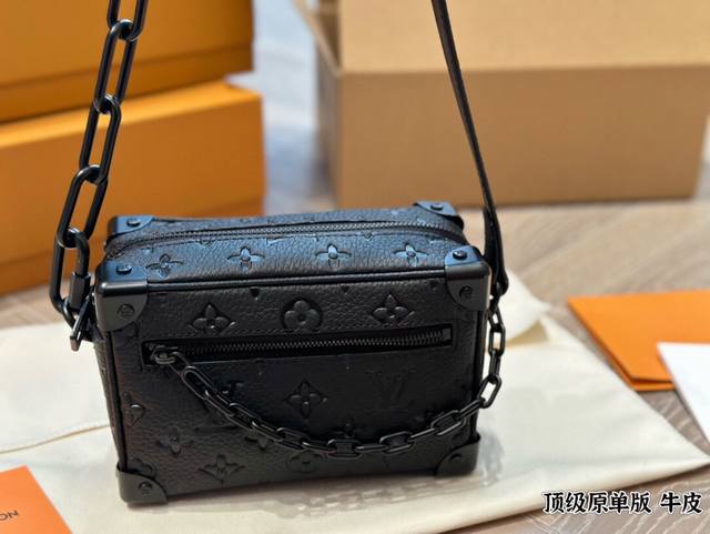 . Soft Trunk Monochrome Box Bag. Men's Artistic Director Virgila Bloh has given the Softtrunk bag a classic Louis Vuitton look. This box-shaped bag features sharp angles and metal corners, vividly embodying Louis Vuitton's trunk-making tradition. The gold chain connected to the zipper exudes a modern flair. This monochrome box features a reverse monochrome color scheme from Louis Vuitton, paired with stylish hardware, perfectly recreating classic elements like rivets and buckles found on luggage. The monochrome box bag is versatile. When worn, it creates a low-key, stylish, and powerful bag. It can be worn on one shoulder or crossbody. The connection between the corners of the bag and the chain creates a particularly strong sense of craftsmanship. The bag's capacity is also ample, and the zipper is gentle, allowing you to flip through it without rubbing your hands. 18cm.