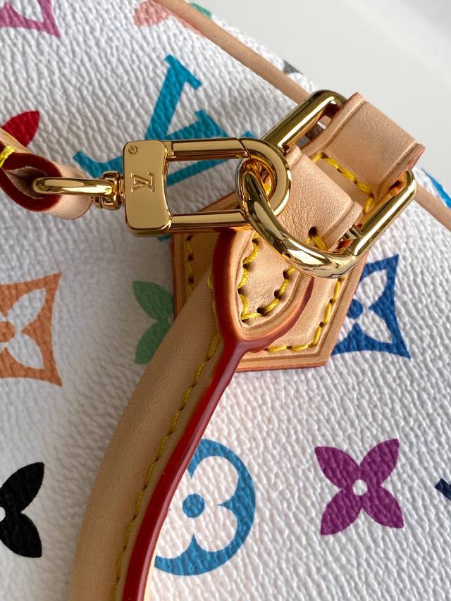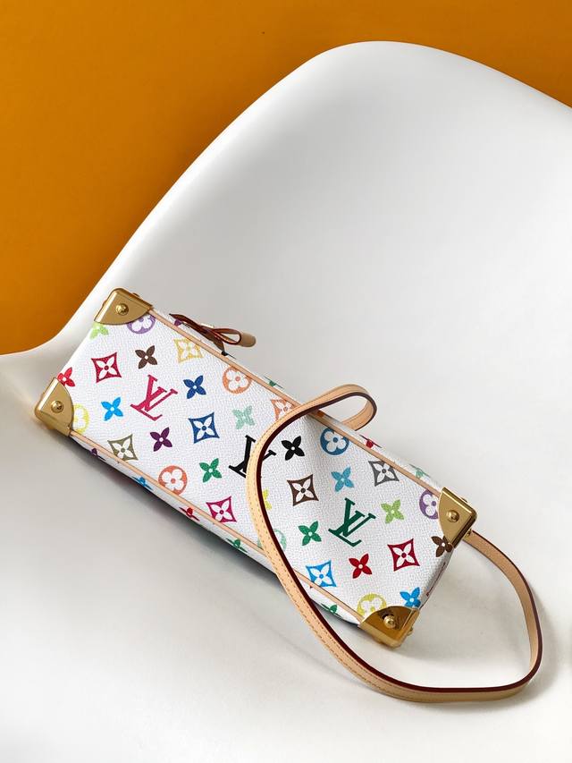 Dynamic 163 M13084 This Handbag East West is from the Louis Vuitton x Takashi Murakami reissue collection, depicting the full Monogram pattern in the artist's signature rainbow hues. The horizontally oriented lines are smooth, with top handles, studded side straps, a detachable and adjustable shoulder strap, and an LV x Tm key pouch incorporating cowhide leather details. The refined corners pay homage to the brand's traditional trunk design. 14 x 10 x 27 cm (H x W x Length) A.850 DDD