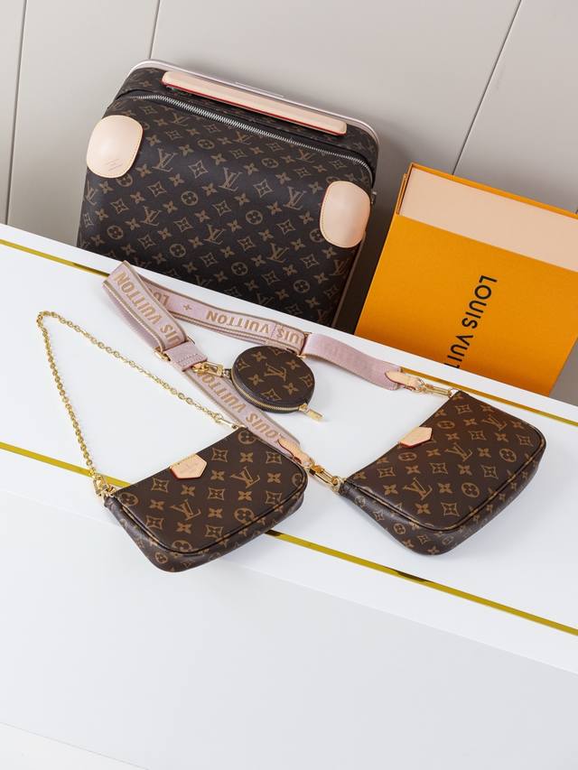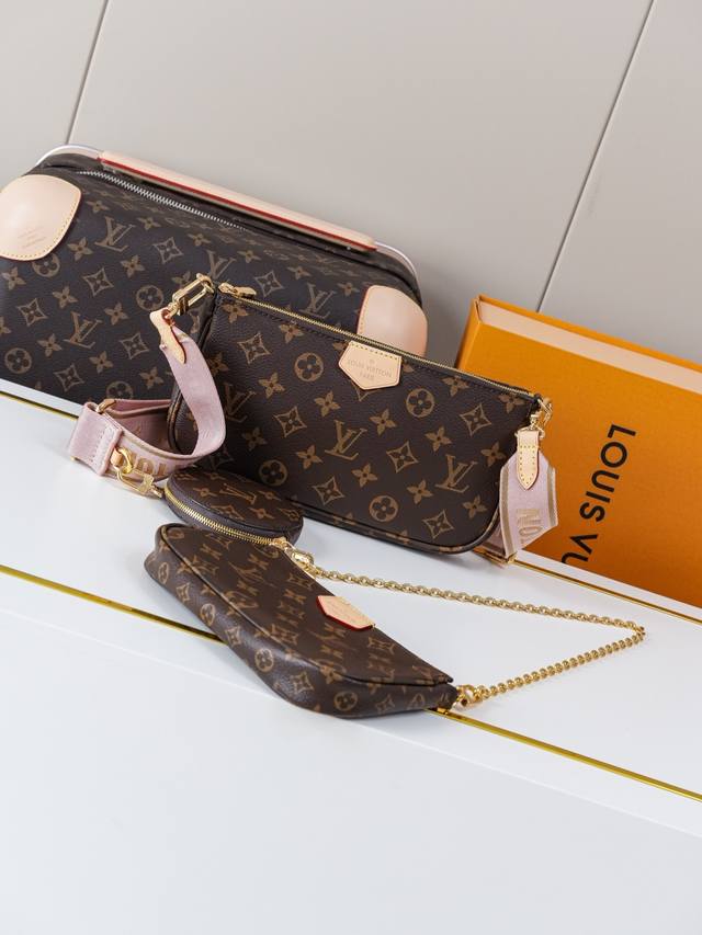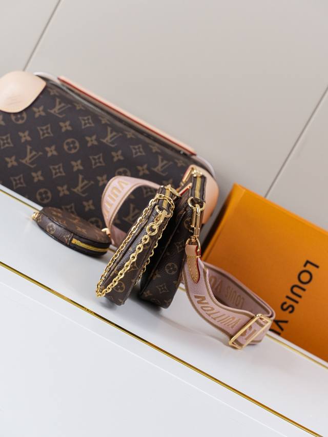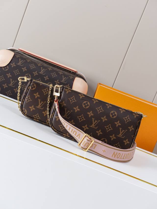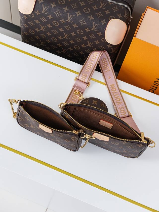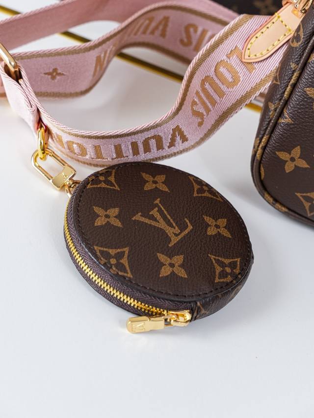 Dynamic 163C01 Chip M44840 Pink Top-grade Original Single Home Background Real Photo. This Multi Pochette Accessoires handbag combines a Pochette Accessoires clutch, a Mini Pochette Accessoires clutch, and a round coin purse. It is cleverly designed with multiple pockets and compartments in Monogram canvas, and the mini Monogram pattern is embellished on the sides. A detachable chain and adjustable Louis Vuitton jacquard shoulder strap allow for versatile carrying options. 24.0 x 13.5 x 4.0 cm (L x H x W)