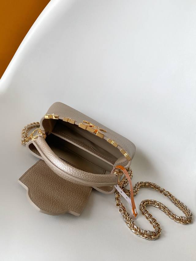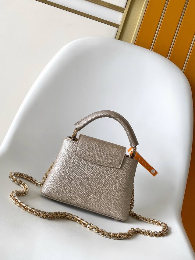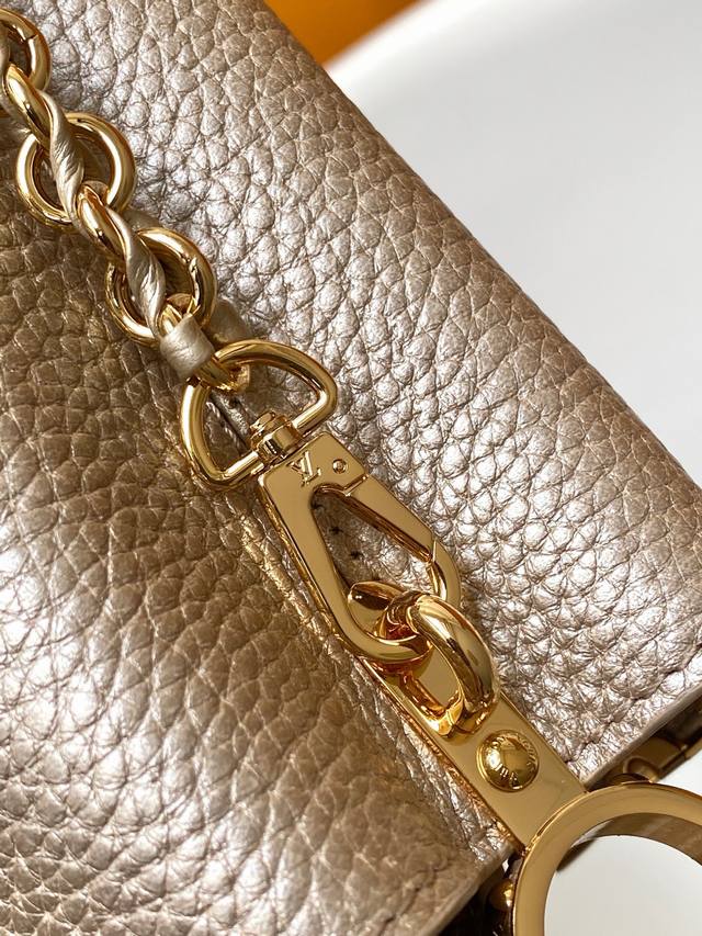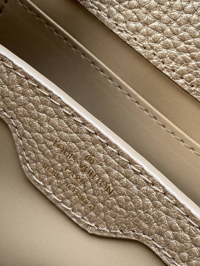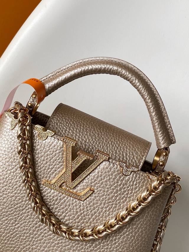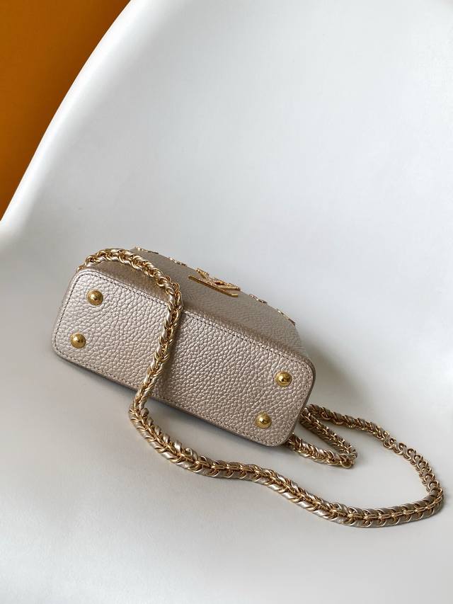 M24583 Metallic M24584 Red M24585 Black Gold Diamond Baker Flower. This Capucines Bb bag features a Monogram flower depicted in a shimmering shell , elegantly blossoming along the upper edge. The jewel-like Lv initials complement the bag, embodying Louis Vuitton's signature feminine style. A top handle and detachable slim shoulder strap offer versatile carrying options.