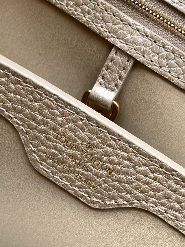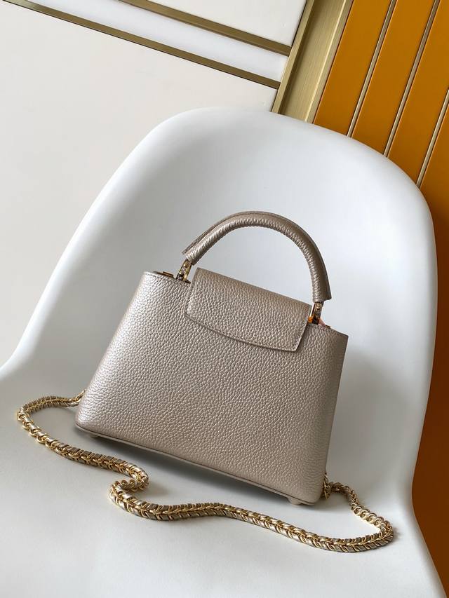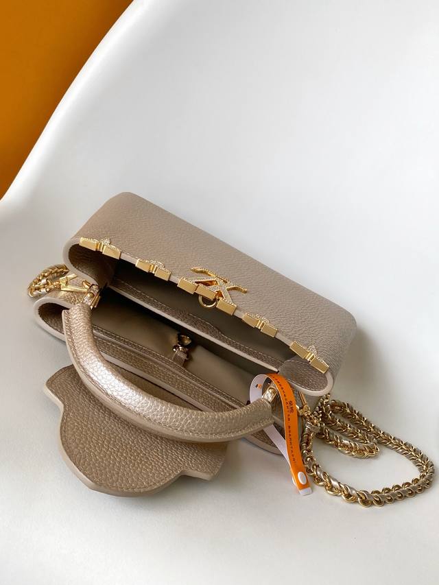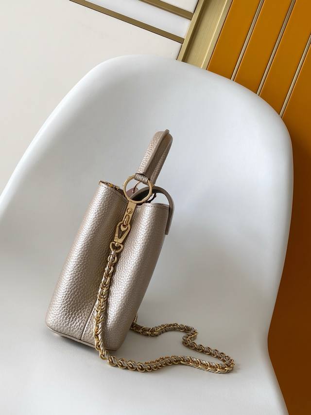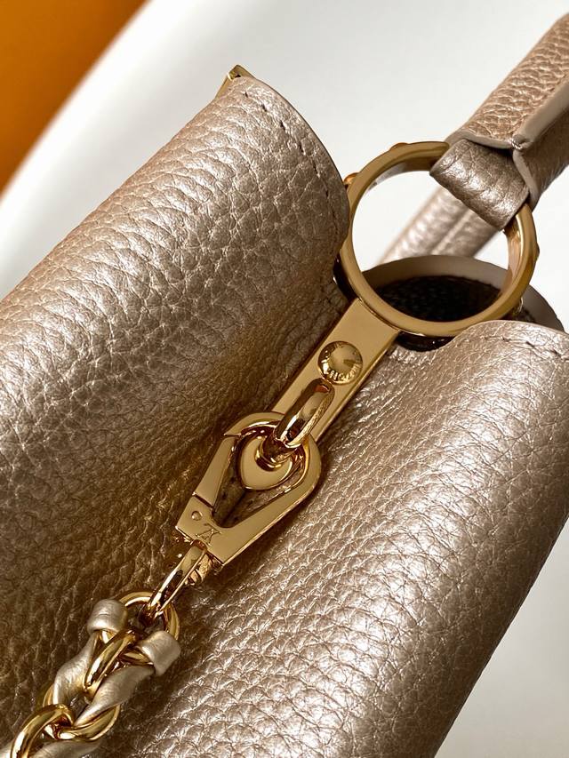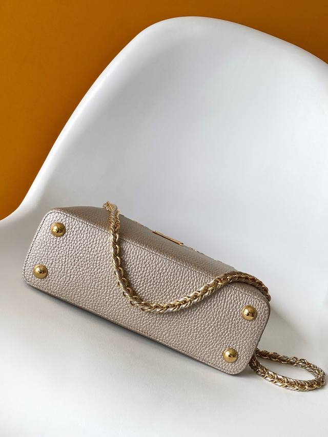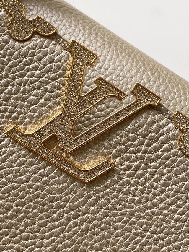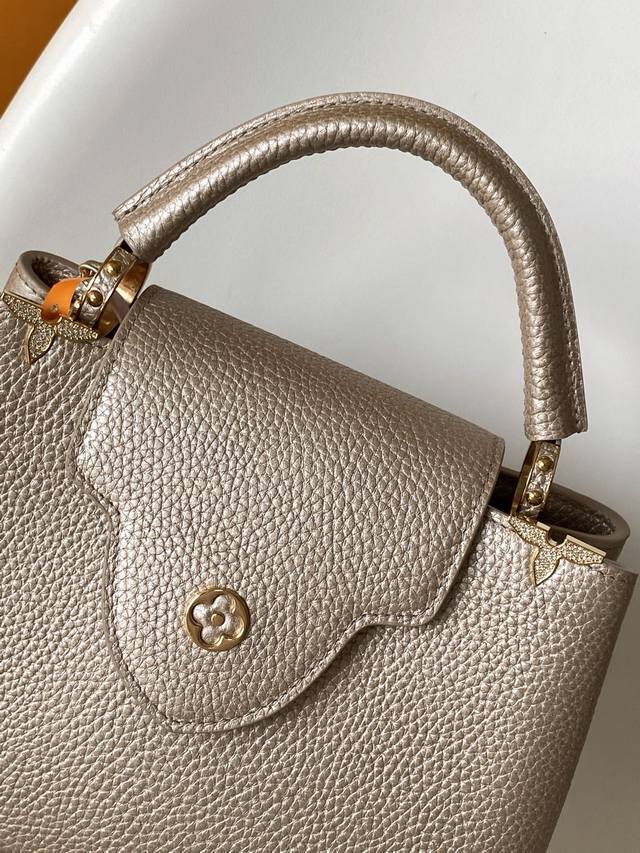 M24583 Metallic M24584 Red M24585 Black Gold Diamond Baker Flower. This Capucines Bb bag features a Monogram flower depicted in a shimmering shell, elegantly blossoming along the upper edge. The jewel-like Lv initials complement the bag, embodying Louis Vuitton's feminine style. A top handle and detachable slim shoulder strap offer versatile carrying options.
