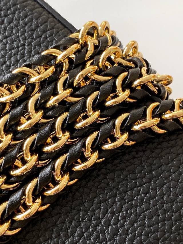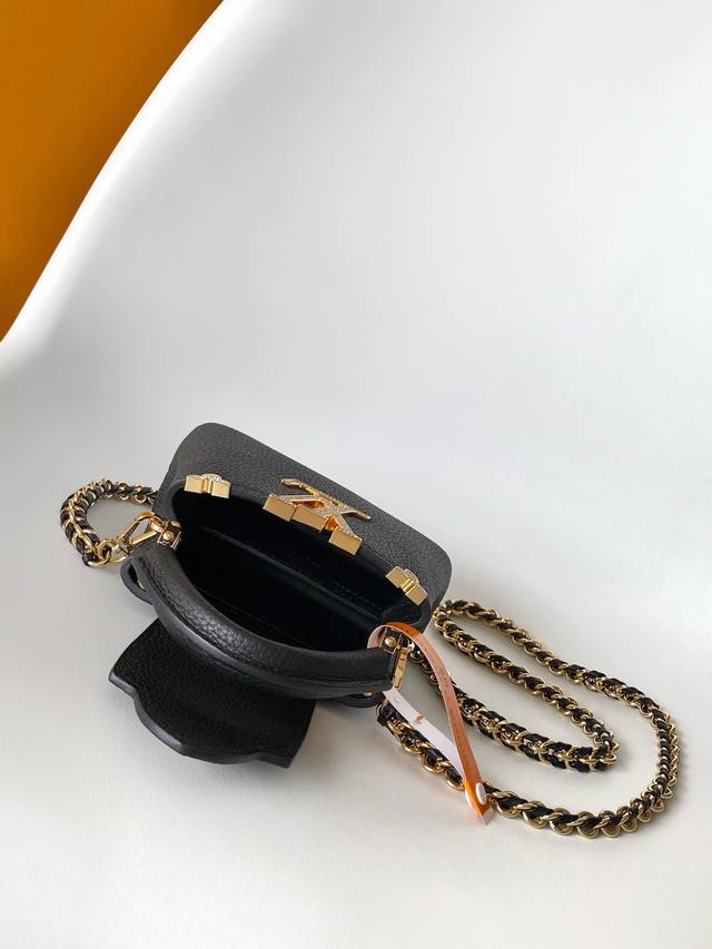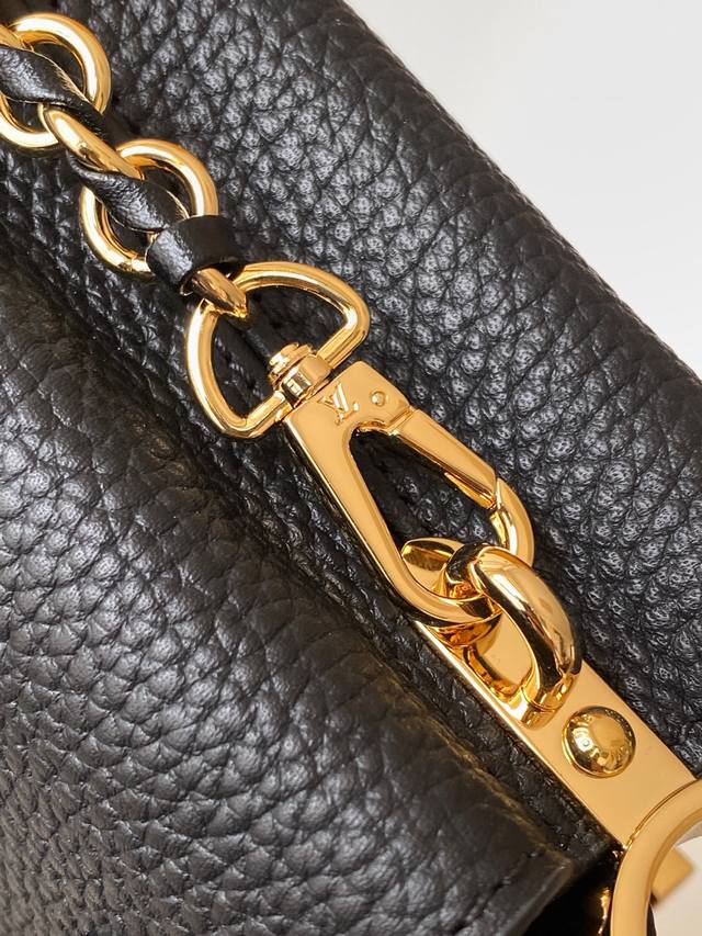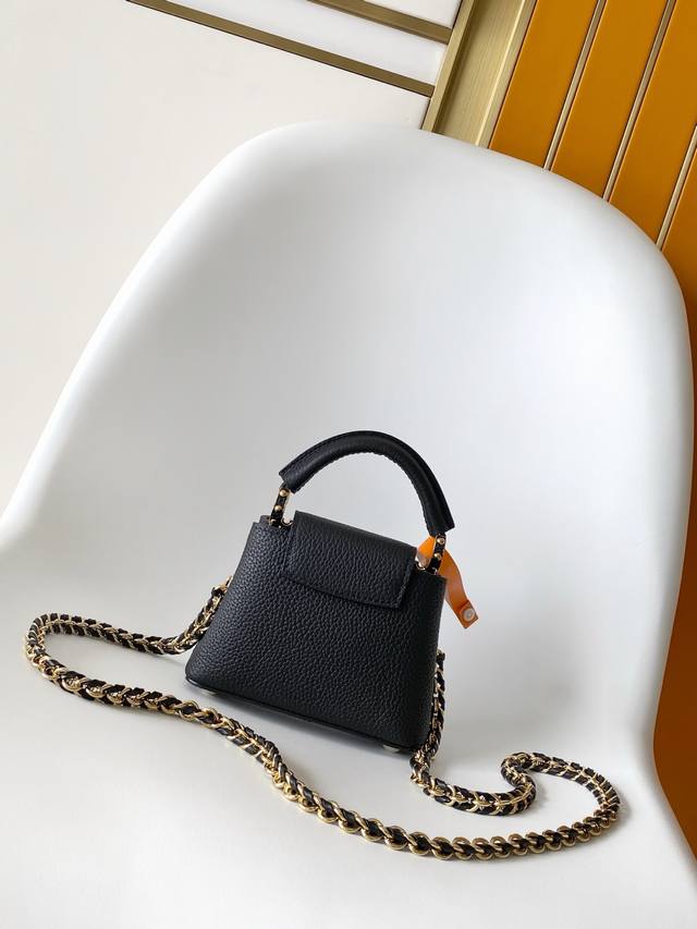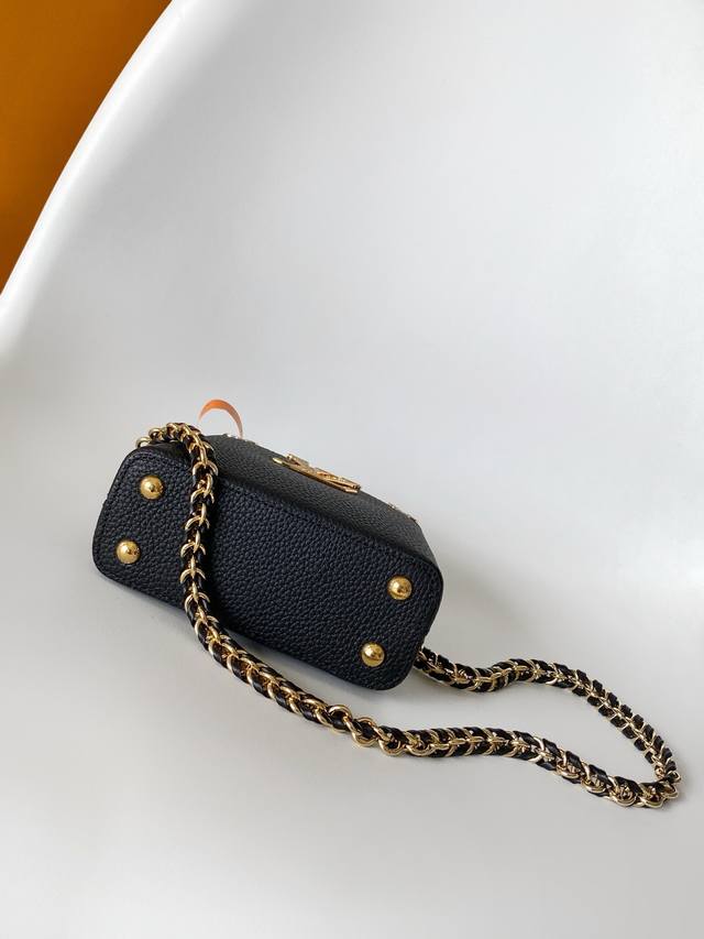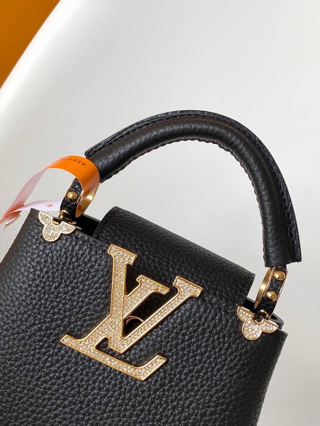 M24583 Metallic M24584 Red M24585 Black Gold Diamond Baker Flower. This Capucines Bb bag features a Monogram flower depicted in a shimmering shell, elegantly blossoming along the upper edge. The jewel-like Lv initials complement the bag, embodying Louis Vuitton's feminine style. A top handle and detachable slim shoulder strap offer versatile carrying options.