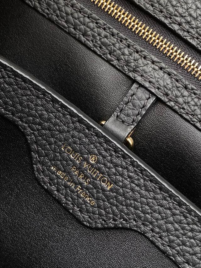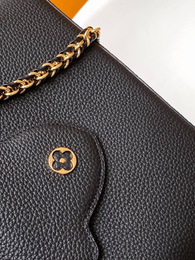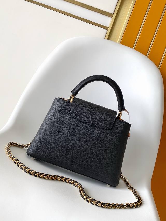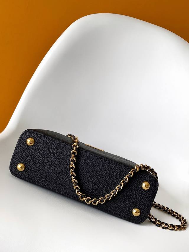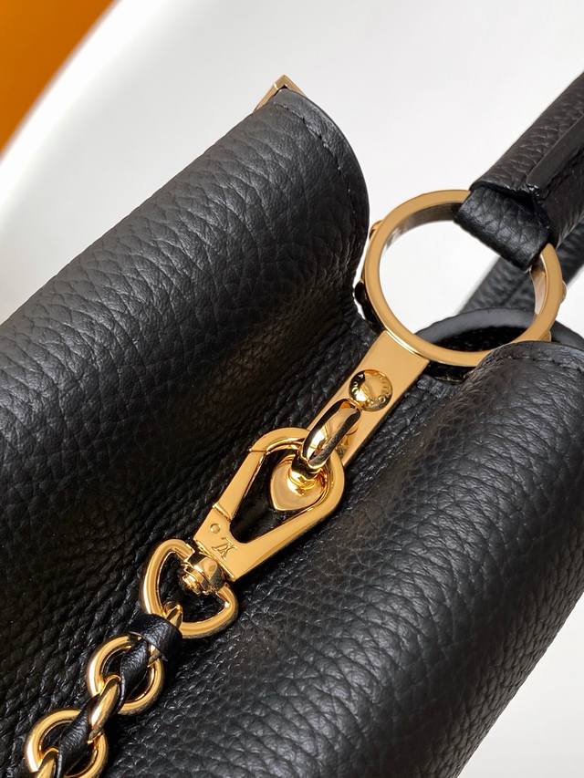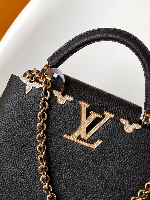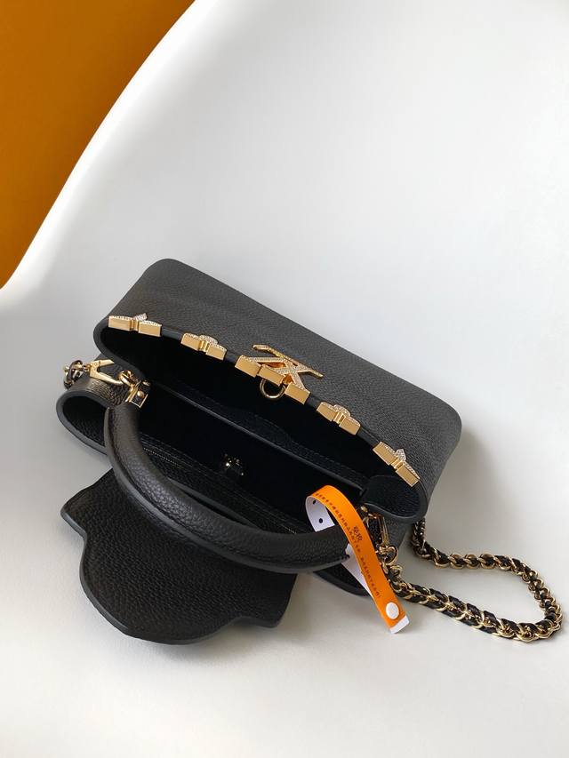 M24583 Metallic M24584 Red M24585 Black Gold Diamond Baker Flower. This Capucines Bb bag features a Monogram flower depicted in a shimmering shell, elegantly blossoming along the upper edge. The jewel-like Lv initials complement the bag, embodying Louis Vuitton's signature feminine style. A top handle and detachable slim shoulder strap offer versatile carrying options.