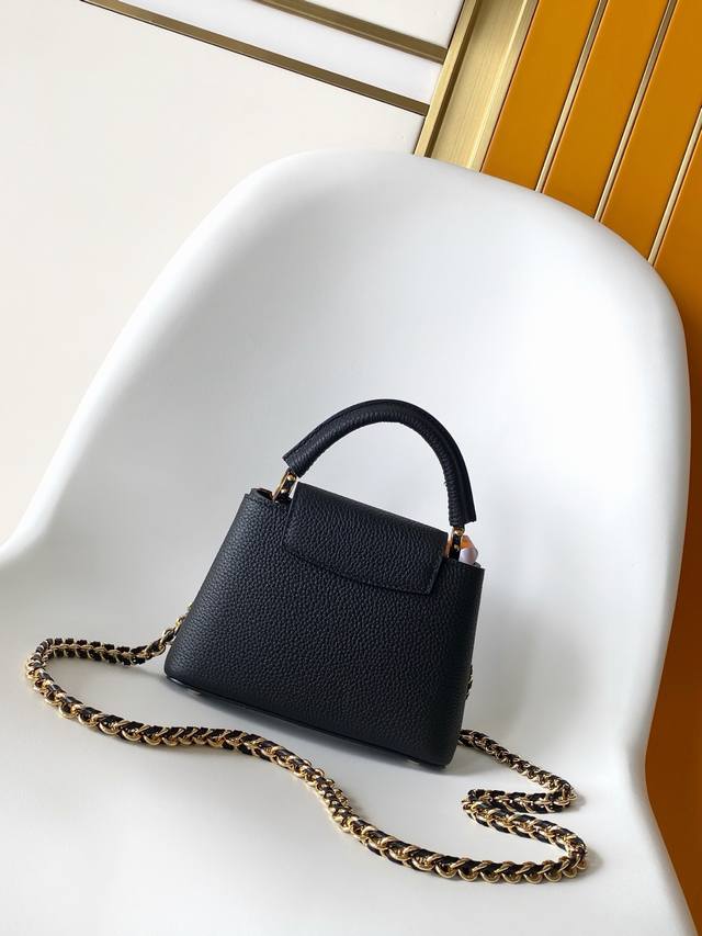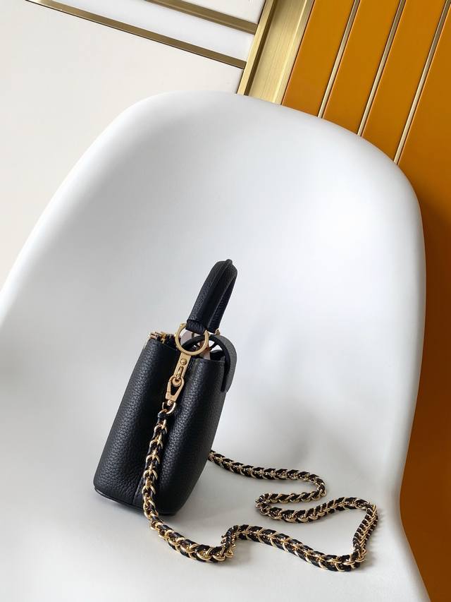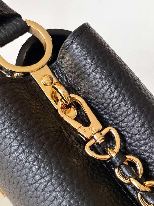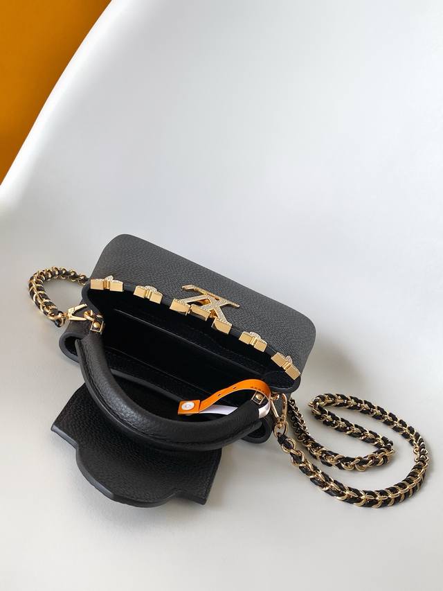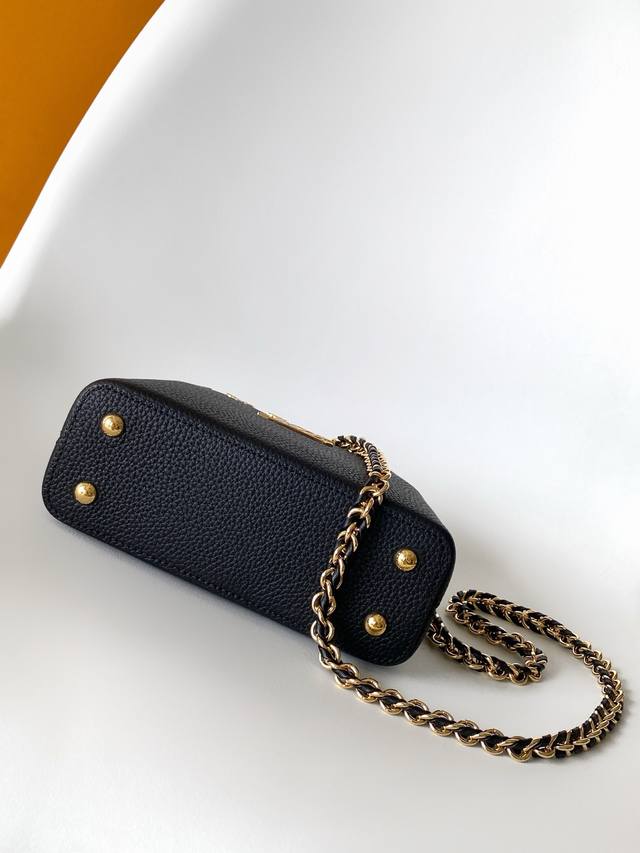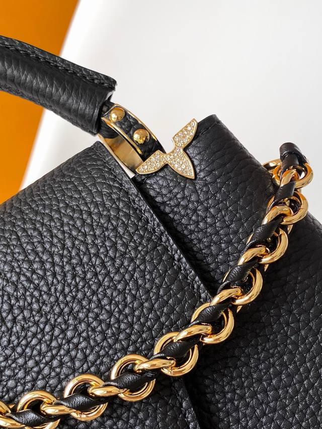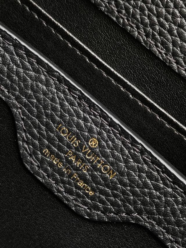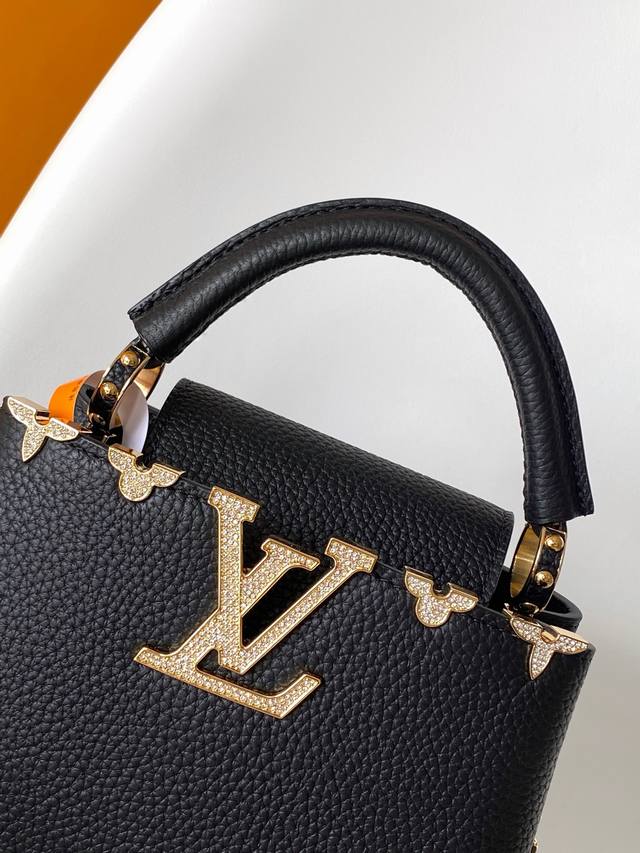 M24583 Metallic M24584 Red M24585 Black This Capucines Bb bag features a Monogram flower depicted in a shimmering shell, elegantly framed by the jewel-like Lv initials, embodying Louis Vuitton's signature feminine style. A top handle and detachable slim shoulder strap offer versatile carrying options.
