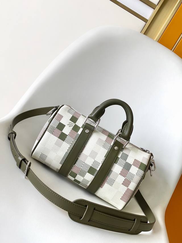 Dynamic Chip Top-Tier Original M00105 Gradient Pattern Pillow Bag. This Keepall 25 handbag is crafted from Monogram Eclipse Reverse canvas, showcasing an elegant reinterpretation of Louis Vuitton's classic pattern. Reinforced straps and a leather nameplate continue the iconic elements of the Keepall series, while a zipper closure ensures the safe carrying of personal belongings. Dimensions: 25.0 x 15.0 x 11.0 cm (Length x Height x Width).