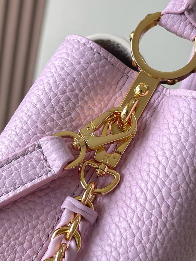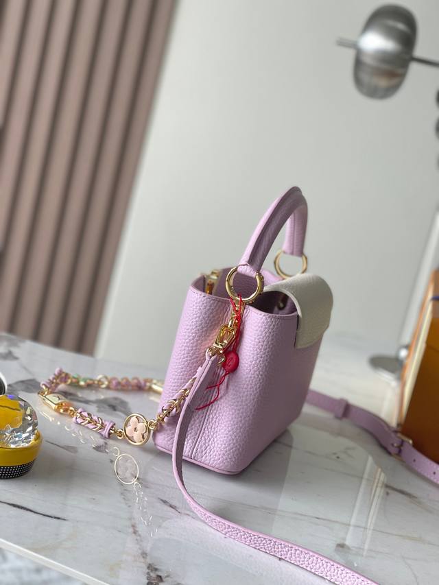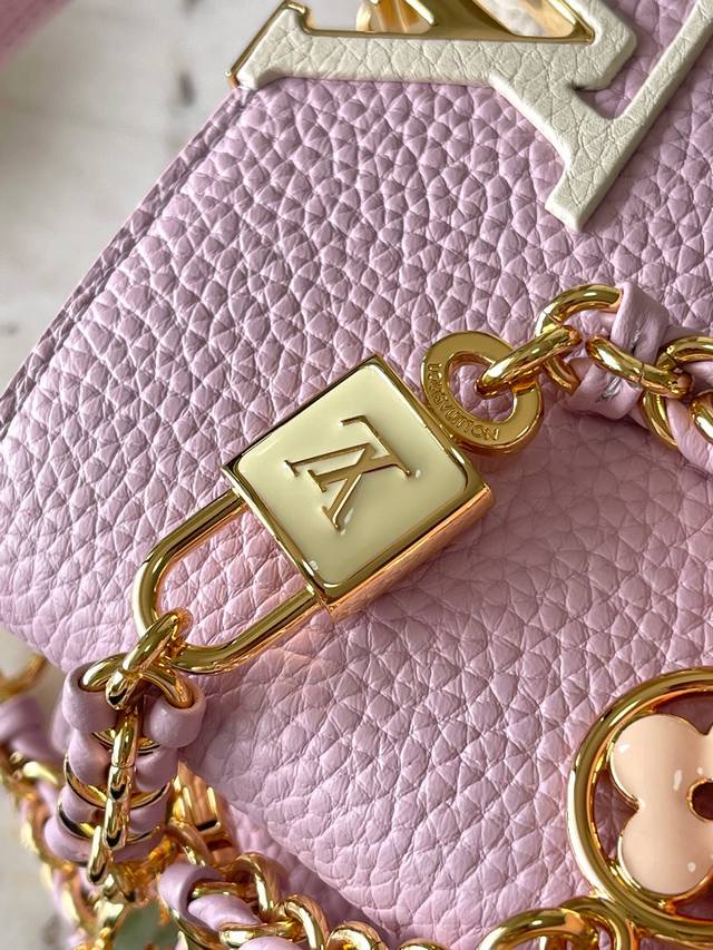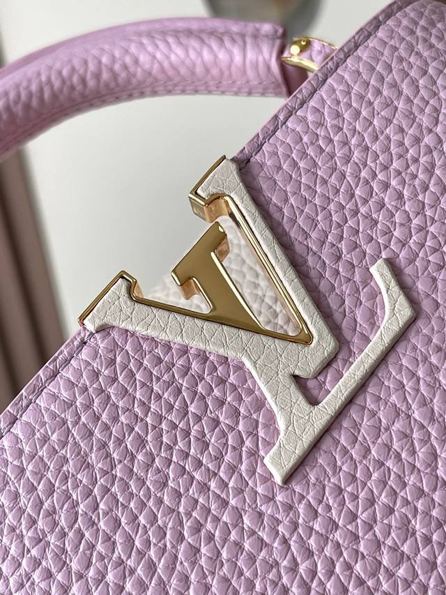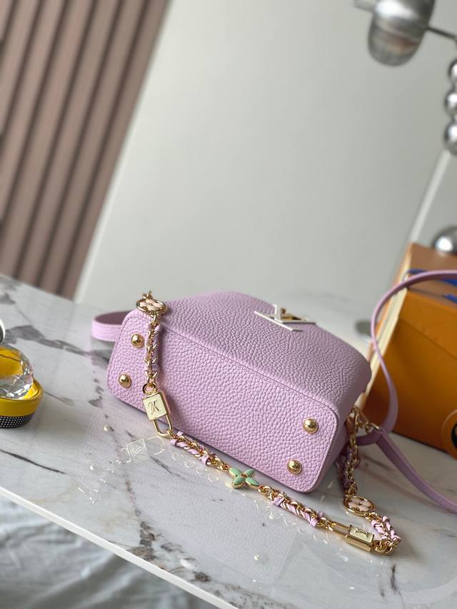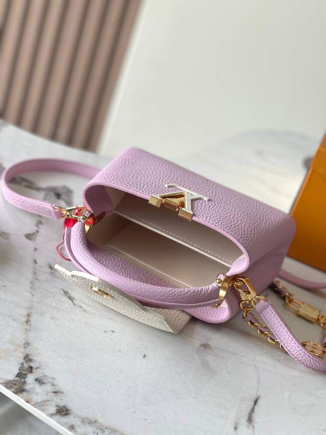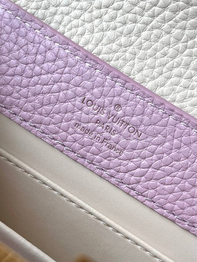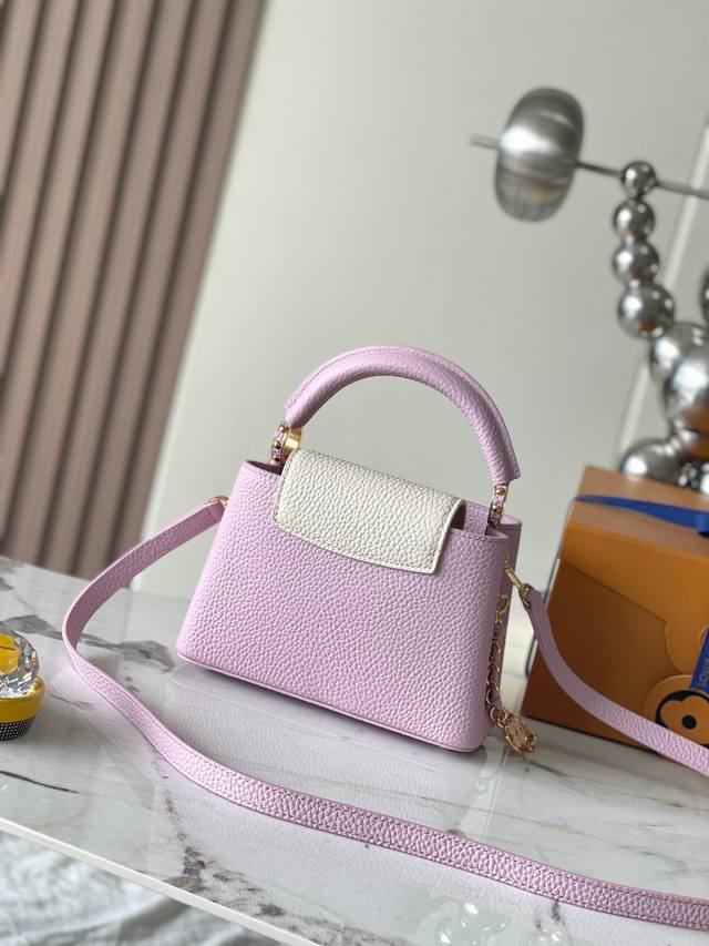 Dynamic Chip Version Premium Original Leather M23951 Black with White Gold Upgraded Hardware Capucines Mini Handbag Ddd. Crafted from full-grain Taurillon leather with ostrich leather details, this bag embodies understated luxury. The iconic LV signature, crafted from lustrous mother-of-pearl, adds a subtle sheen to the piece. The bag's compact size masks its actual capacity: it will hold two smartphones, a long wallet, and other essentials. Dimensions: 21 x 14 x 8 cm DDD