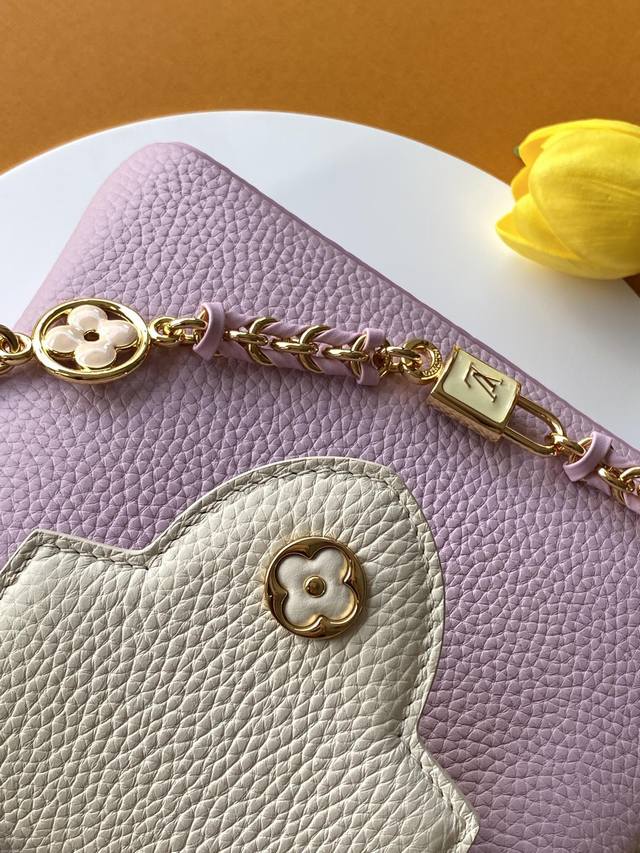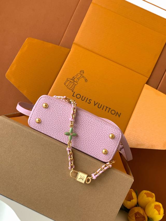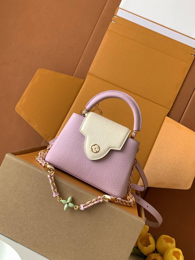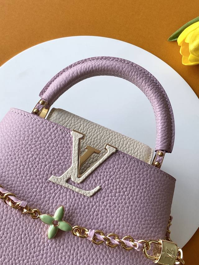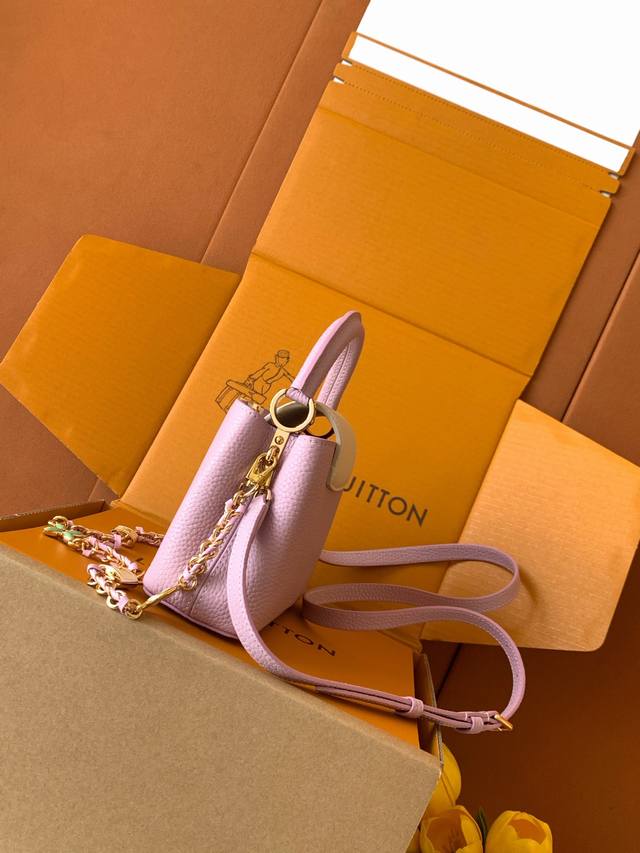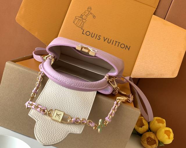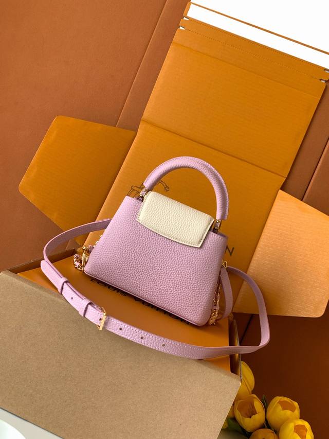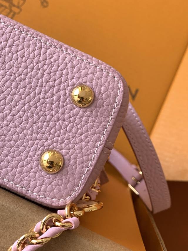 Exclusive Custom Boutique Grade Premium All-Steel Hardware 163C Chip Version Imported Cowhide M23951 Deep Pink Purple with Pearl White Gold Capucines Mini Handbag Ddd. Crafted from full-grain Taurillon imported leather and complemented with ostrich leather details, this bag embodies quiet luxury. The iconic LV signature, crafted from lustrous mother-of-pearl, adds a subtle sheen to the piece. The bag's compact size masks its actual capacity: it will hold two smartphones, a long wallet, and other essentials. Dimensions: 21 x 14 x 8 cm DDD